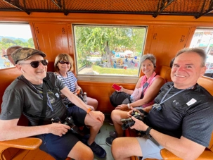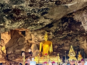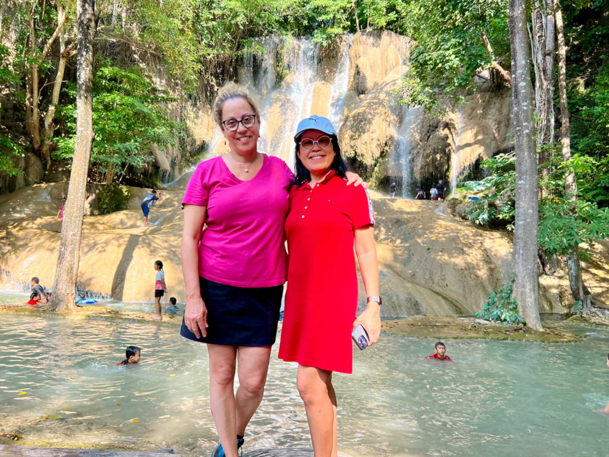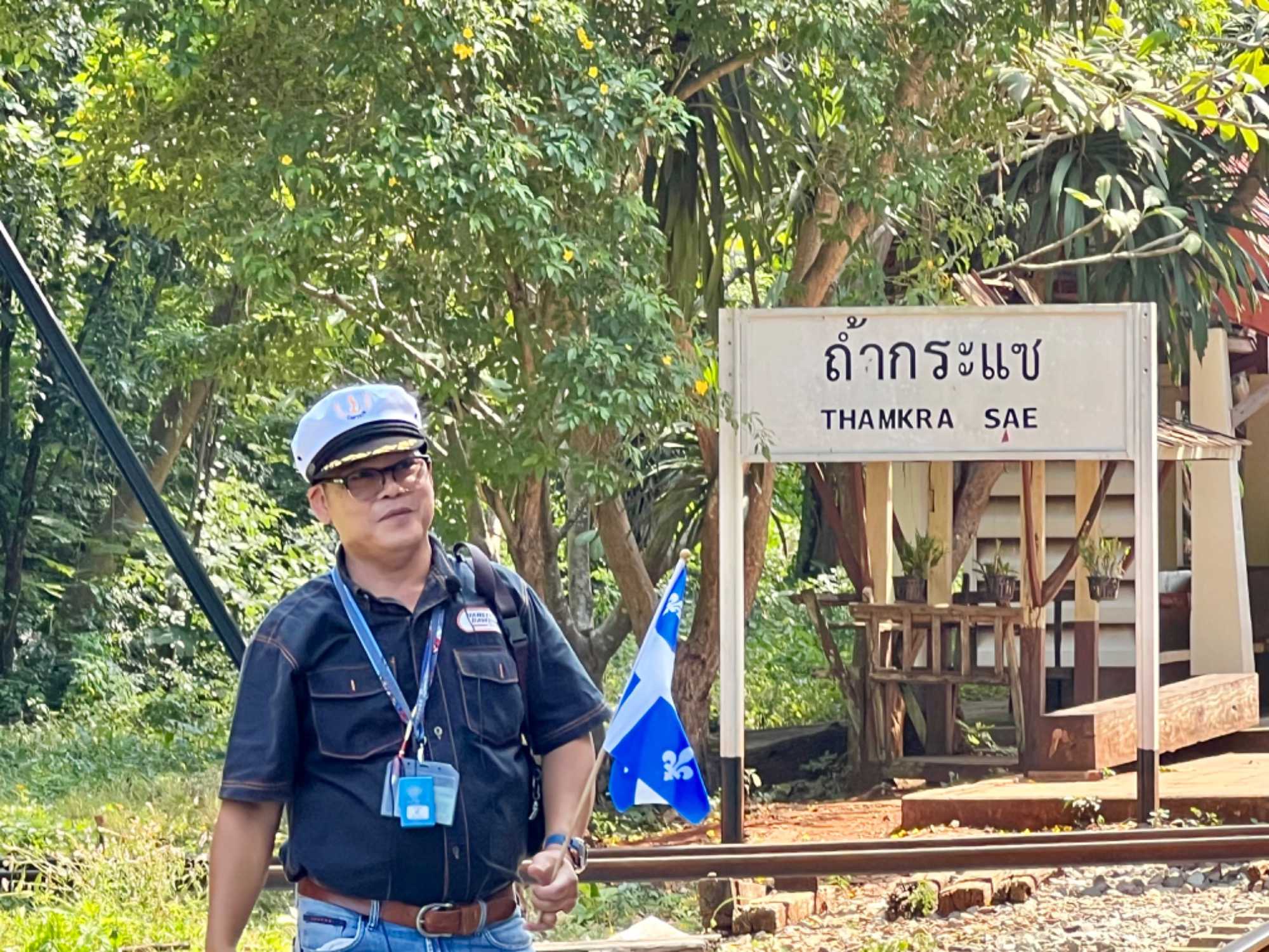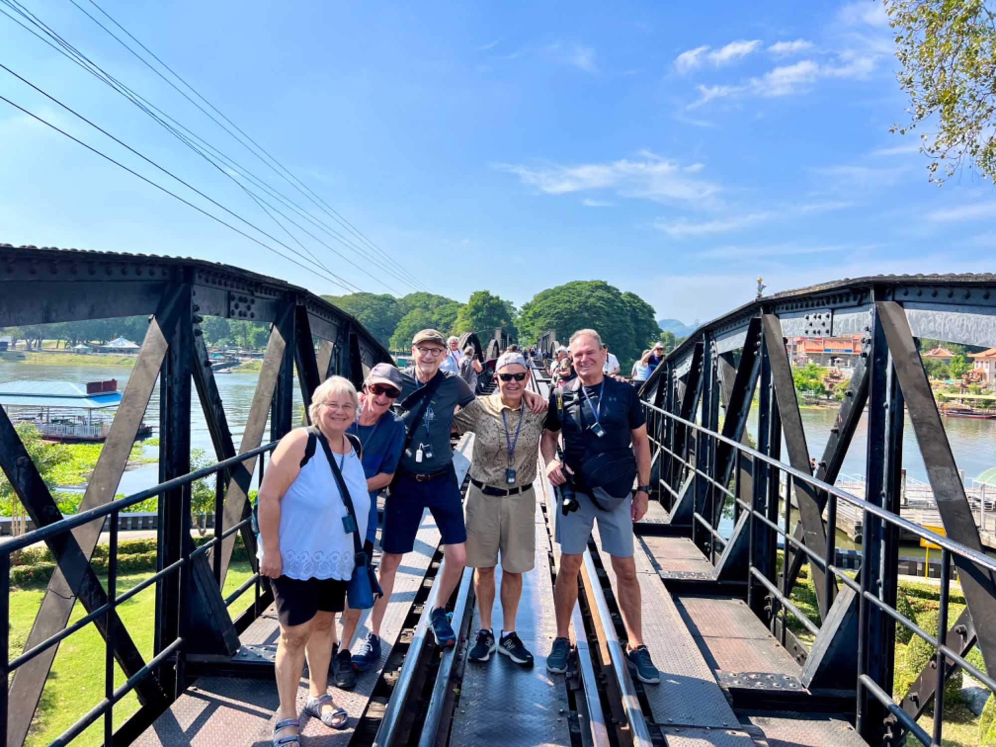Je peux vous confirmer que ce fût une superbe nuit tranquille dans un calme surnaturel avec, comme bruit de fond, que la nature et le clapoti des vagues sur nos maisons. Une fois tous debout, un déjeuner nous est servi dans un cadre bien spécial. Nous sommes entourés de splendides paysages de la rivière Kwaï avec tout autour de hautes montagnes recouvertes d’une légère couche de brouillard qui s’agrippe aux rochers, surtout le matin. On oublie la grande ville de Bangkok très facilement et l’image de la Thaïlande que nous avons dans nos rêves prend forme. Après le petit-déjeuner, tous bien reposés, nous étions prêts à reprendre la pirogue pour rejoindre notre autobus stationné en aval de la rivière Kwaï. Nous prenons place un groupe de 10 à la fois dans la pirogue. Nous devenons de plus en plus agiles ! La montée et la descente de ces pirogues se fait de plus en plus facilement…enfin pour la majorité... On met très certainement l’élégance de côté pour laisser place à la sécurité!