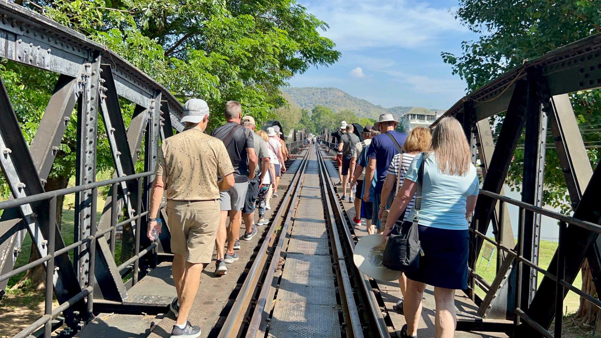 Moment émouvant que de le voir en vrai et de marcher dessus, ce que nous avons fait, cela prendra tout son sens. Nous ferons quelques photos pour commémorer ce moment historique et nous partirons ensuite prendre le train d'une durée d'une heure quinze pour une randonnée en passant dessus bien entendu. Les paysages sont grandioses avec tout ces champs de manioc, maïs, décor de campagne et de montagnes. Notre petit tour terminé, nous marcherons vers ce pont de la mort comme on l'a appelé pour observer sa stucture et le précipice tout en bas, la gare étant toutn juste à côté. On comprend les nombreuses pertes de vie d'antan quand on s'imgaine la jungle et rien autour de ce que l'on voit aujourd'hui. Par la suite, nous nous rendrons en bus vers un petit restaurant tout mignon pour le diner. Cusine thaï succulente et savoureuse encore une fois.