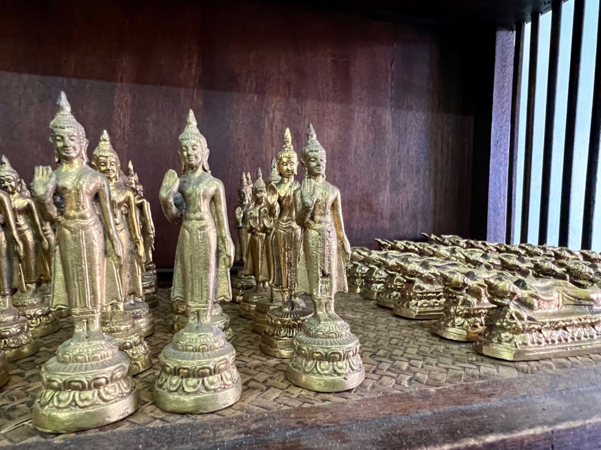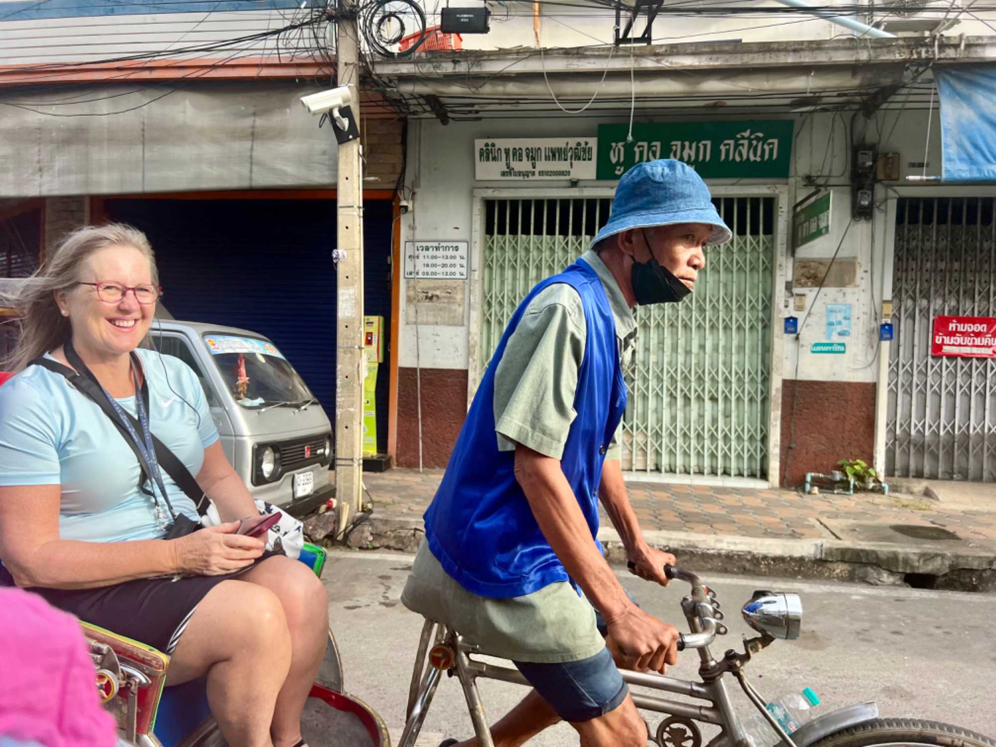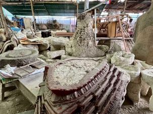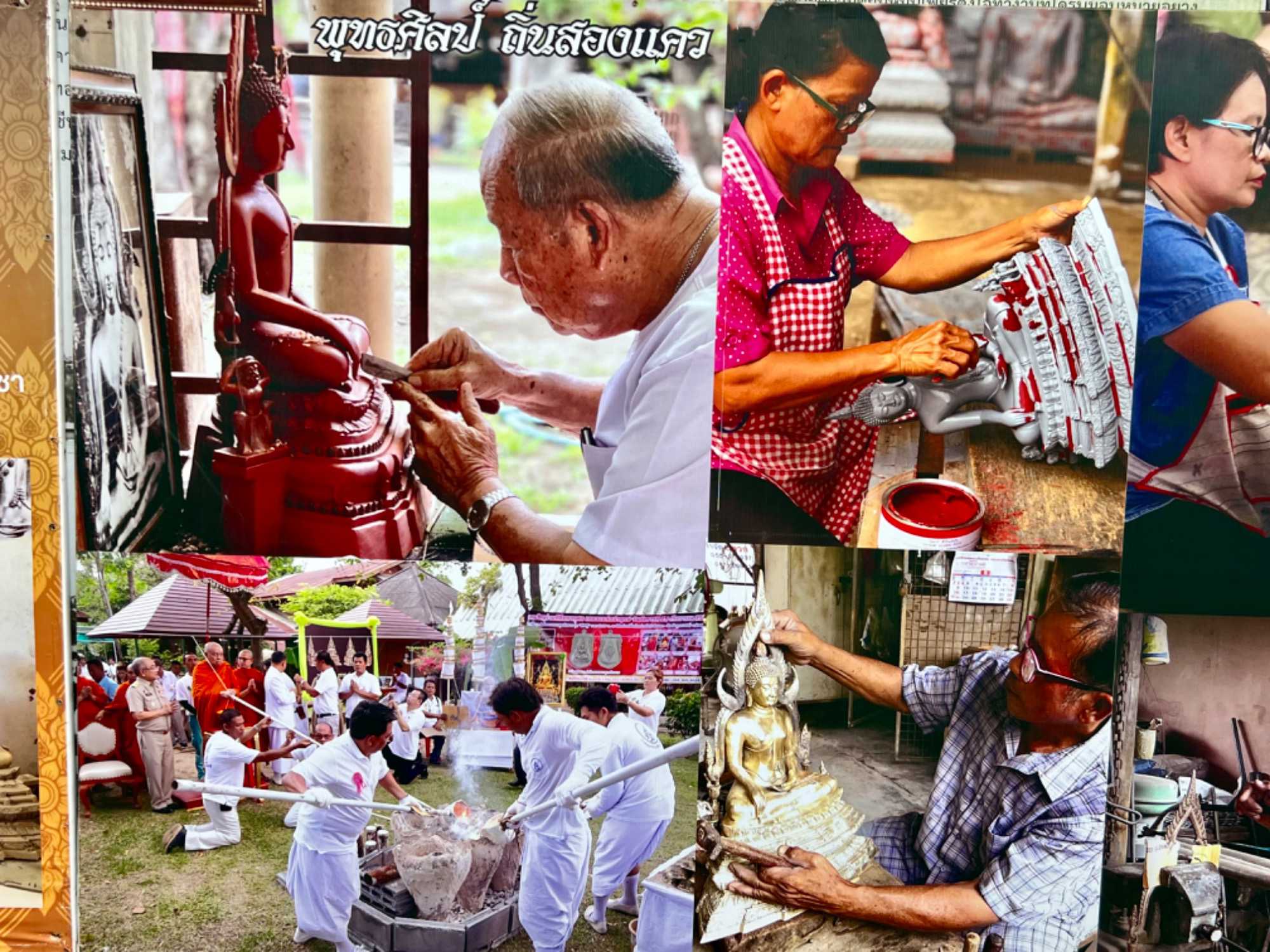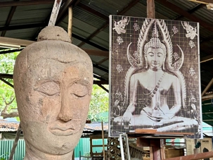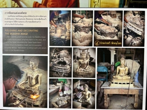 Un peu plus loin, nous attendait 23 cyclo-pousse pour faire une belle promenade. Quelle randonnée! Imaginez ces 23 cyclo-pousse qui se suivent à la que leu-leu dans la ville. Je peux vous dire qu'on ne passe pas inaperçu. Un petite traversée dans le marché local où pleins de variétés de toutes sortes y sont encore une fois. On se promène un peu à pieds pour mieux vivre ce moment et pouvoir entrer en contact avec les marchands. Ensuite, on reprend notre cyclo-pousse. Si on ne reconnaît pas notre chauffeur à notre arrivée, et bien lui nous retrouve. On repart donc de plus belle à travers la ville et ceux-ci vont nous laisser à l'entrée d'une fabrication de statues de bouddha, de type artisanale. Wow! que de travail il y a et en plus, on les fabrique un à la fois. Cette entreprise fonctionne de génération en génération et est encore très active jusqu'à ce jour. Elle a vu le jour en 1968 et jouit d'une solide réputation. il faut dire que la demande en statue de bouddhas ne faiblit jamais. Certains font donc après la visite, quelques achats dont Suzanne qui rêvait de trouver son Bouddha dès notre arrivée en Thaïlande et bien c'est chose faite.