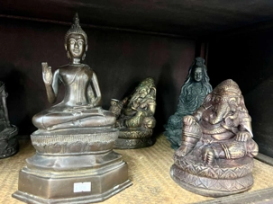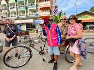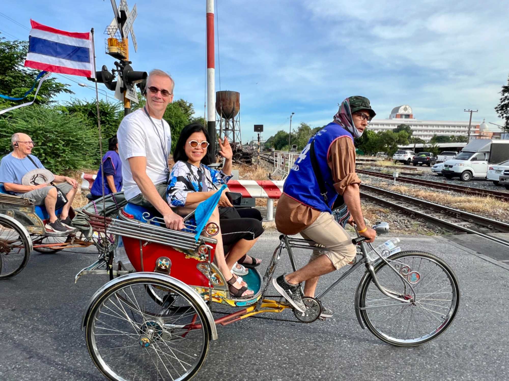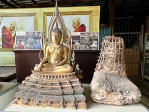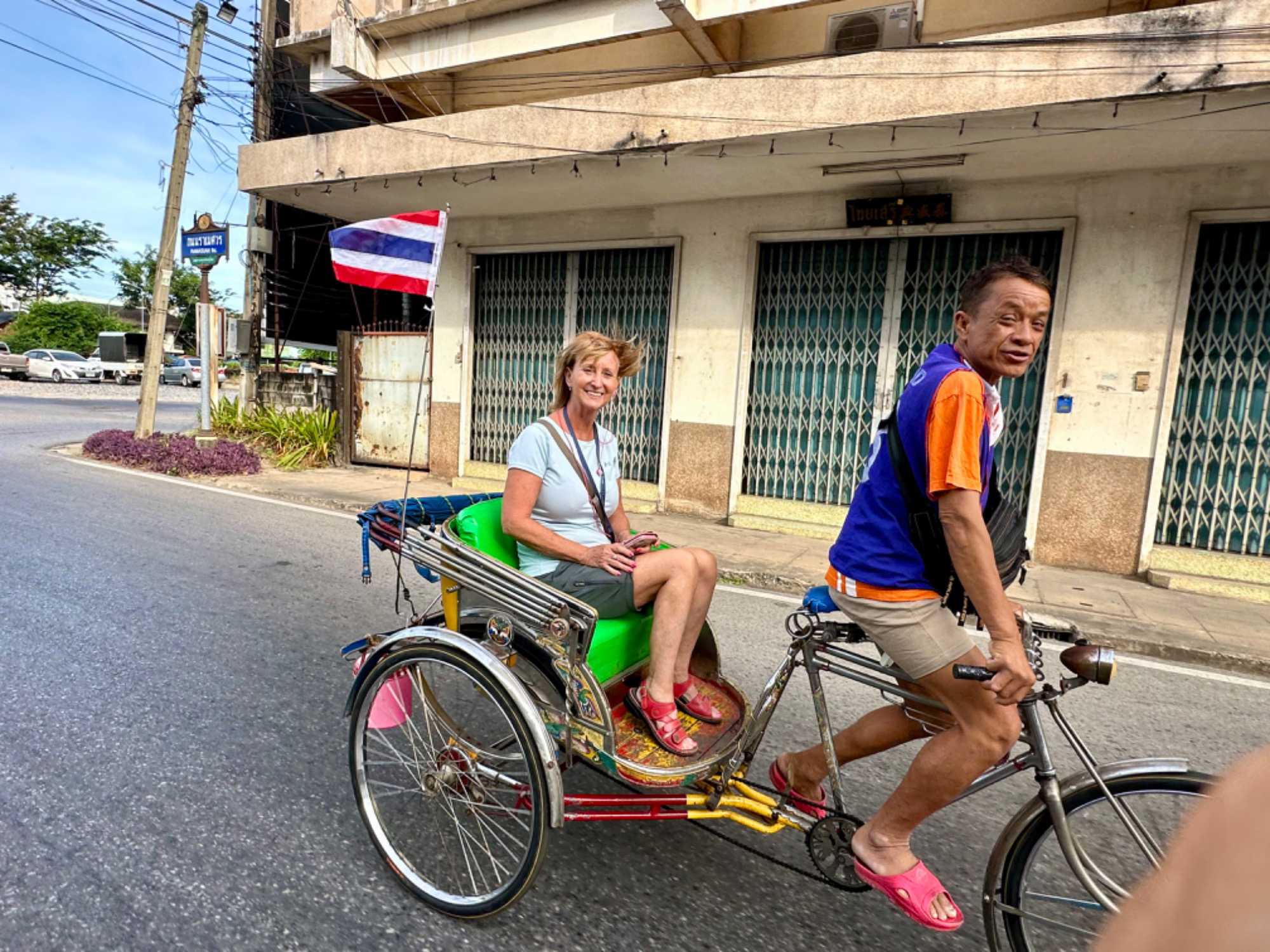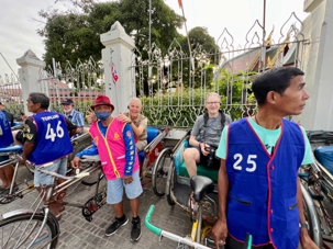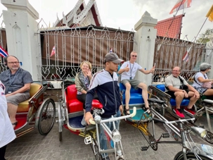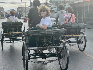 Un peu plus loin, nous attendait 23 cyclo-pousse pour faire une belle promenade. Quelle randonnée! Imaginez ces 23 cyclo-pousse qui se suivent à la que leu-leu dans la ville. Je peux vous dire qu'on ne passe pas inaperçu. Un petite traversée dans le marché local où pleins de variétés de toutes sortes y sont encore une fois. On se promène un peu à pieds pour mieux vivre ce moment et pouvoir entrer en contact avec les marchands. Ensuite, on reprend notre cyclo-pousse. Si on ne reconnaît pas notre chauffeur à notre arrivée, et bien lui nous retrouve. On repart donc de plus belle à travers la ville et ceux-ci vont nous laisser à l'entrée d'une fabrication de statues de bouddha, de type artisanale. Wow! que de travail il y a et en plus, on les fabrique un à la fois. Cette entreprise fonctionne de génération en génération et est encore très active jusqu'à ce jour. Elle a vu le jour en 1968 et jouit d'une solide réputation. il faut dire que la demande en statue de bouddhas ne faiblit jamais. Certains font donc après la visite, quelques achats dont Suzanne qui rêvait de trouver son Bouddha dès notre arrivée en Thaïlande et bien c'est chose faite.