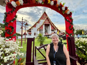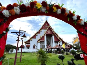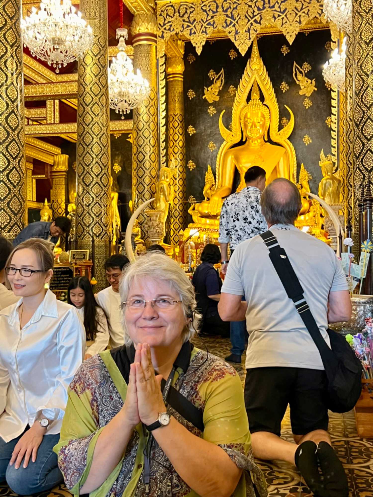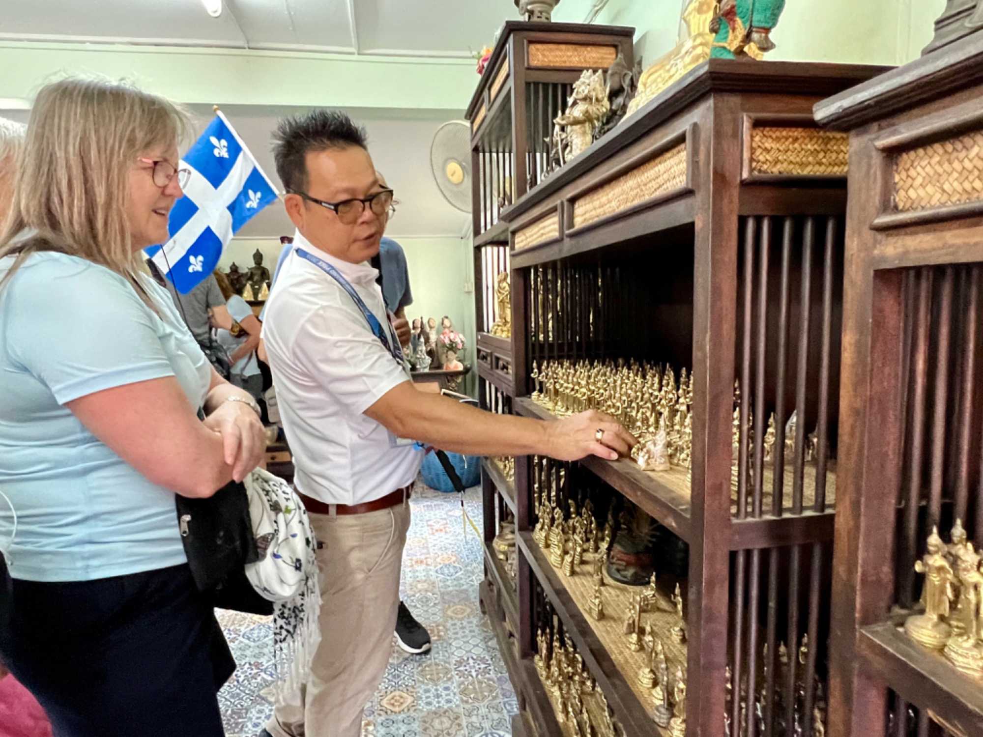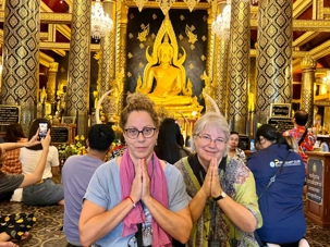 Ce matin, après un bon déjeuner, nous quittons vers les 7h00 pour aller dans la ville de Phitsanulok. Nous partons en bus vers le temple Wat Phra Sri Rattana. Une fois débarqué, sur notre chemin, Lek croise un moine et veut lui faire des offrandes et par le fait même, nous montrer à nous, ce que les thaïlandais spirituellement font. En fait les moines vivent de charité donc de dons en argent et de nourriture qu'on leur offre. On leur remets aussi des fleurs. Ils sont très vénérés ici et on leur remets donc des offrandes, à genoux, pieds nus devant eux. En échange, des bénédictions et des prières. Ce fut un moment très touchant et émouvant de voir notre belle Lek vivre ceci. Ensuite, nous sommes entrés dans le temple où un gigantesque Bouddha est au centre du temple. La pièce est magnifique. On en profite pour admirer, s'agenouiller un peu devant lui et faire quelques photos. En passant, peut-être avez-vous remarqué que sur les photos, certaines d'entres-nous portons parfois une grande jupe, et bien c'est que dans les temples, comme c'est un lieu sacré, on ne peut se présenter avec des shorts ou une petite jupe ,ainsi qu'avec des chandails sans manches(camisoles). On nous demande donc de nous recouvrir, ce que l'on fait avec le plus grands des respects