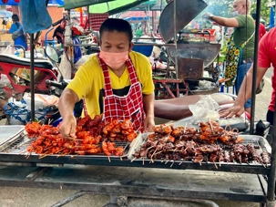 En sortant du restaurant ce midi, nous nous arrêtons à un kiosque installé près de stationnement là où un drôle de personnage nous interpelle. Celui-ci vend des savons qui ont été au préalable sculptés dans un bloc pour en ressortir en fleurs de toutes sortes. Vraiment beau. Je pense que ce sera plutôt une belle décoration dans une salle de bain que l'utilisation lui-même. Trop beau pour s'en servir mais ça s'en vraiement bon. Vois les photos. Encore de l'art thaï!