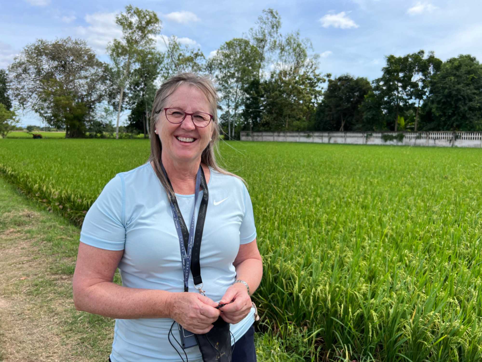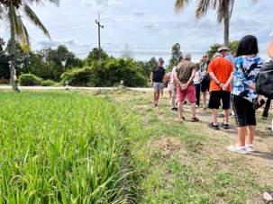 Nous reprenons encore une fois notre autobus car il faut continuer à rouler un peu si on veut se rendre à Ayutthaya ce soir. Sur notre chemin, nous nous arrêtons en pleine campagne pour y voir les champs de riz. Dans un on vient de faire, il y quelques jours, du repiquage de plants de riz et dans l'autre, le riz est déjà planté depuis quelques temps. On peut dans celui-là y voir les grains sur une tige, un peu comme les grains de blé chez nous. Vraiment intéressant encore une fois de voir et vivre tout ça.
