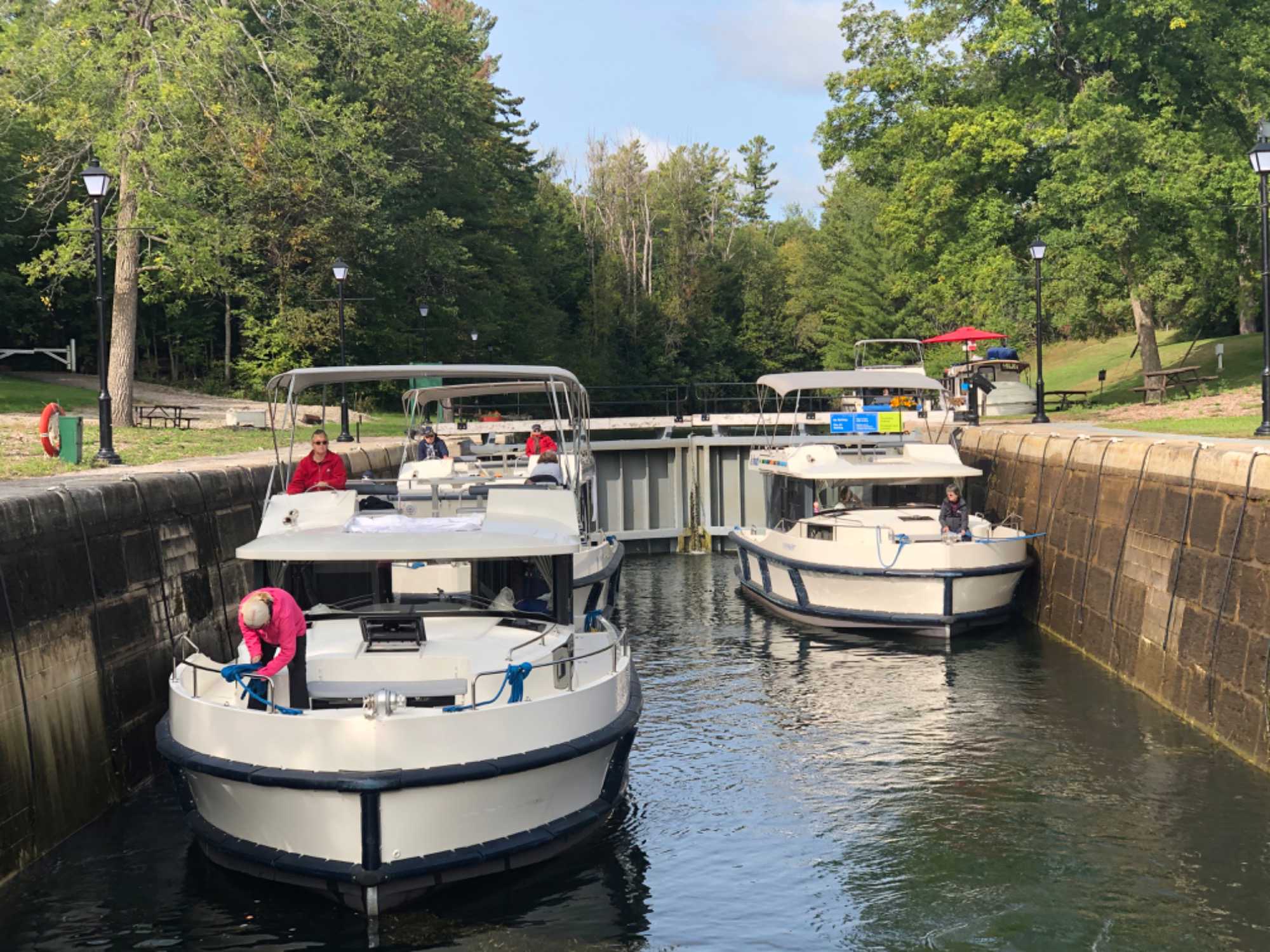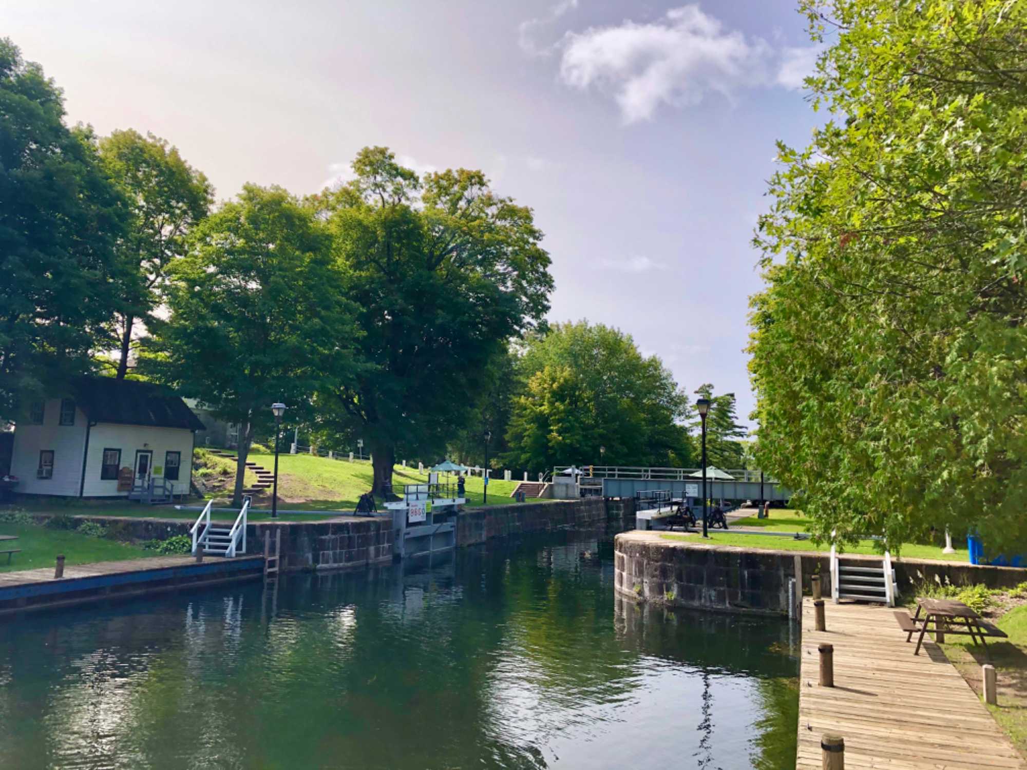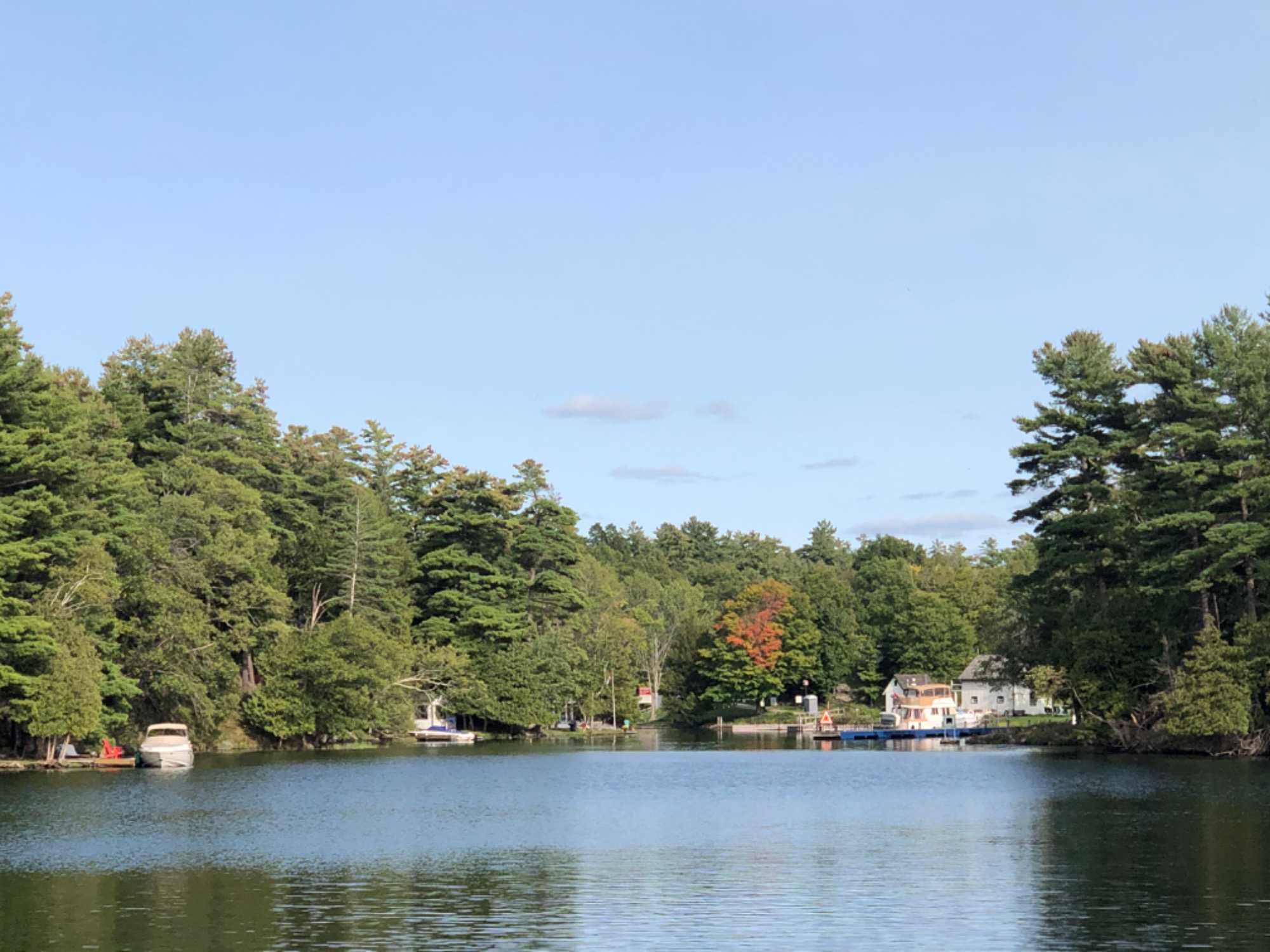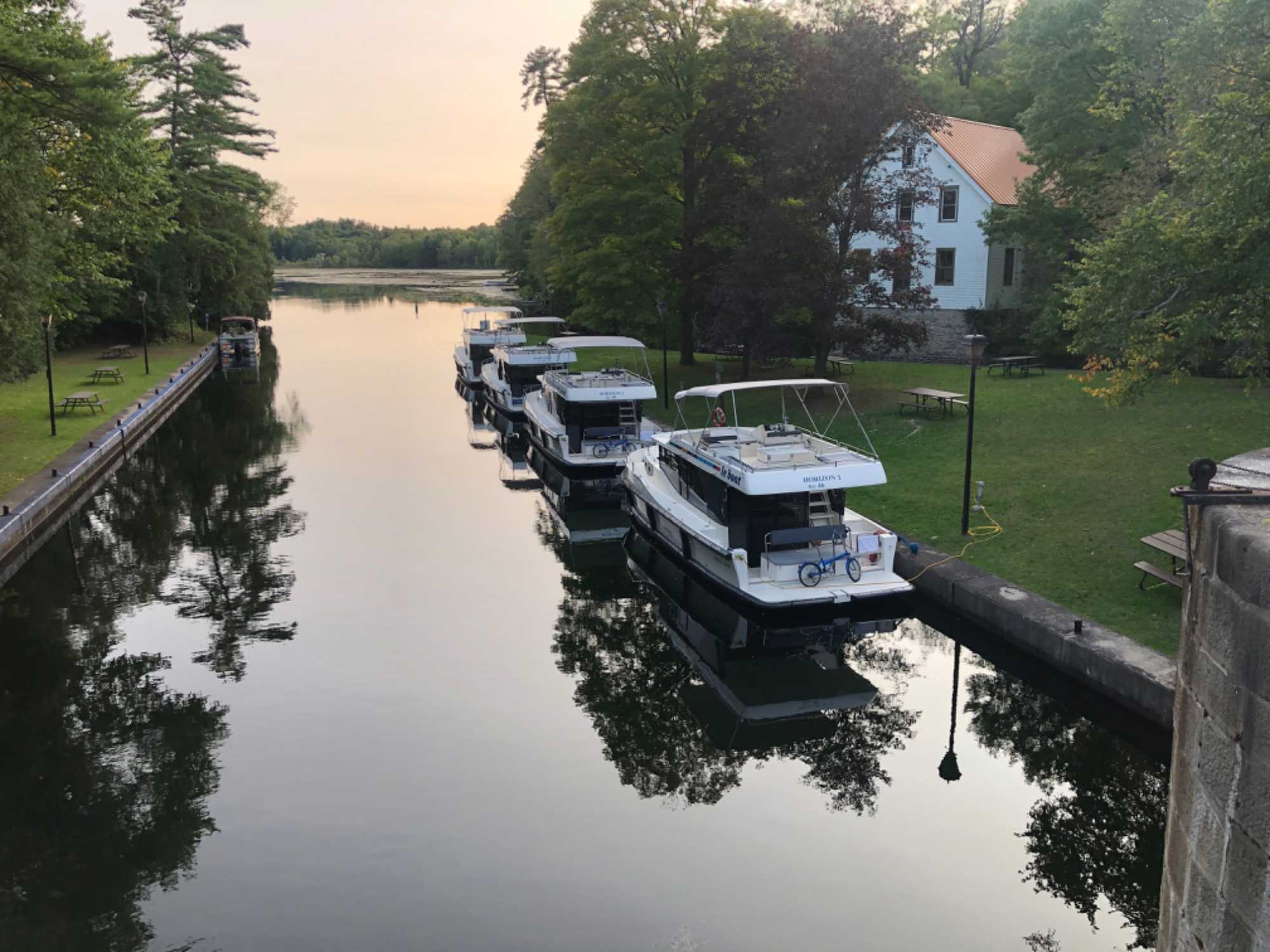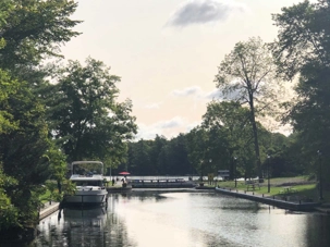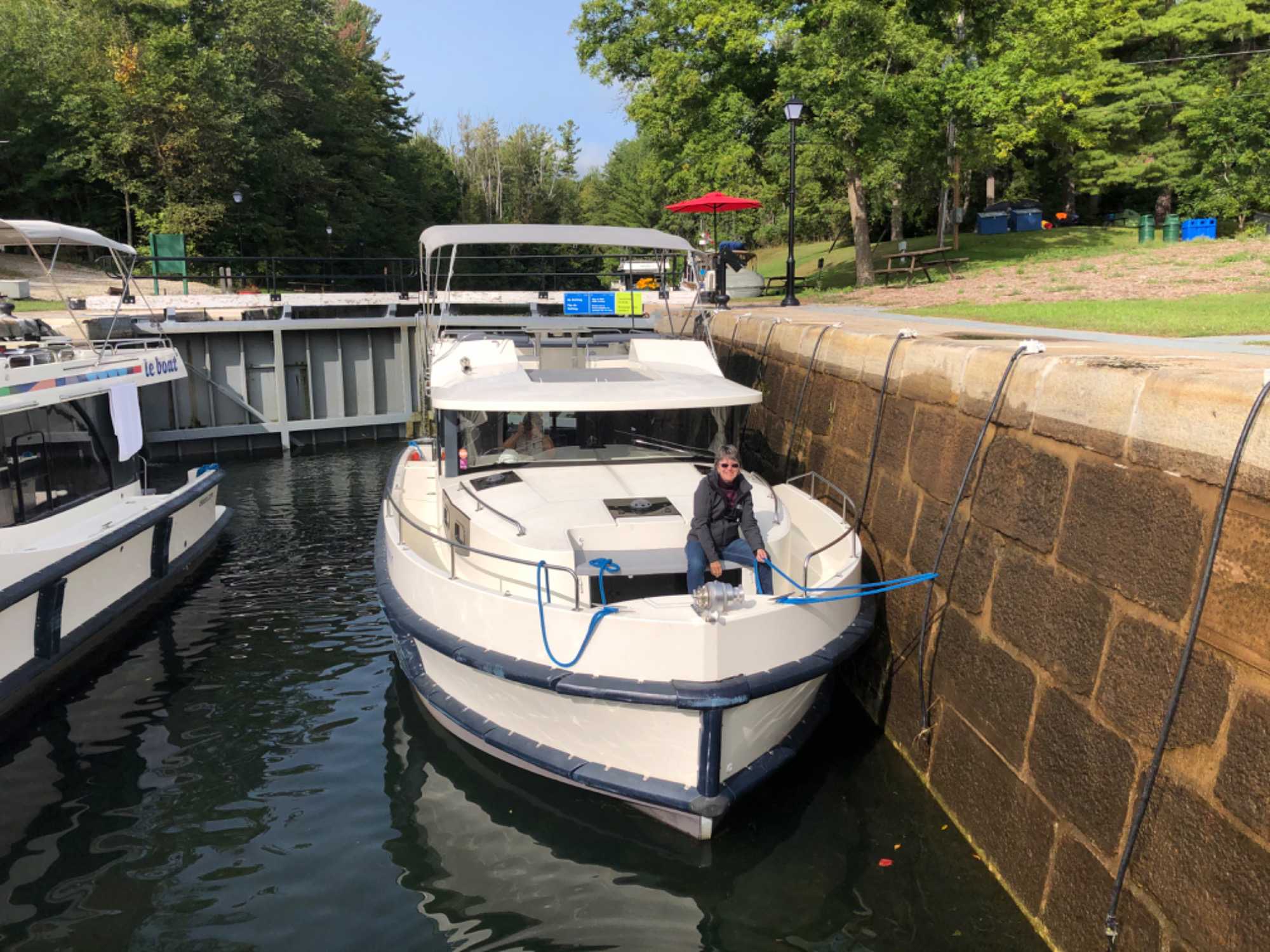 Nous quittons donc après avoir pris notre petit déjeuner dans chacun de nos navires et nous voilà prêts pour le départ de la journée. Bon les bouées rouges sont de quel côtés donc??? Et on doit vraiment y penser vite car on ne veut surtout pas faire de gaffes et se retrouver dans un endroit pour s’enliser ou pire frapper des roches…. La navigation est bien expliquée et Christian a sur son cellulaire le tracé du canal à suivre via un GPS c’est assez important puisque nous sommes le navire de tête. Les cartes marines sont bien faites donc tout se déroule en douceur. Que c’est beau aujourd’hui! Les paysages et le canal à suivre nous fait naviguer dans de jolis passages dont certains sont bien étroits. Mais comme c’est agréable de serpenter et de juste suivre les bouées. Nous filons sur le Rideau tout tranquillement car souvent la profondeur du canal est de seulement 5 pieds et nous avons un tirant d’eau de 3 pieds. Nous arrivons vers 11h30 à l’écluse de Chaffey ou nous somme attendus par David pour notre lunch à un endroit iconique de la région, le restaurant du Opinicon Resort. Qu’il est beau cet hôtel datant de plus de 200 ans! Oui tout un héritage historique que nous découvrons à ce resort.