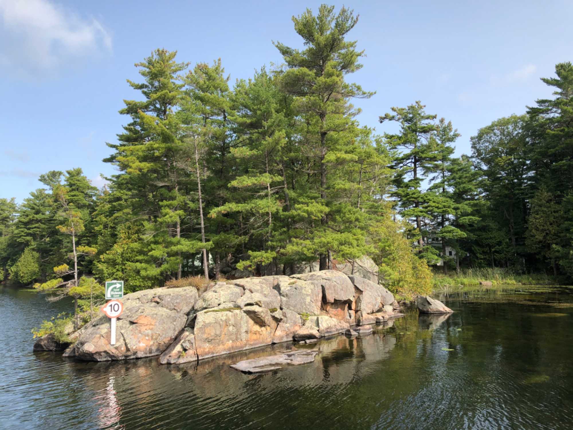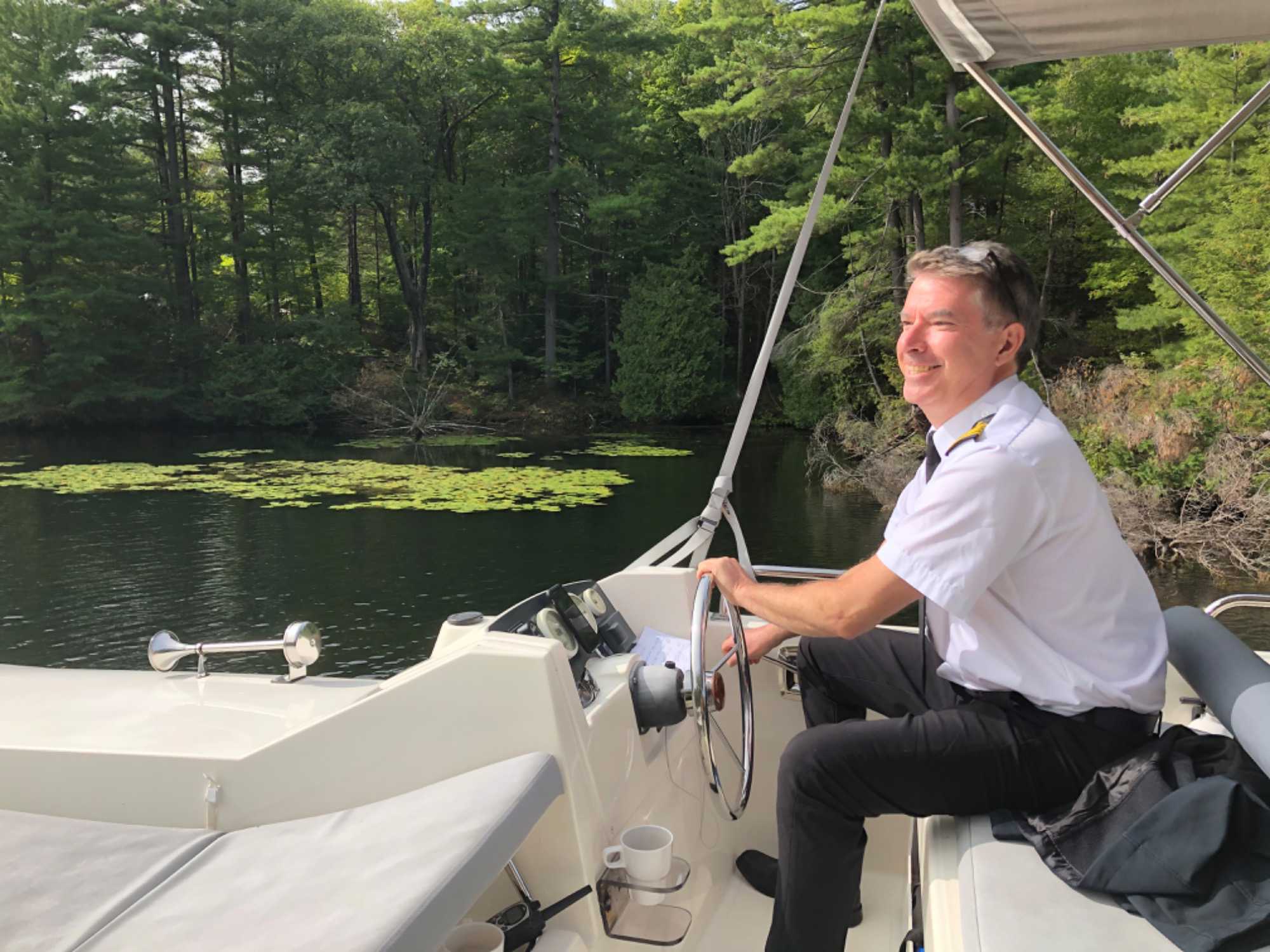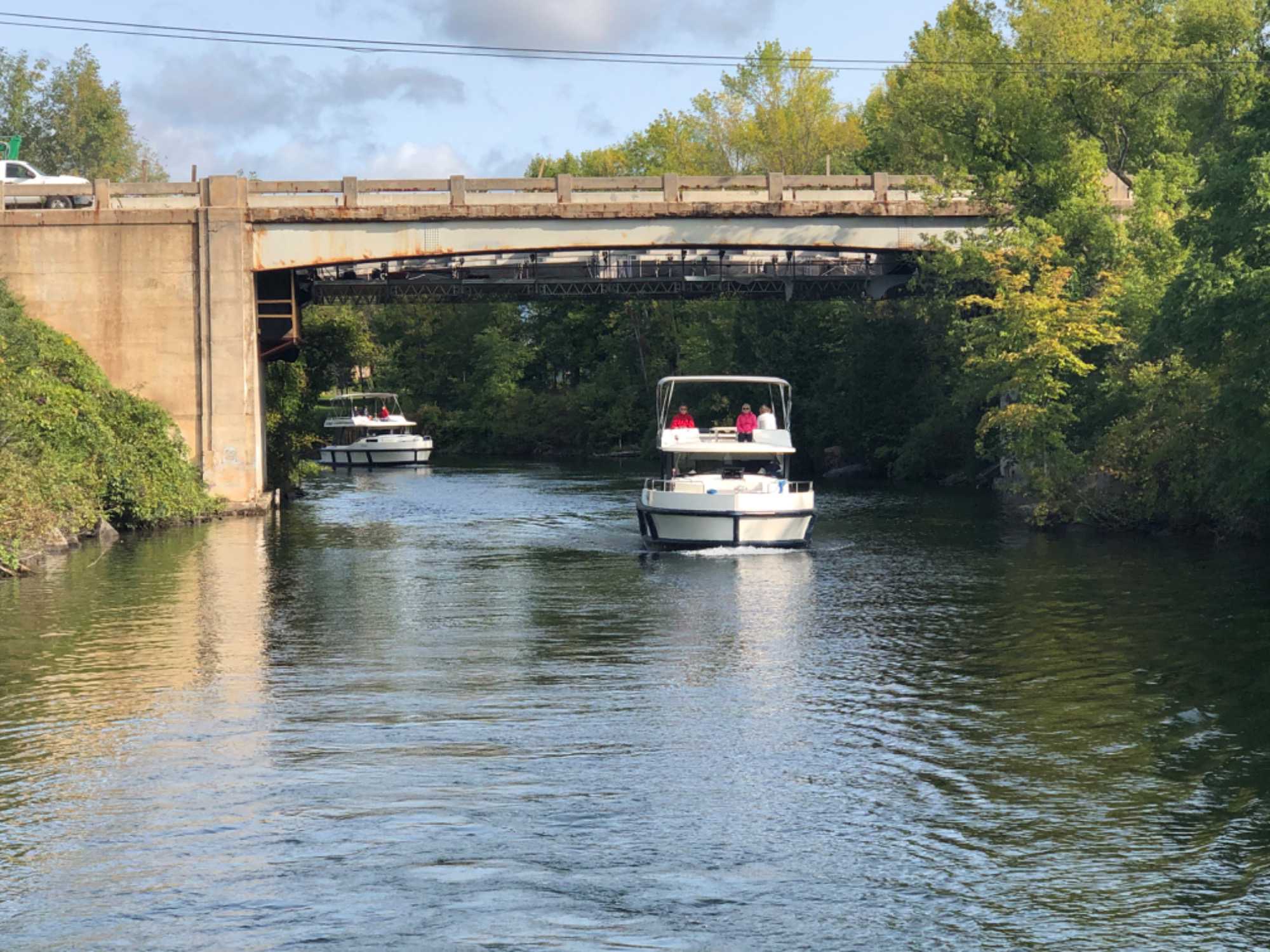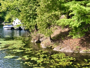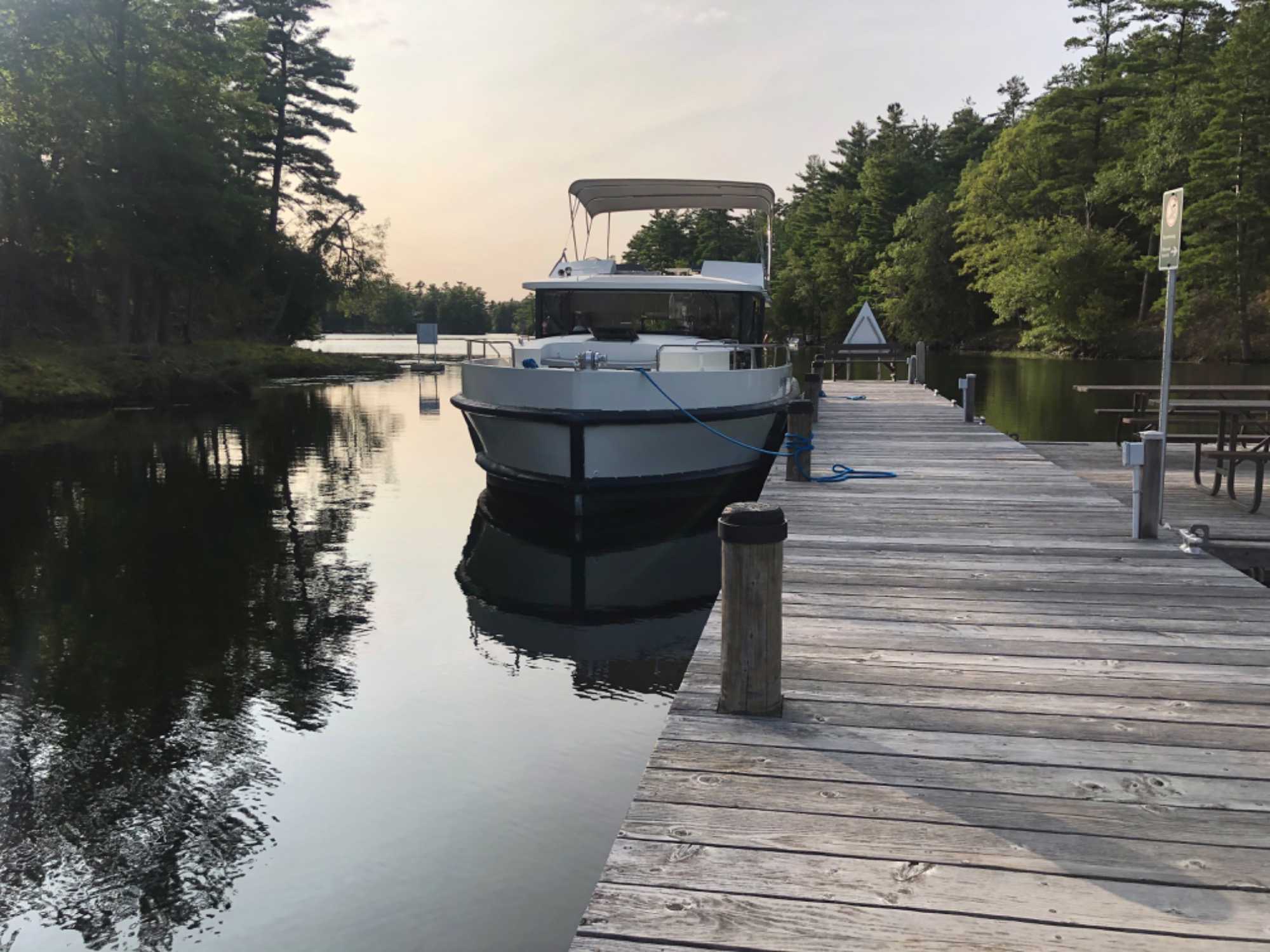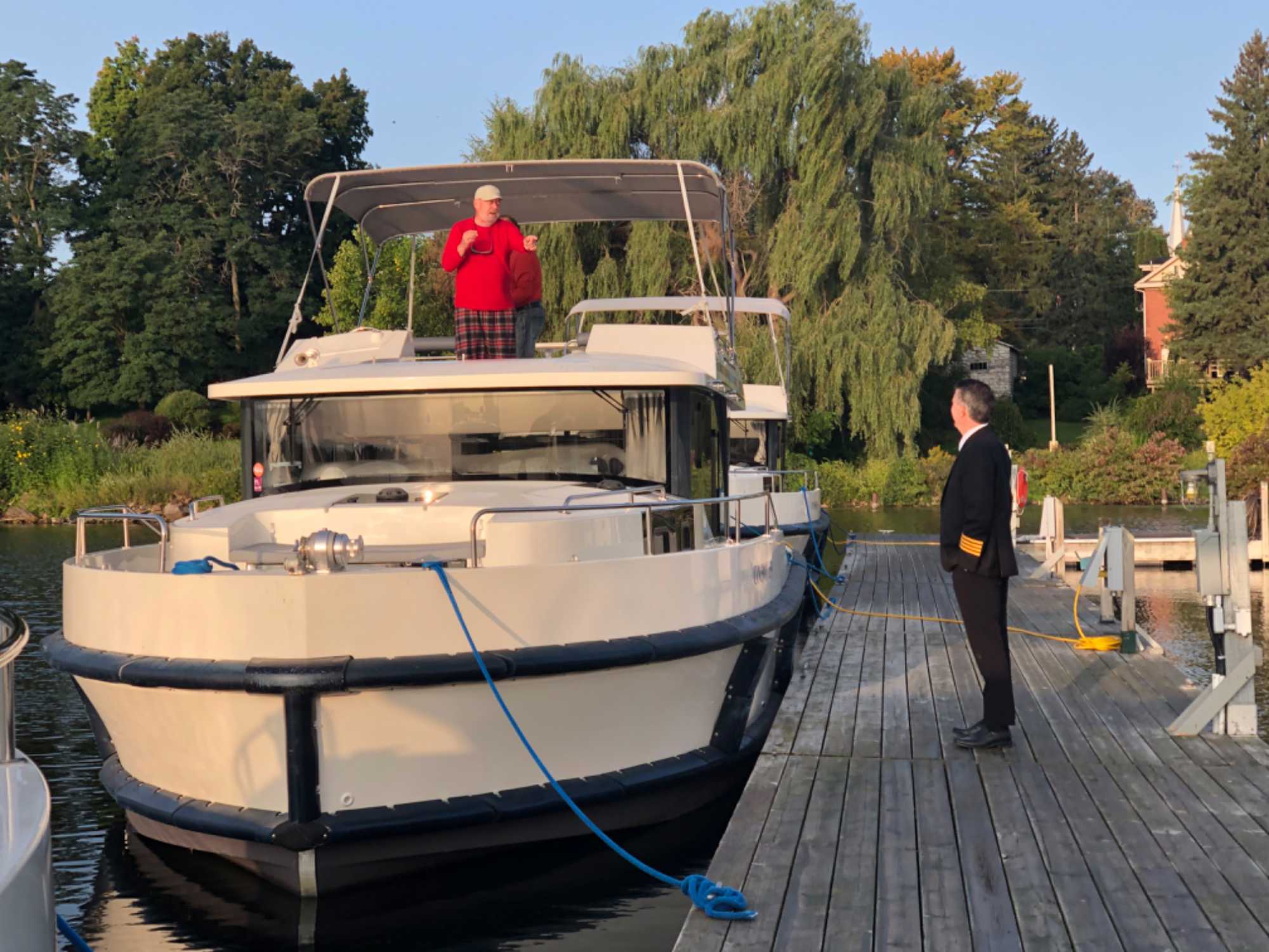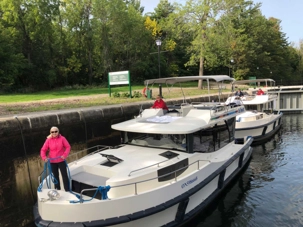 Nous quittons donc après avoir pris notre petit déjeuner dans chacun de nos navires et nous voilà prêts pour le départ de la journée. Bon les bouées rouges sont de quel côtés donc??? Et on doit vraiment y penser vite car on ne veut surtout pas faire de gaffes et se retrouver dans un endroit pour s’enliser ou pire frapper des roches…. La navigation est bien expliquée et Christian a sur son cellulaire le tracé du canal à suivre via un GPS c’est assez important puisque nous sommes le navire de tête. Les cartes marines sont bien faites donc tout se déroule en douceur. Que c’est beau aujourd’hui! Les paysages et le canal à suivre nous fait naviguer dans de jolis passages dont certains sont bien étroits. Mais comme c’est agréable de serpenter et de juste suivre les bouées. Nous filons sur le Rideau tout tranquillement car souvent la profondeur du canal est de seulement 5 pieds et nous avons un tirant d’eau de 3 pieds. Nous arrivons vers 11h30 à l’écluse de Chaffey ou nous somme attendus par David pour notre lunch à un endroit iconique de la région, le restaurant du Opinicon Resort. Qu’il est beau cet hôtel datant de plus de 200 ans! Oui tout un héritage historique que nous découvrons à ce resort.