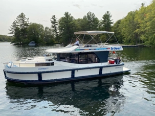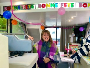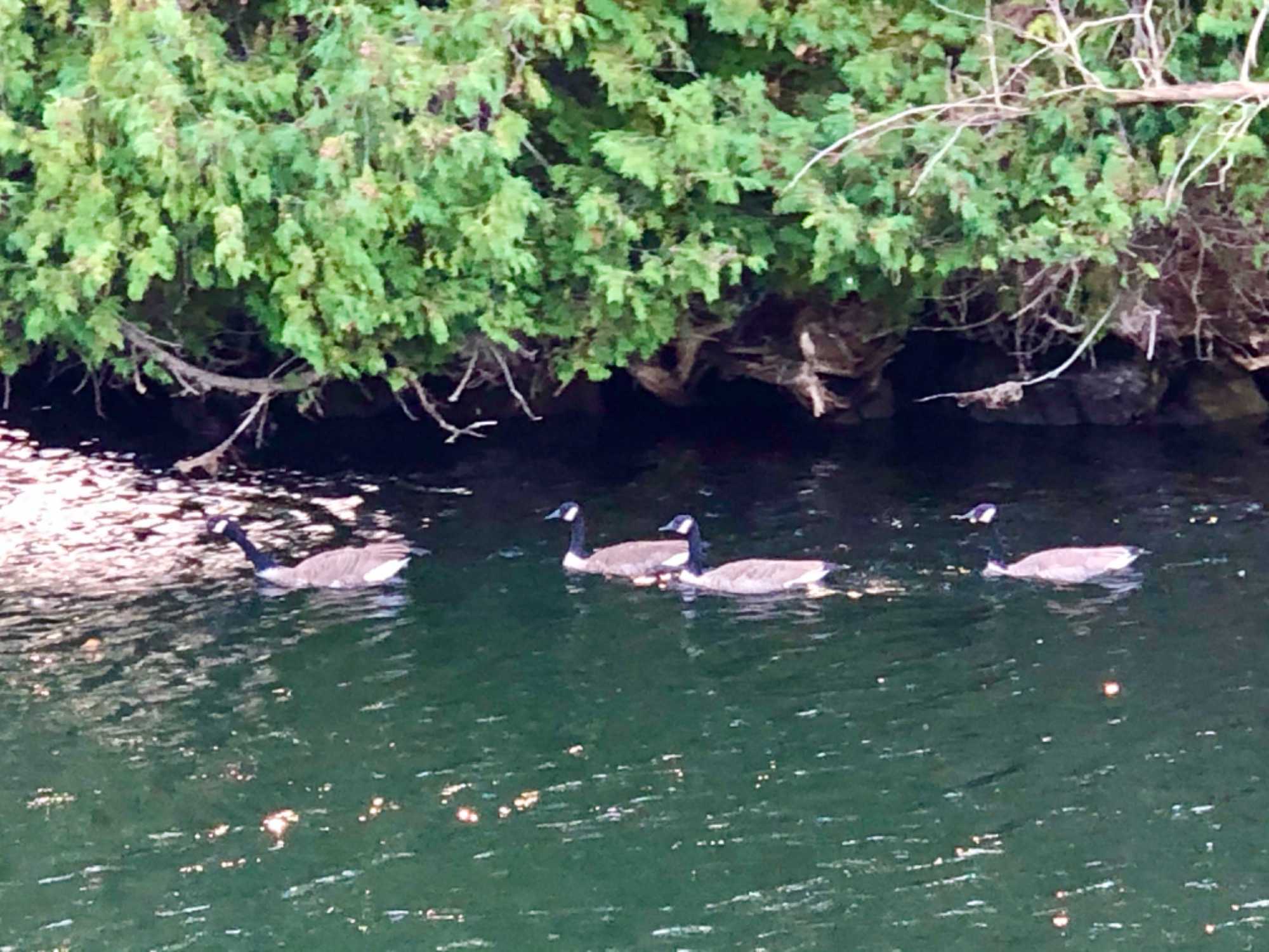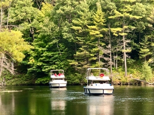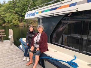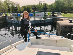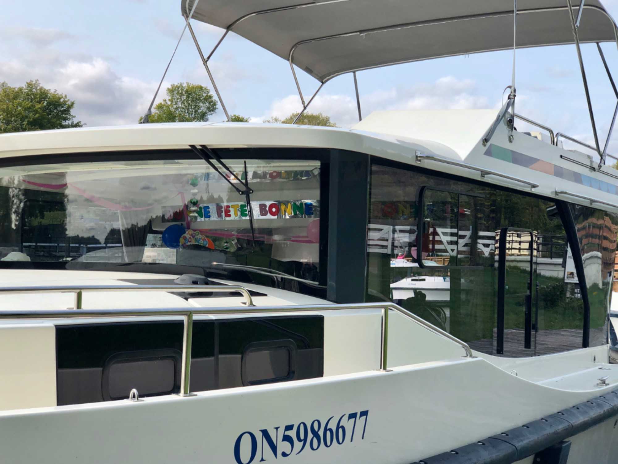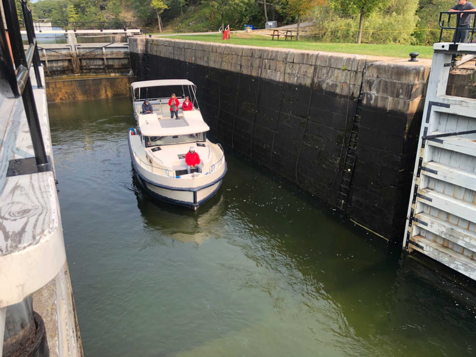 Une autre journée magnifique débute sur le Canal Rideau. Le Canal Rideau n'est pas juste un canal mais un amalgame de splendides lacs sauvages interreliés pour la navigation. Aujourd'hui nous avons débuté notre journée à notre rythme car on prépare nos propres petits déjeuners dans la cuisine très bien équipée du bateau. Pour ma part, j'ai un capitaine attentionné qui avait préparé un décor de fête car oui, aujourd'hui, je fête mon anniversaire sur l'eau. C'est bien joli et mon ami David m'avait laissé un paquet-cadeau: un superbe châle arrivé tout droit de Dublin. Il m'a bien réchauffé en ce matin plus frais sur le navire. Un bon petit déjeuner cuisiné par Christian et nous voilà partis pour la navigation jusqu'à l'écluse de Davis. Nous embarquons 2 bateaux car il y en avait déjà un en attente lors de notre arrivée. Nous avons donc décidé de nous séparer et de nous retrouver en bas de l'écluse. Nous repartons donc en sillonnant les courbes du canal Rideau.