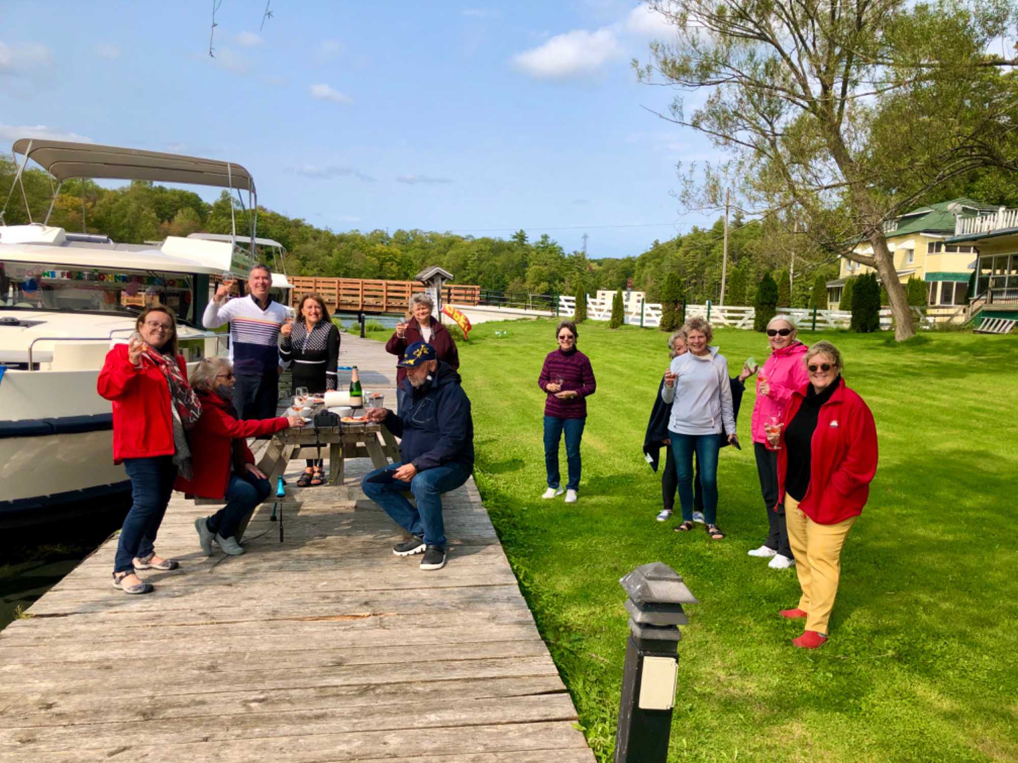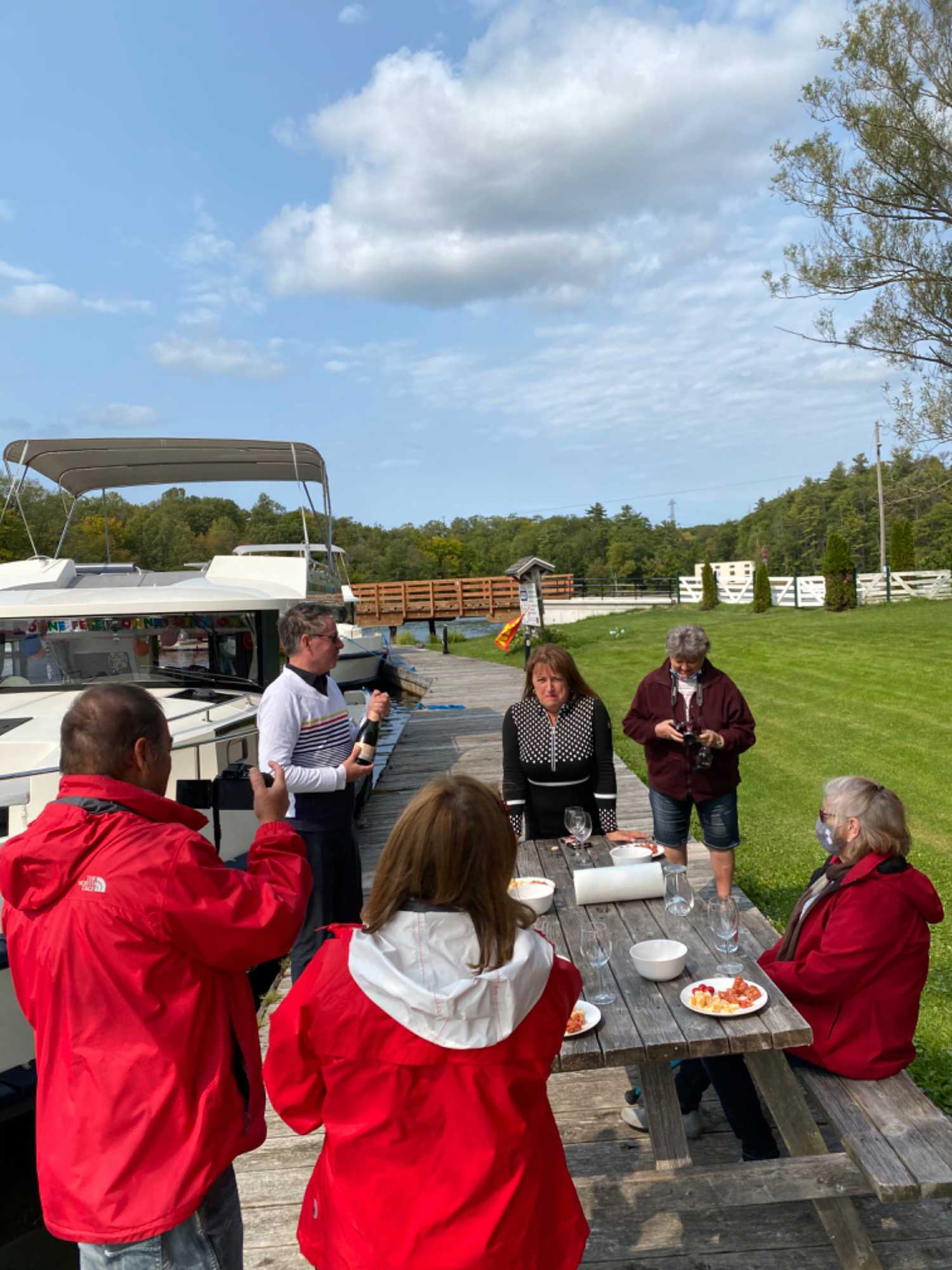 Le soleil est au rendez-vous et il fait de plus en plus chaud. Une superbe belle journée de fête! Après nous être retrouvés tous en bas des écluses Christian a invité tous les voyageurs à partager un excellent champagne rosé accompagné d'amuse-gueules. Une très gentille attention! Merci Christian! C'est toujours super de partager un petit champagne! Nous avons mangé un peu avant de continuer notre route vers une autres baie, celle de Seeley's Bay, où nous pensions rester pour la nuit. La navigation pour s'y rendre était bien belle et paisible mais l'endroit ne nous a pas trop plu, un peu trop d'action et nous désirions le calme. Nous décidons donc de rebrousser chemin vers le bas de l'Écluse de Jones Falls et nous nous y installons pour la nuit. Un autre apéro en dansant sur le quai que du bonheur! C'est le temps de retourner dans nos navires et de se préparer un petit souper. Quel beau souper et quelle belle soirée de fête! Une autre journée de fête mémorable à enregistrer dans ma mémoire.