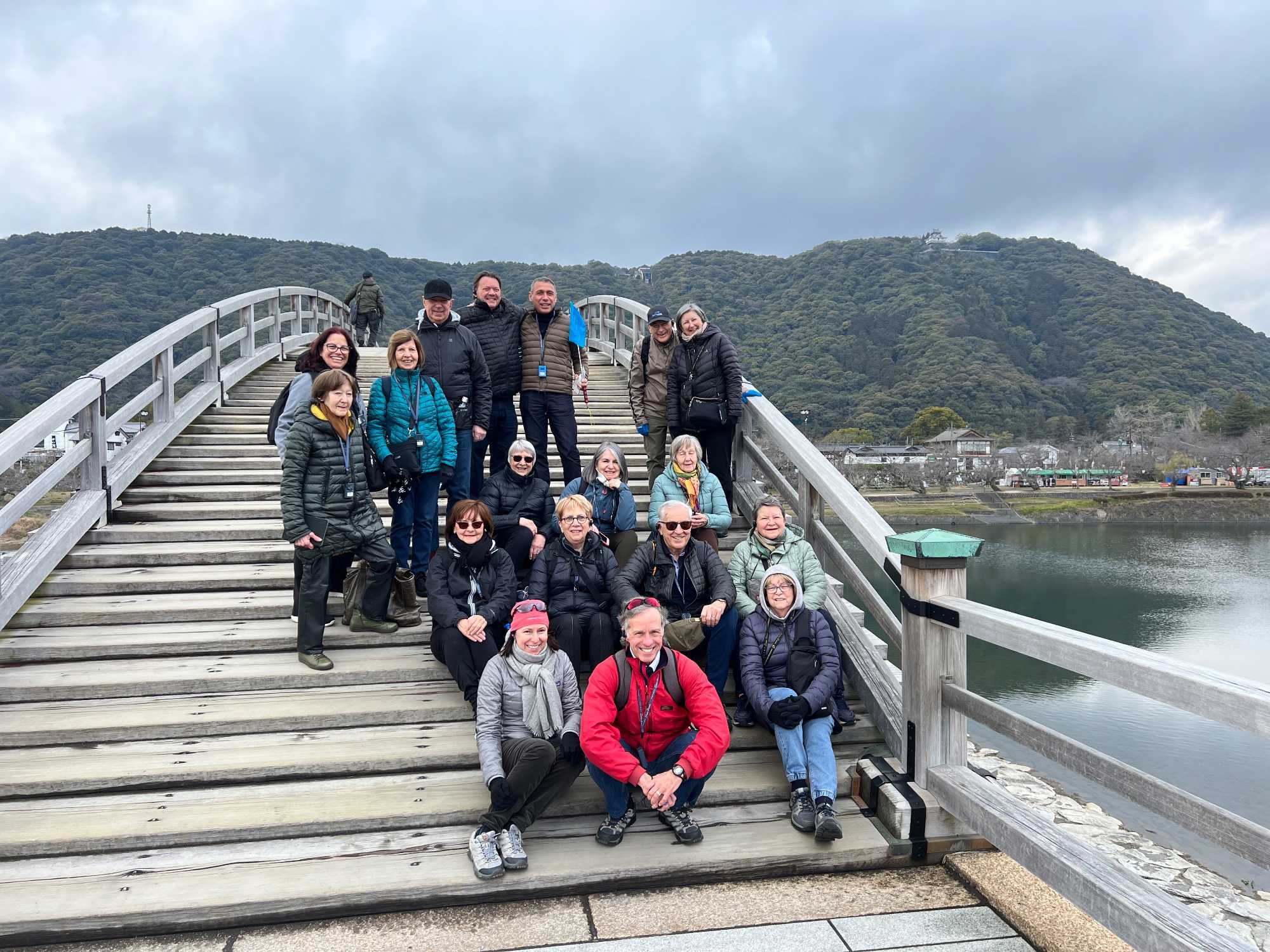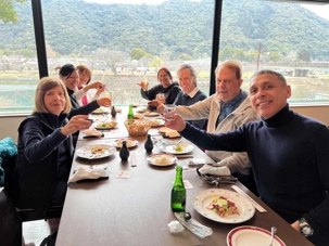 Dès notre arrivée à Hiroshima, nous rencontrons notre chauffeur pour la journée. Et c’est sous un ciel plutôt nuageux que nous partons vers Iwakuni. Nous voyons même un peu de neige aux sommets des montagnes. Après environ 1h15 de route entre les montagnes et la mer, nous arrivons à Iwakuni et nous nous dirigeons immédiatement vers notre restaurant pour notre premier dîner de groupe. Wow! Quelle présentation des mets dans nos assiettes! Tout ce que nous mangeons est délicieux. Et plusieurs en ont profité pour faire une première expérience avec le saké, la boisson nationale du Japon!