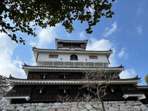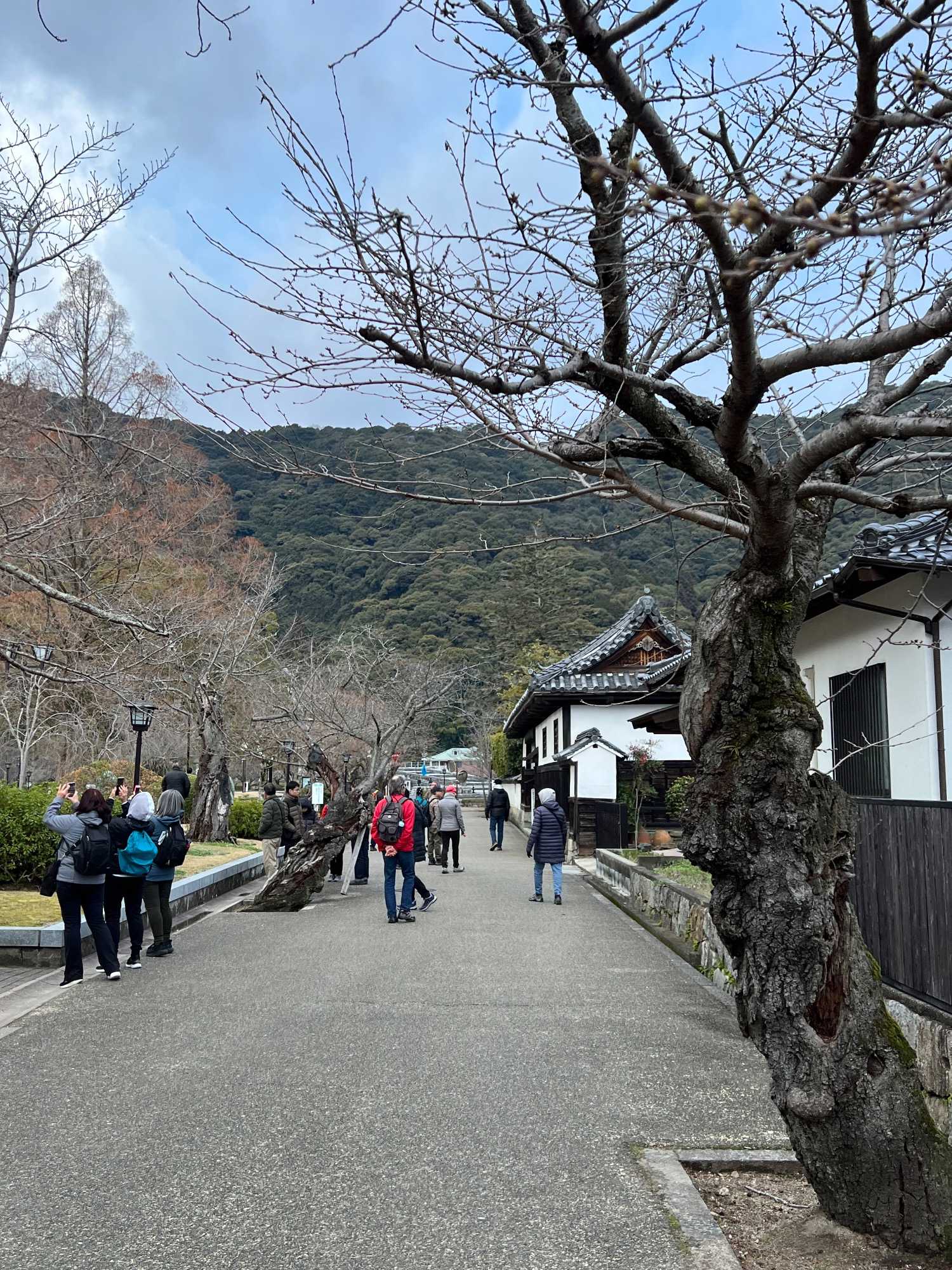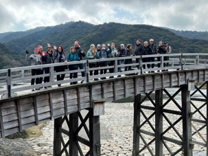 En après-midi, nous passons sur le fameux pont Kintakyo, à cinq arches, fait en pierre et en bois. Il s’agit de l’un des trois plus beaux ponts du Japon et il est classé comme site exceptionnel. Après de multiples photos, nous poursuivons notre parcours vers le château d’Iwakuni, situé sur une petite colline. Une belle promenade nous fait voir notre premier cerisier en fleurs! Il faut dire que le temps frisquet des 2 dernières semaines a retardé un peu la floraison des cerisiers. Mais notre voyage ne fait que commencer, on devrait en voir plusieurs tout au long de notre parcours. Puis nous prenons un funiculaire qui nous amène en haut de la colline. Il nous faut tout de même marcher pour nous rendre jusqu’au château! Une promenade qui nous tient en forme! Le château fait 4 étages et la vue au sommet nous donne un très joli point de vue sur les environs. Le temps de quelques photos et des explications de Jean, et nous retournons vers le bus. On doit faire tout le trajet inverse. Le soleil se montre le bout du nez, on apprécie. Il a fait un maximum de 8 degrés et assez humide.
