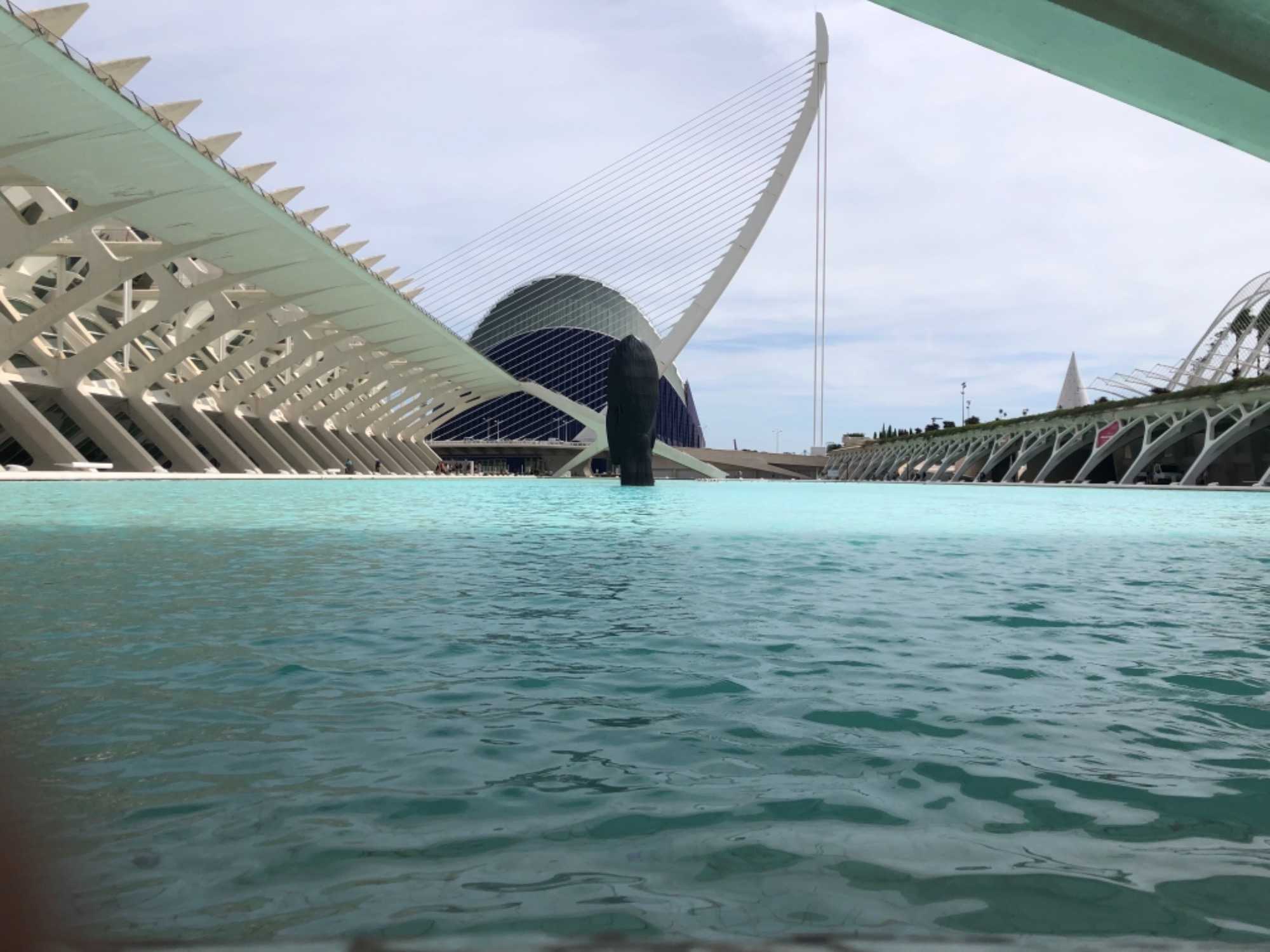 Il faisait 29 degrés à midi lorsqu’on a pris notre lunch (soupe froide aux tomates, fromage à la crème et pétales de fleurs, saumon sur un nid de légumes) avant d’entamer la seconde partie de la journée, la visite du parc des Arts et Sciences, considéré comme le plus grand d’Europe et construit par l’architecte valencien Santiago Calatrava. On le considère comme un architecte spécialiste des grandes structures. Calatrava est architecte, ingénieur et plasticien. Il établit sa réputation internationale par les projets de ponts. On lui doit la gare de Lyon-Saint-Exupéry et la gare d’Orient à Lisbonne. L’architecte a fait ses classes avec Gaudi, l’architecte de la Sagrada Familia. Nous visitions l’aquarium, l’Oceanografic, dans lequel nous avons assisté à un spectacle de dauphins, amusant.