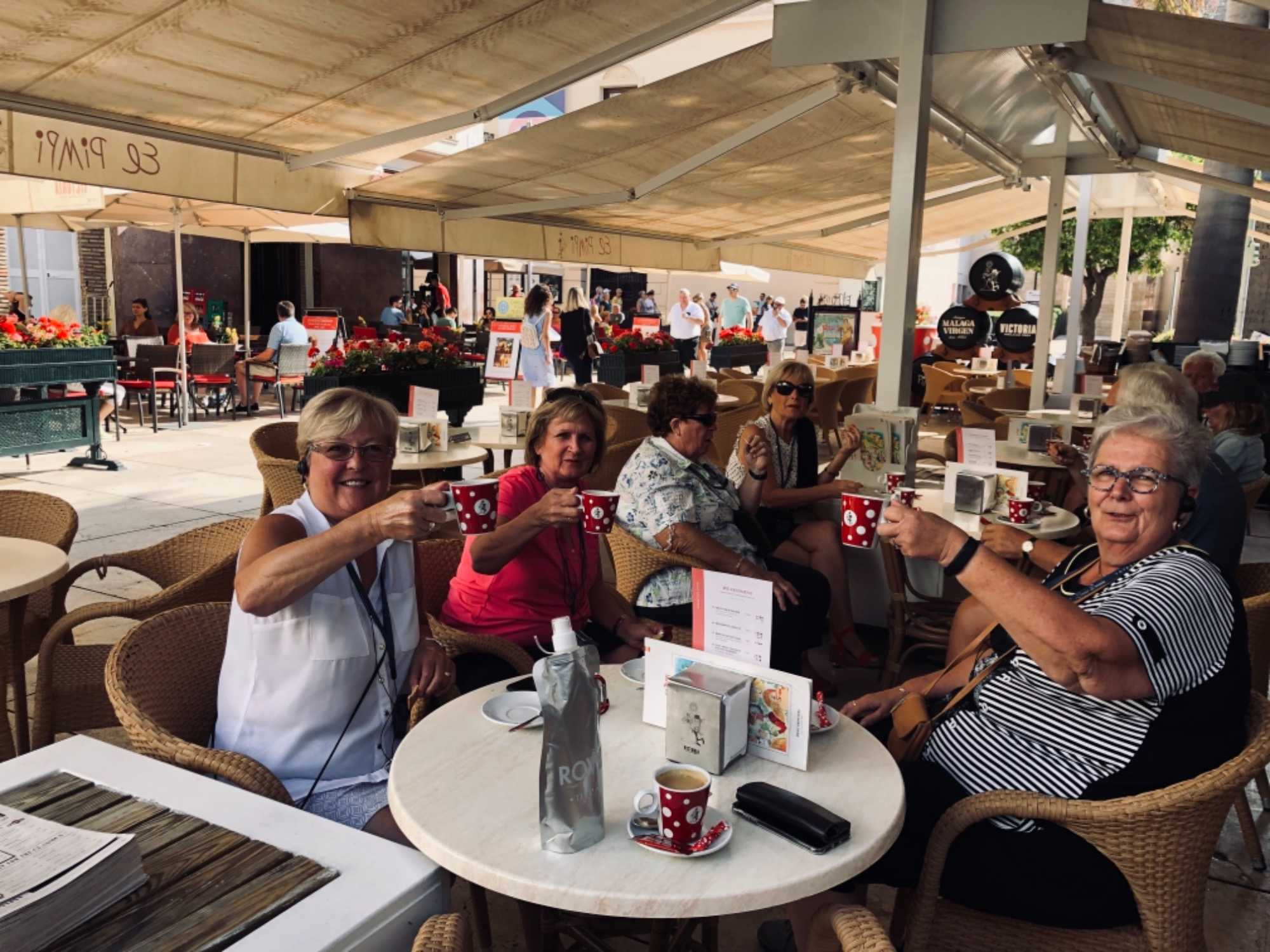 Nous montons au point le plus haut de la ville : Gibralfaro d’où nous avons une vue magnifique sur l’arène de taureaux, le port et une bonne partie de la ville. Nous descendons par la suite au centre de la ville en passant devant l’Université, on commence à voir la citadelle arabe, datant du 11e siècle. La marche nous mène du centre historique de Málaga, le quartier historique, on y voit les fondations de l’ancienne ville, d’un théâtre romain datant du 1er siècle avant Jésus-Christ. Et, SURPRISE, Voyage Louise Drouin, par le biais de notre guide Patrick, nous offre un petit café au El Pimpi. Pour les amateurEs d’Antonio Banderas, acteur espagnol, c’est dans ce restaurant qu’il prend son café, il a un appartement au coin de la rue! Banderas a fondé une école d’art dramatique dans la ville qui sera inauguré prochainement. Les bâtiments sont magnifiques particulièrement la cathédrale de l’Incarnation dont la première a été posée en 1528.