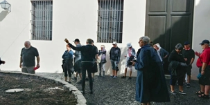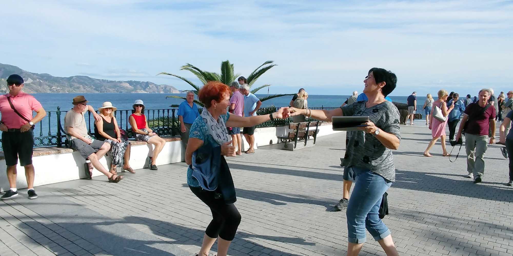 Nous poursuivons cette belle journée de visites vers Nerja. Au pied de la sierra de Almijara, cette station balnéaire de la Costa del Sol s’étend sur une falaise creusée d’anses sablonneuses. Aujourd’hui les petites rues sont très achalandées car il y a une fête. Dans les rues on voit des fanfares, des jeunes filles en costume traditionnel Flamenco. Nous nous prenons au jeu et certains d’entre nous ont fait quelques pas de danse… Même Patrick qui y est allé d’une démonstration de marche sur les mains… on a bien ri.