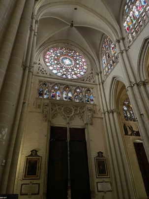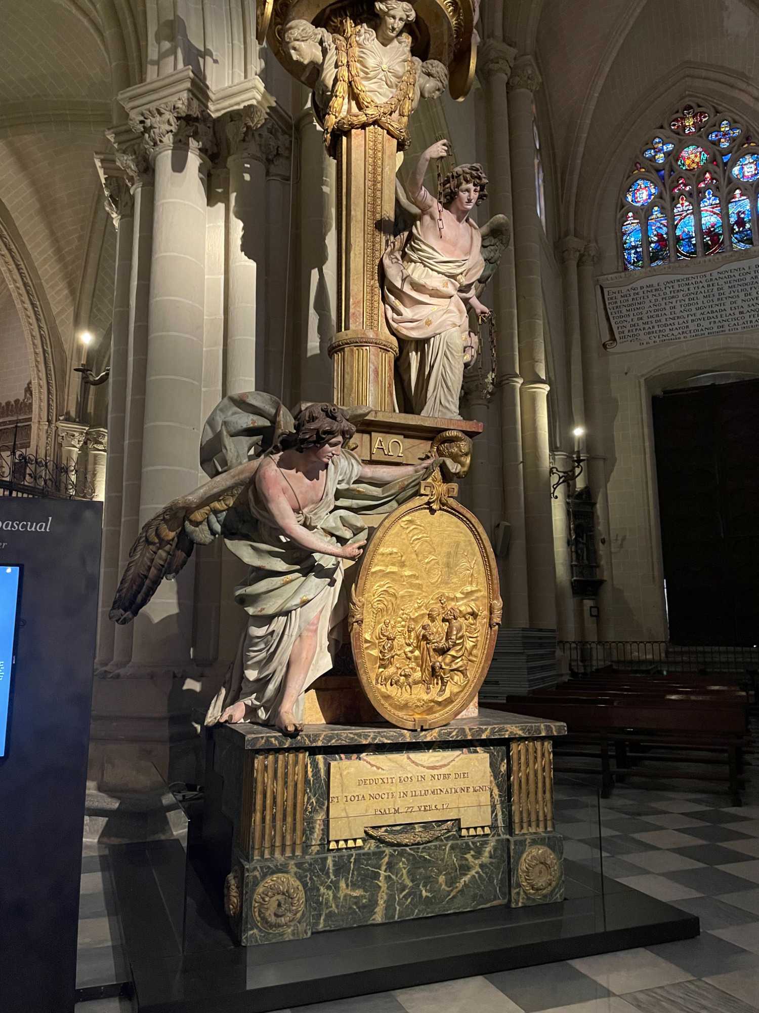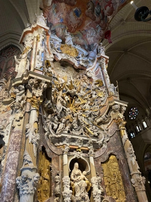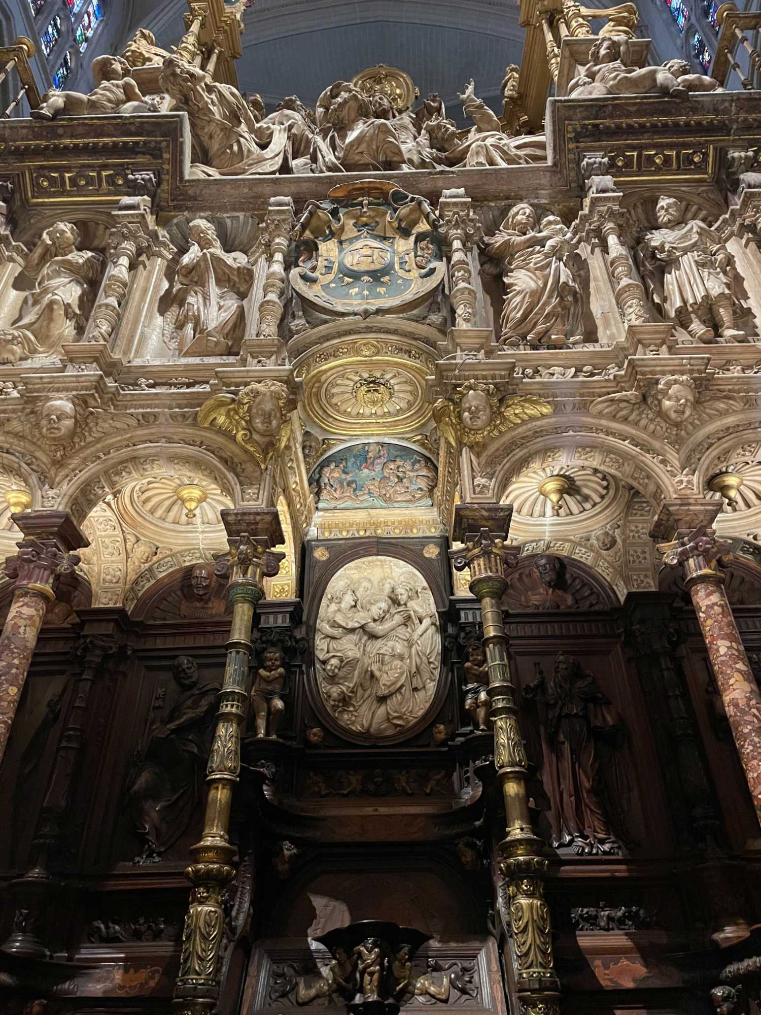 Après le repas, début du trajet par le biais d’un escalateur mobile pour monter vers la ville qui est perchée sur une colline. Certains des voyageurs ont même pris les marches ! On a du monde en forme, mais l’important on est tous ensemble et on respecte le rythme de chacun. Nous nous promenons entre les palais, les églises et les synagogues. Une visite d’une des plus spectaculaires cathédrale d’Europe, la cathédrale Sainte-Marie, dédiée à la vierge blanche nous fut offerte. À l’intérieur, des œuvres du Greco, peintre fondateur de l’école espagnole du XVIe siècle et autres peintres italiens célèbres. Des œuvres recouvertes d’or; c’est une église hors du commun.