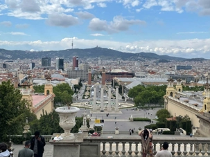 Le voyage nous a ouvert l’appétit. On se dirige donc vers le lieu de notre lunch au restaurant Tapa Tapa sur le bord de la mer dans le port de Barcelone. Mais bien sûr en s’y rendant, nous avons eu la chance de découvrir doucement les nombreux monuments de cette ville avec les informations de notre guide sur le long de notre trajet. 16 millions de personnes ont fait une visite de Barcelone en 2024 ! ville très visitée disons-le ! à la quantité de taxi, (plus de 11 000 taxis !), je crois que je n’en doute pas une seconde que celle-ci est une ville prisée des voyageurs de ce monde! De l’avis général, notre repas fut un festin. Les assiettes n’arrêtaient pas de se succéder sur nos tables. Plein de tapas pour tous les goûts. C’était un vrai délice. Petite promenade sur le bord de la mer avant de revenir à l’autobus. Nous avons un autre petit aperçu de cette magnifique ville et avons fait un arrêt au Mirador du palais National sur la montagne du Montjuic. Cette colline qui était habitée par les juifs au 15e siècle, d’où son nom : mont Juif, qui est devenue un parc public et un centre culturel. En 1929, elle reçut la 2e exposition internationale de Montjuic. Je vous le dis, ce voyage est un véritable cours d’histoire, on écoute religieusement les guides qui nous racontent l’Espagne. Cette colline domine l’ancienne ville et son vieux port qui est un des ports les plus importants en Europe, il peut recevoir neuf navires de croisière en même temps.