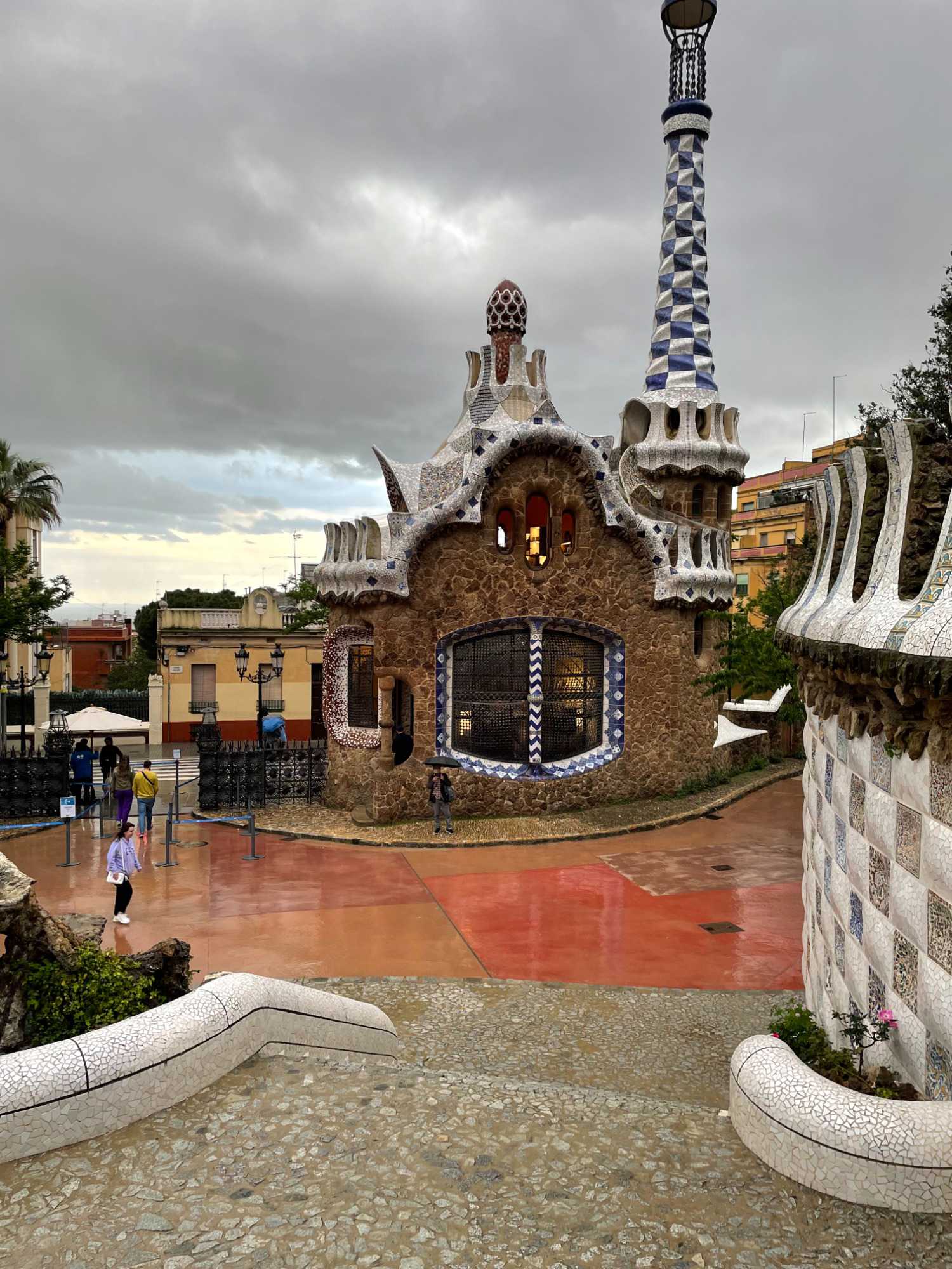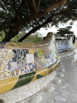 Nous faisons la visite d’un bijou de l’architecture moderniste, cet œuvre est commandé par Eusibie Güell, entrepreneur, homme politique et homme d’affaires. Il a été anobli en 1908 et fut maire de la ville de Barcelone. Il demande donc à Gaudi, architecte catalan et principal représentant du modernisme, de lui construire une cité-jardin, le parc Guëll, sur le mont Carmelo. Conçu pour des familles aisées sur une grande propriété qu’il avait achetées, son emplacement était sans égal, situé dans un environnement sain et avec des vues splendides sur la mer et la plaine de Barcelone. Inscrit sur la liste du patrimoine mondial de l’Unesco pour sa contribution au développement de l’architecture et des techniques de construction, le parc devait être à l’origine une cité-jardin devant comporter une chapelle et 60 maisons. Toutefois, le fort coût de construction limita à quatre le nombre de maisons dont deux en forme de champignon. On y retrouve, au centre, des escaliers avec des îlots-fontaine, en particulier l’emblématique fontaine en forme de salamandre. La dénivellation des escaliers est de 8,10 m. Une fontaine avec tête de dragon sortant du drapeau catalan règne en roi et maître au centre du parc. Une balade féérique dans une interprétation singulière de la nature dans un espace social où pavillons ajourés de faïences et végétation luxuriante forment une symbiose parfaite. Cet homme était un visionnaire, Gaudi a réalisé une réflexion urbanistique profonde pour donner forme à l’ensemble, entreprenant alors un processus insolite de création artistique. Le parc est devenu propriété de l’état en 1922 et ouvert au public en 1928.