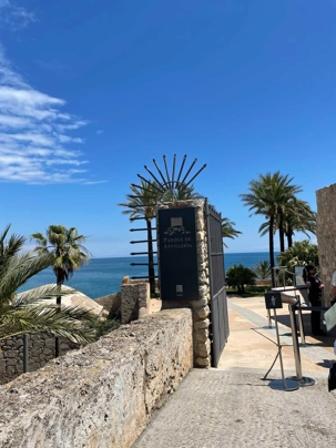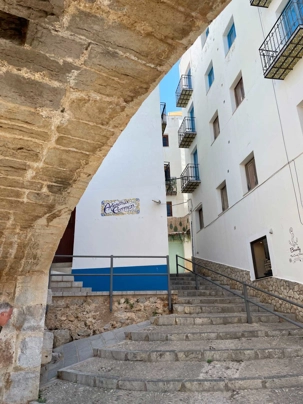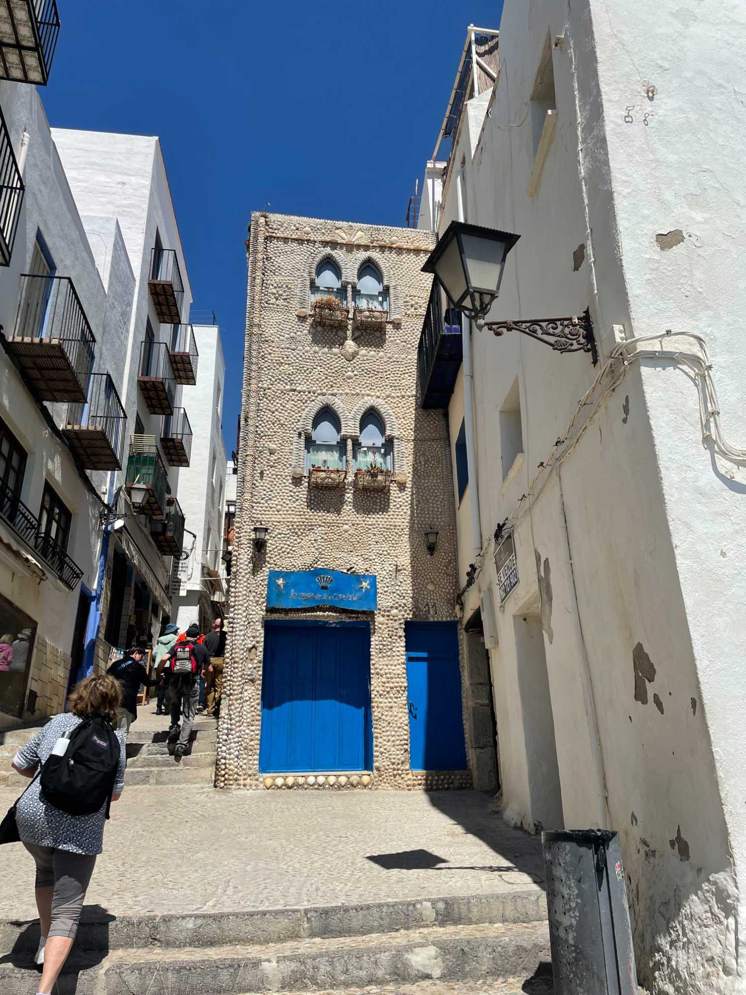 Nous arrivons à notre destination pour notre après-midi, à Peñiscola, vers midi. Nous déambulons dans les petites rues de la ville afin de nous retrouver tout en haut pour aller visiter le château qui y est tout en haut. Véritable forteresse. Certains ont même dit que cela ressemblait beaucoup à la Grèce. Les bâtiments sont peints en couleur pâle, souvent en blanc avec de jolies décorations de couleur bleue. Un vrai belle petite ville. Aujourd’hui, de multiples rues entourent ce château. Quel magnifique décor ! Belles rues qui regorgent de restaurants et de boutiques de toutes sortes.
