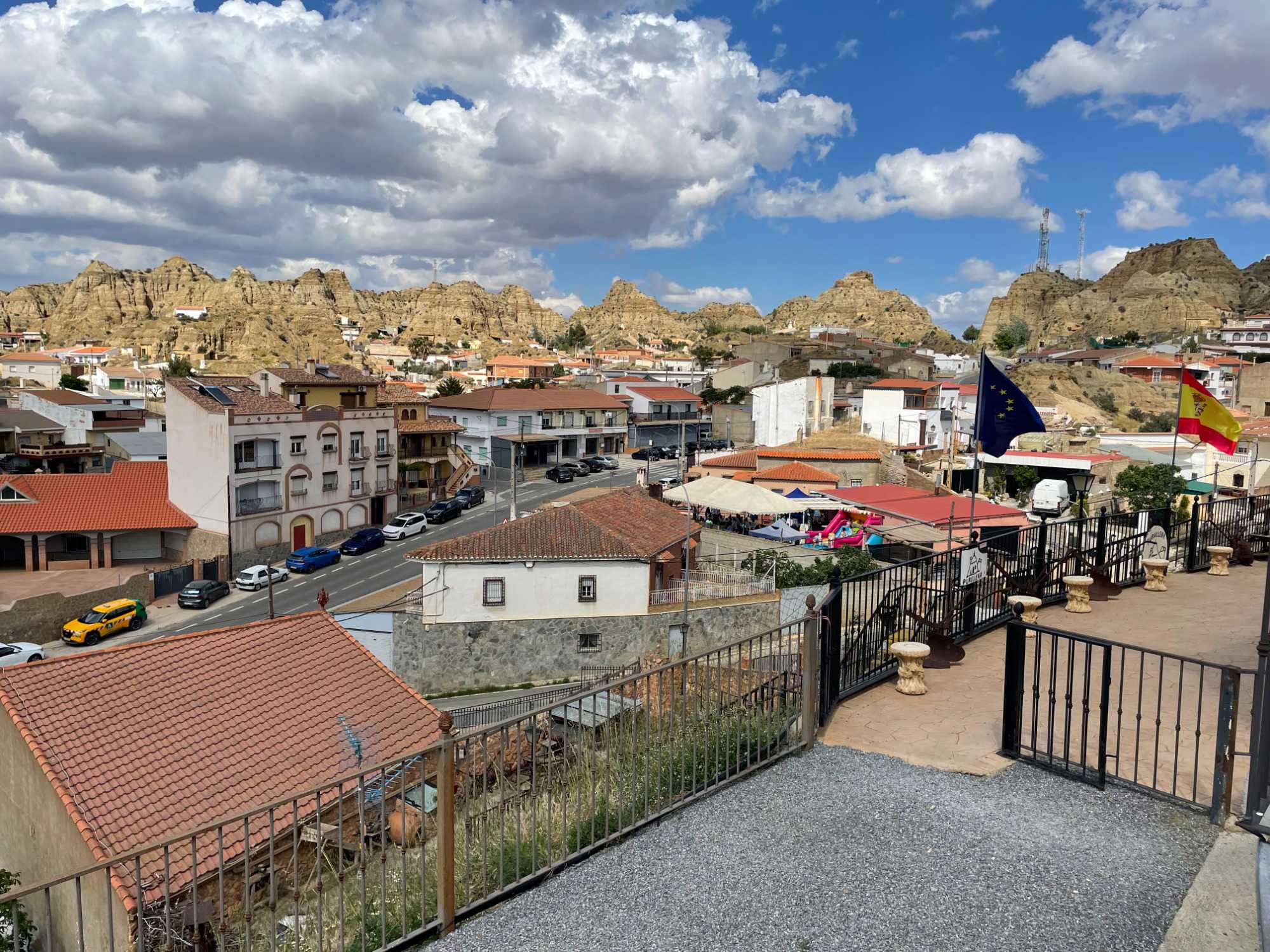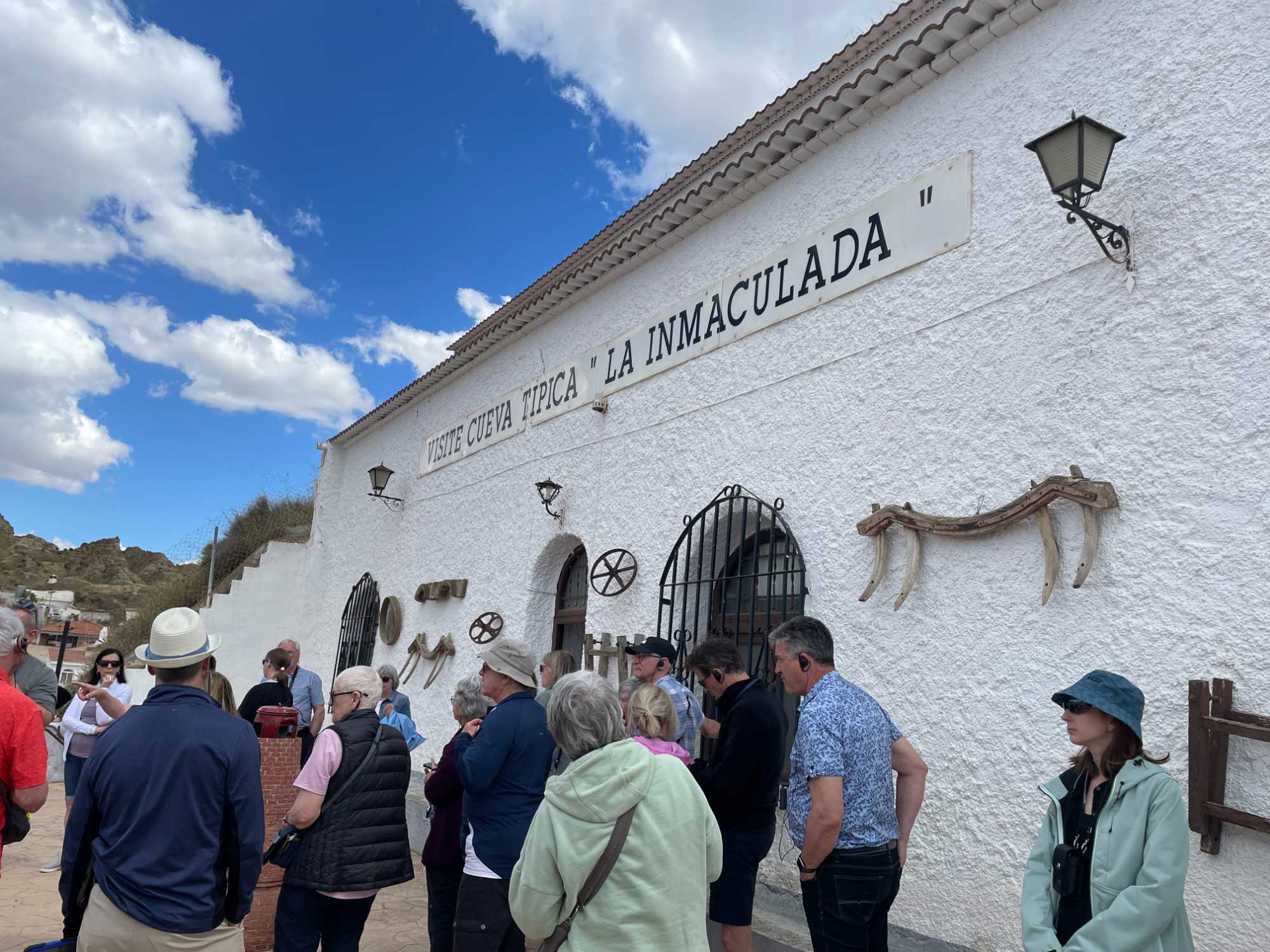 Nous nous sommes arrêtés pour visiter une maison troglodyte, à Purullena. C’est une maison que l’on creuse dans la terre à flanc de montagne. Les parois rocheuses deviennent alors très dures; on y applique de la chaux pour recouvrir les murs qui deviennent d’un blanc immaculé. Il n’y a pas de fenêtres et la température interne est toujours la même tout au long de l’année à plus ou moins 15 à 16 degrés Celsius. Cela reste ainsi même si à l’extérieur les températures peuvent frôler les zéros degrés. En fait c’est une maison-musée. Il y a 1218 maisons troglodytes dans la province dont 200 dans cette ville. La maison que nous visitons est impressionnante, quatre étages incluant la terrasse. La résidence est habitée par une famille de 5 personnes; les parents avec 3 enfants. Pour se chauffer, ils ont des foyers à bois si cela est nécessaire. Aujourd’hui, on ne peut plus avoir de terrains pour bâtir une nouvelle maison, seules les maisons existantes peuvent être agrandie ou bien vendue et acheter. Du haut du toit, nous pouvons apercevoir au loin les extrémités de la montagne enneigée de la Sierra Nevada.