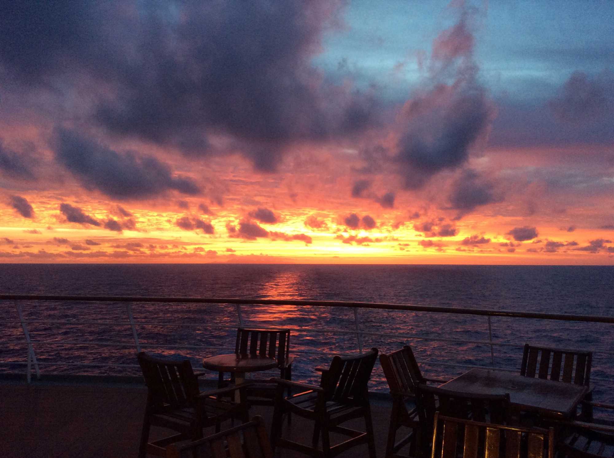 Ce soir, un autre excellent souper nous est servi au restaurant Le Grill. On nous propose un menu polynésien et asiatique. Nous assistons à un superbe coucher de soleil. Le ciel est coloré et se prête bien comme décor pour nos photos. Encore une fois, on se délecte et nous passons une autre très belle soirée avec des voyageurs formidables.