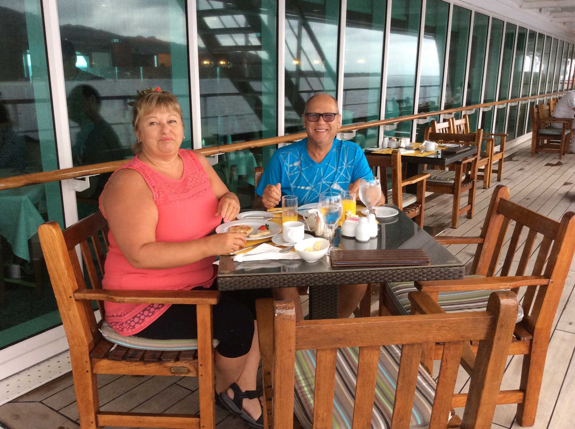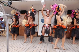 En fin d’après-midi, Jean-Marc participe à un cours de ukulélé en vue de préparer un spectacle à être donné vers la fin de notre croisière. Peu après, des musiciens et des danseurs de Rarotonga viennent faire une prestation en plein air sur le Pont de la piscine.