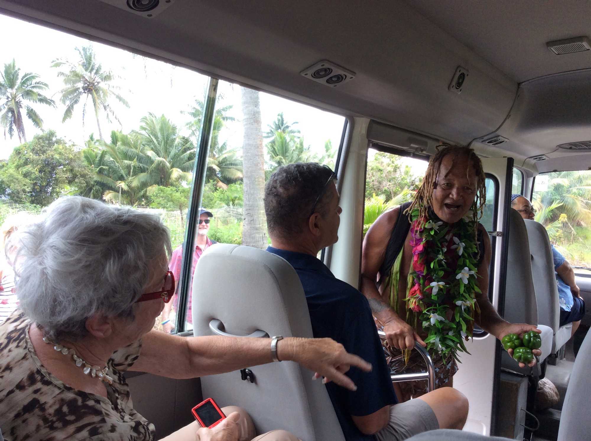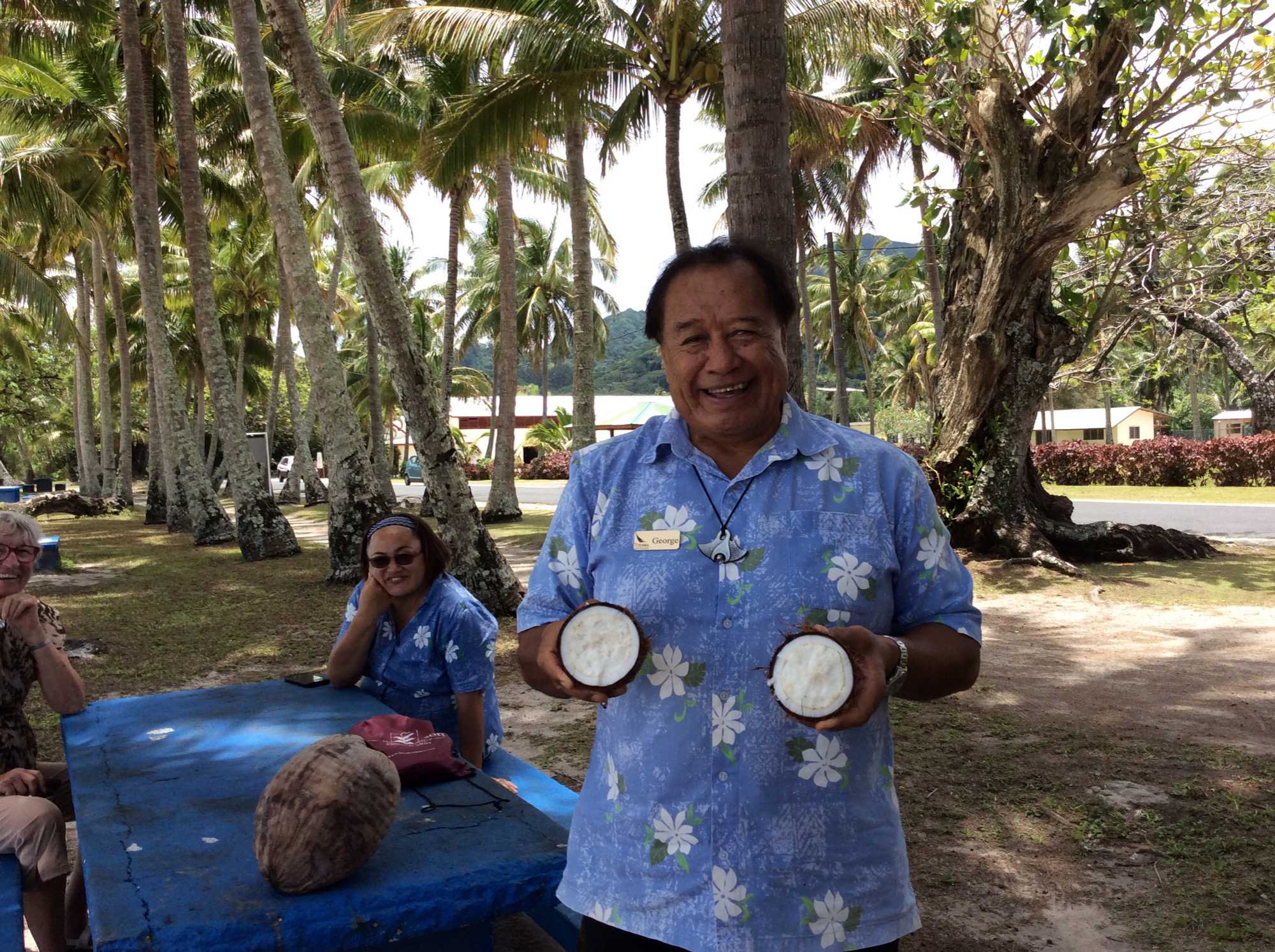 Par la suite, George nous fait une démonstration sur les noix de coco et les cocotiers, l'Arbre de Vie comme il l’appelle. Il nous explique ses nombreuses utilisations. Notre visite guidée continue sur un certain nombre de sites historiques, y compris la première église de calcaire construite sur l'île dans les années 1800 au village of Titikaveka. Nous allons au site des 7 canots du port de Ngatangiia, point de départ de la migration polynésienne vers la Nouvelle-Zélande en 1350. À cet endroit, des Maoris de Rarotonga sont partis à l’aventure pour finalement découvrir la Nouvelle-Zélande et être les premiers humains à l’habiter. Ensuite, nous allons au Black Rock, un rocher volcanique sur le bord du lagon, traditionnellement considéré comme le point de départ des esprits vers Avaiki (l'au-delà). En chemin, nous apercevons le Needle Lookout qui est un affleurement volcanique marquant le centre de l’île. C’est l'un de ses points les plus élevés.