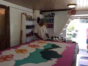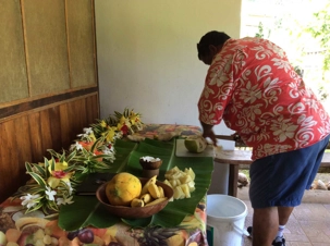 Un arrêt dans la maison d'un artisan de l'île, nous amène à rencontrer Emmanuel. Il nous accueille dans sa maison entourée d’un jardin magnifique. Pendant que Moana nous prépare des fruits pour une collation, Emmanuel nous démontre comment il peint, à la main, ses magnifiques paréos. Sur le balcon, un musicien chante en français pour nous, au son de sa guitare. Nous nous joignons à lui, le temps de quelques chansons, pour fredonner des airs connus.