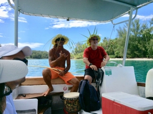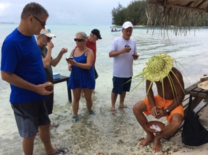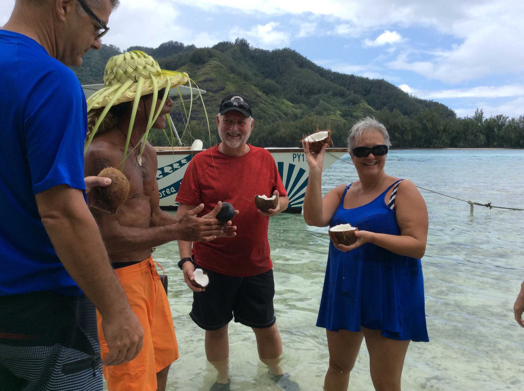 Notre aventure se poursuit dans les tonalités de bleu et de turquoise, alors que nous glissons sur les eaux aux couleurs incroyables du lagon, pour aller sur un motu privé. Là-bas, un dîner polynésien, nous attend. Nous participons à la préparation de la salade de poisson; les voyageurs ont été invités à casser des noix de coco. Ensuite, Wilfrid a râpé les noix de coco pour en extraire le lait qu’il a ajouté à sa salade de thon cru mariné. Au menu nous trouvons du poulet, des légumes polynésiens, de la salade de thon, du riz à la noix de coco, du pain tahitien à la noix de coco et des bananes grillées.