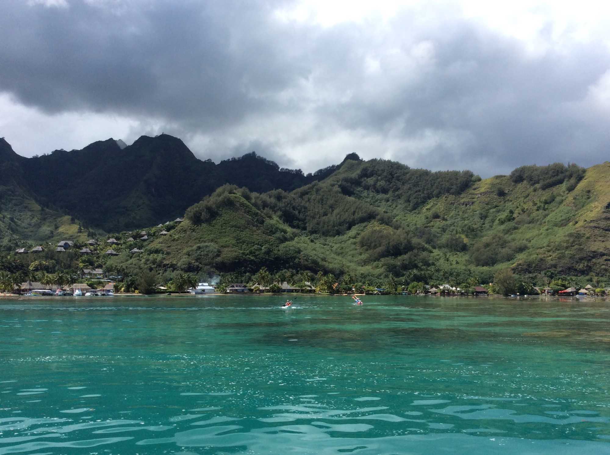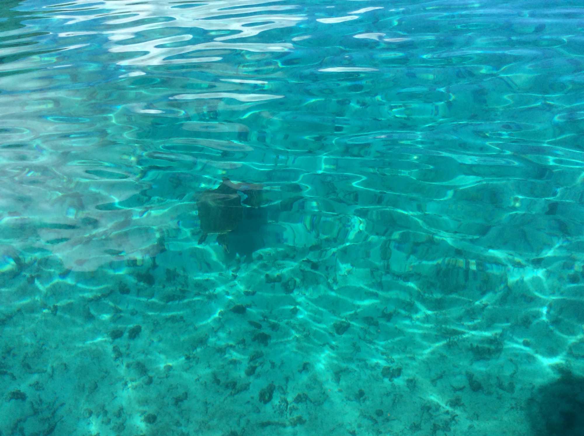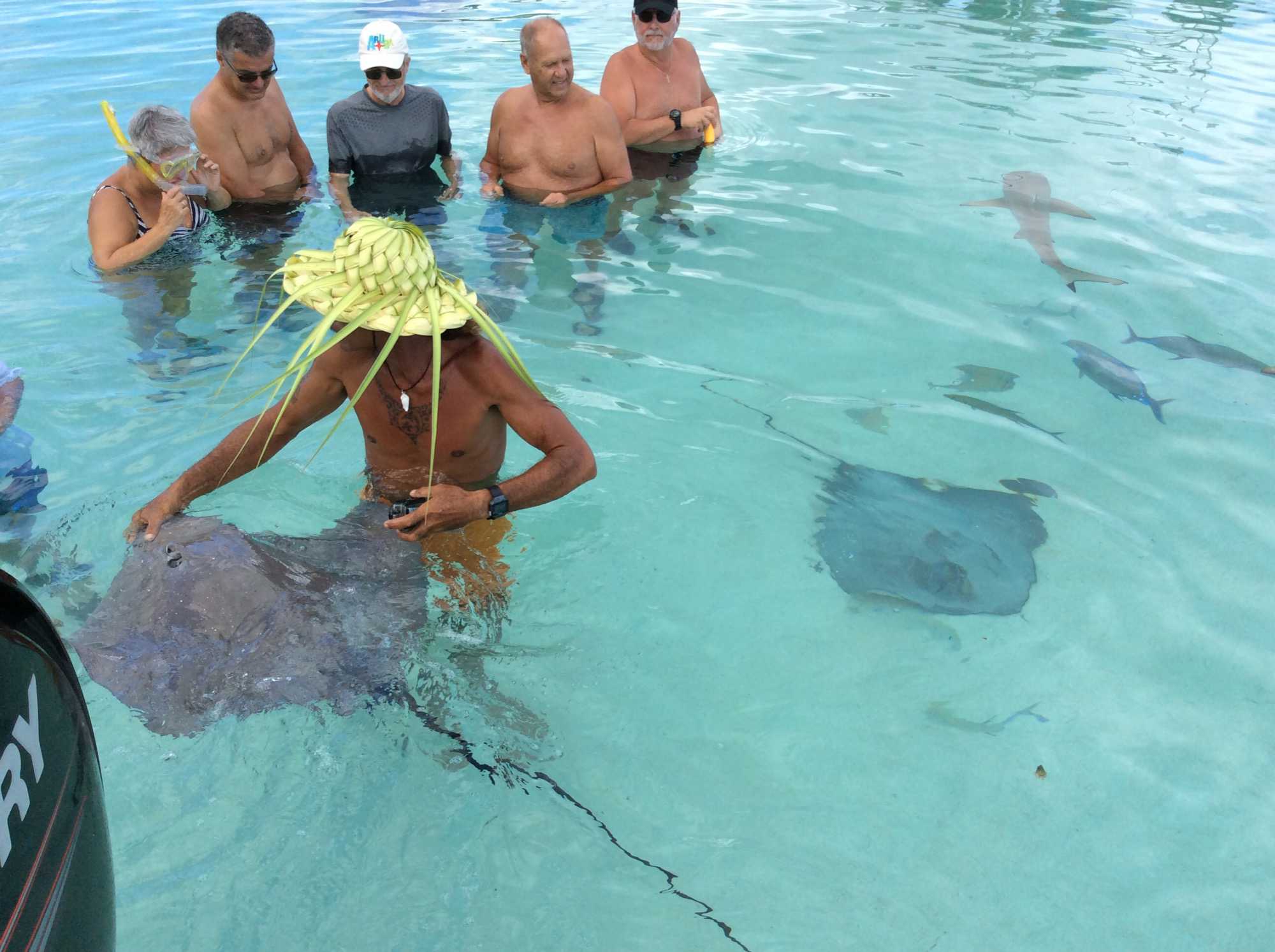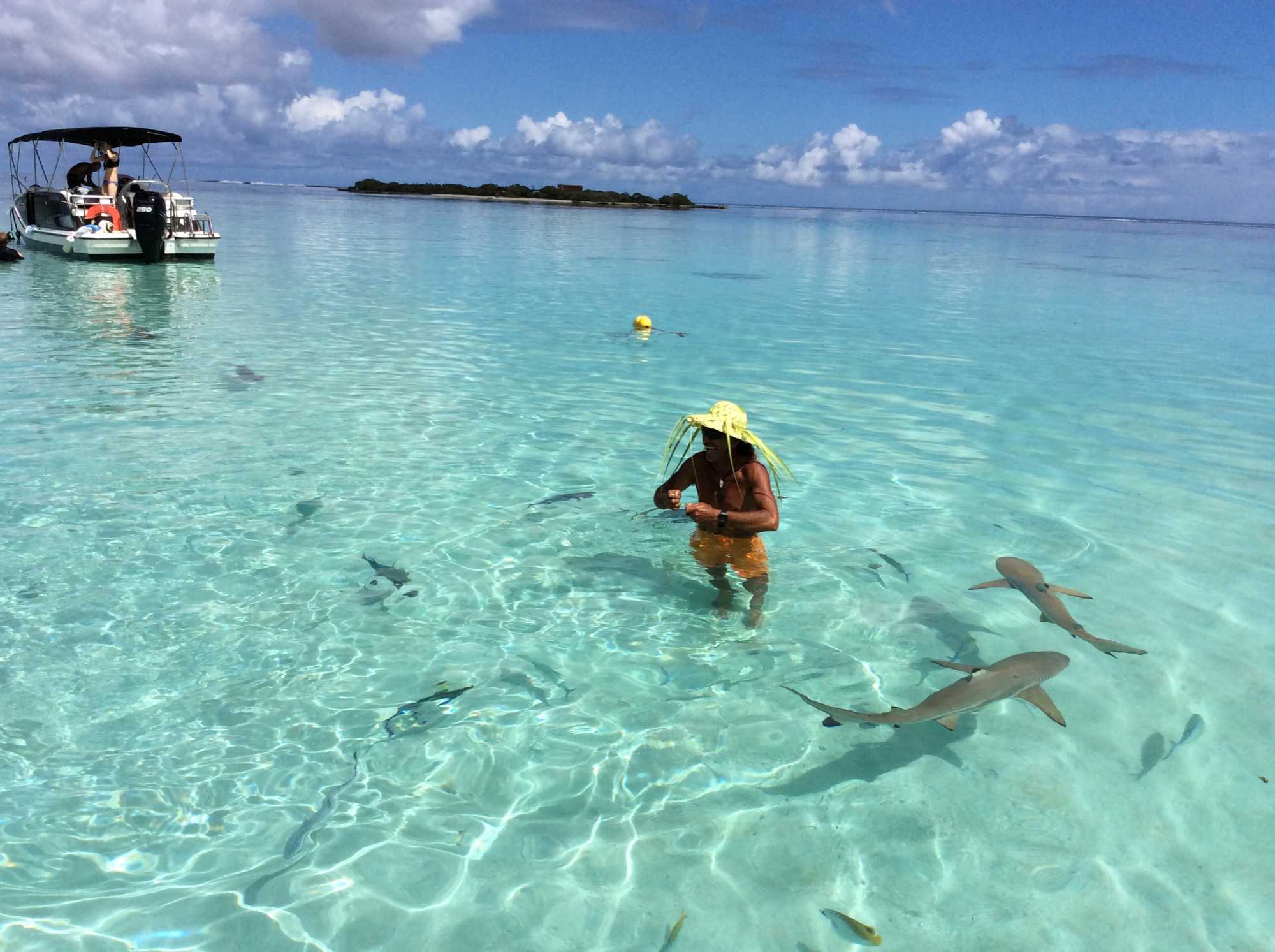Nous pouvons admirer l'île depuis l’intérieur du lagon, alors qu’on se dirige vers l’Ouest. Nous passons en face de l’hôtel Hilton et de l’hôtel Intercontinental qui offrent aussi des bungalows donnant directement sur l’eau. Non loin de là, notre guide Wilfrid, nous montre une tortue nageant dans l’eau cristalline juste devant nous. Elle vient à la surface pour prendre son souffle; elle le font en moyenne à tous les 15 minutes et nous avons eu la chance de le voir. Il nous amène à un endroit peu profond où nous pouvons nager avec de l’eau à la hauteur du thorax afin de nous présenter les raies et les requins communs à pointe noire, des poissons très populaires, qui nous frôlent mais sans être menaçants. Wilfrid sait y faire et permet aux personnes angoissées d'approcher les animaux sans risque. Notre guide les nourrit devant nous pour nous permettre d’admirer leur élégant ballet aquatique! L’expérience a durée une heure mais le temps a passé si vite qu’il a semblé durer dix minutes. Nous allons ensuite vers un jardin de corail où nous avons le plaisir de plonger avec nos masques et tubas, dans des eaux cristallines, à la découverte des nombreux poissons multicolores. Nous avons le plaisir de nous baigner et Wilfrid nous sert des breuvages à l’aide de son mini-bar flottant. Il nous prépare aussi des morceaux d’ananas.