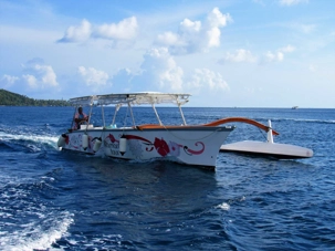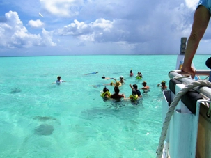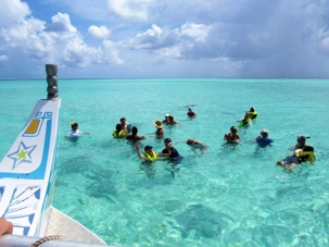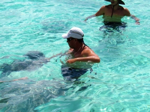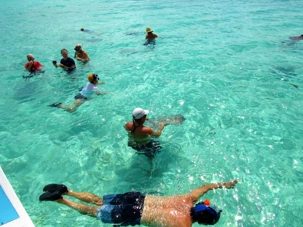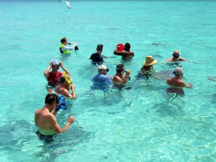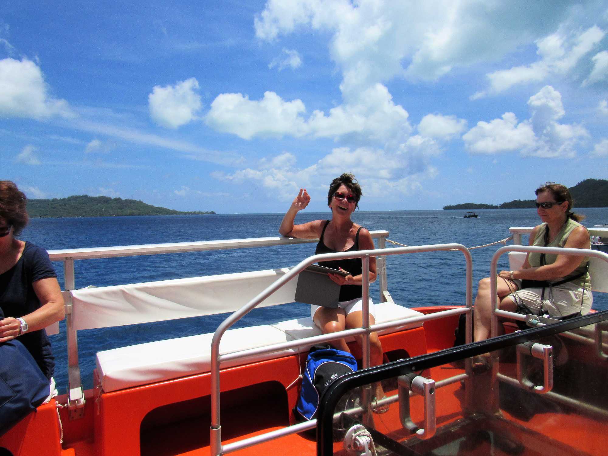 Après avoir jeté l’ancre en eaux peu profondes, nous avons pu observer les élégantes et inoffensives raies pastenagues. Elles semblent littéralement glisser dans l’eau, tout doucement autour de nous, pendant que nous les nourrissons! Une expérience hors de l’ordinaire! Quelques personnes les ont même touchées! Elles nous passaient entre les jambes et, étant bien curieuses, venaient vers nous. Nos guides sur ce catamaran nous accompagnaient dans l’eau. C’était vraiment un moment fort pour nous. La proximité des requins à pointe noire étaient aussi un challenge pour ceux qui avaient un peu peur. J’ai réussi à prendre quelques photos où l’on voit très bien les requins tout près de nous. Mais c’était un moment inoubliable. Sous la musique de nos animateurs nous avons par la suite navigué vers un jardin de de corail cristallin afin d’y faire de l’apnée. Les consignes nous ont été données de façon très précise et ce, afin de ne pas mettre en danger le corail…et nous-mêmes! Une multitude de poissons tropicaux de toutes les couleurs sont venus à notre rencontre! Poissons perroquets, poissons papillons et même Nemo était au rendez-vous! Une bonne majorité de mes voyageurs ont fait l’expérience de se baigner avec les raies ou de nager avec les poissons en faisant de l’apnée. Pour ceux qui en sont à leur première expérience, c’est toute une première, ici dans ces eaux turquoise. C’est comme un rêve. Même pour moi qui ai eu la chance de venir souvent, je suis encore fascinée par ces paysages de rêve et je ne peux qu’apprécier la chance que j’ai, d’accompagner ces voyageurs dans un coin de paradis.