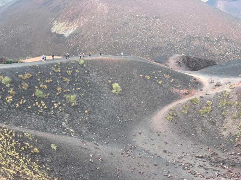 En après-midi, nous prenons la direction du mont Etna. Une caméra en direct nous présente des images du volcan. Vive la technologie! L’Etna forme une montagne massive culminant à plus de 11 000 pieds d’altitude couvrant une superficie de 1 200 km2, depuis juillet 2021. Durant le XXe siècle son altitude a fréquemment varié d’environ 330 pieds en fonction des coulées de lave et de boue. L’agriculture fertile est enrichie par les sols volcaniques.