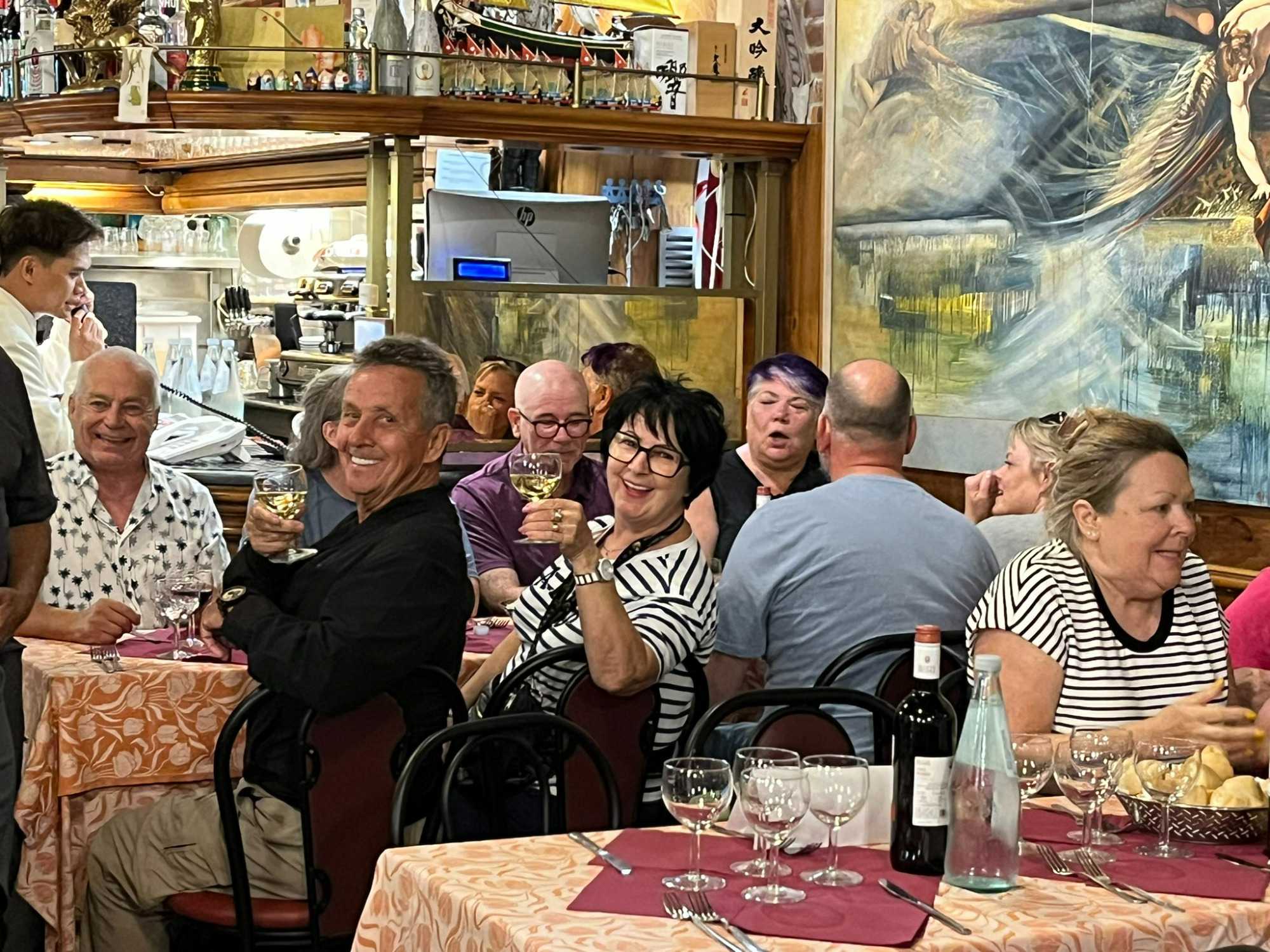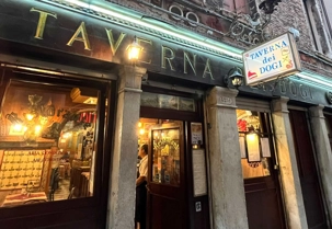 Vers 19 h, notre groupe s’est retrouvé à la Taverna dei Dogi restaurant situé dans une charmante petite ruelle, non loin du Palais des Doges. Les voyageurs, qui apprennent à faire connaissance, partagent leurs impressions de la journée autour de grandes tables conviviales qui facilitent les échanges dans ce décor typiquement vénitien. Le vin coule à flot, les pâtes aux fruits de mer sont délicieuses, les conservations s’animent et les rires résonnent.