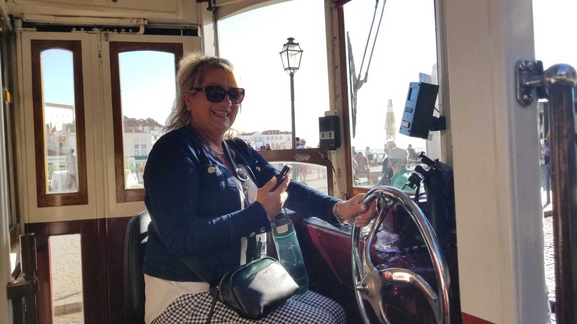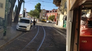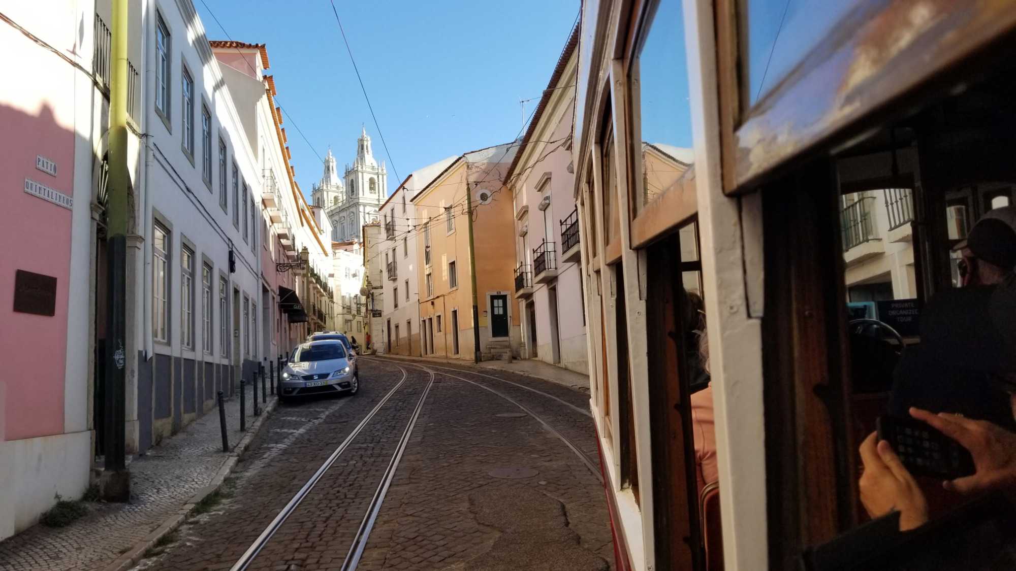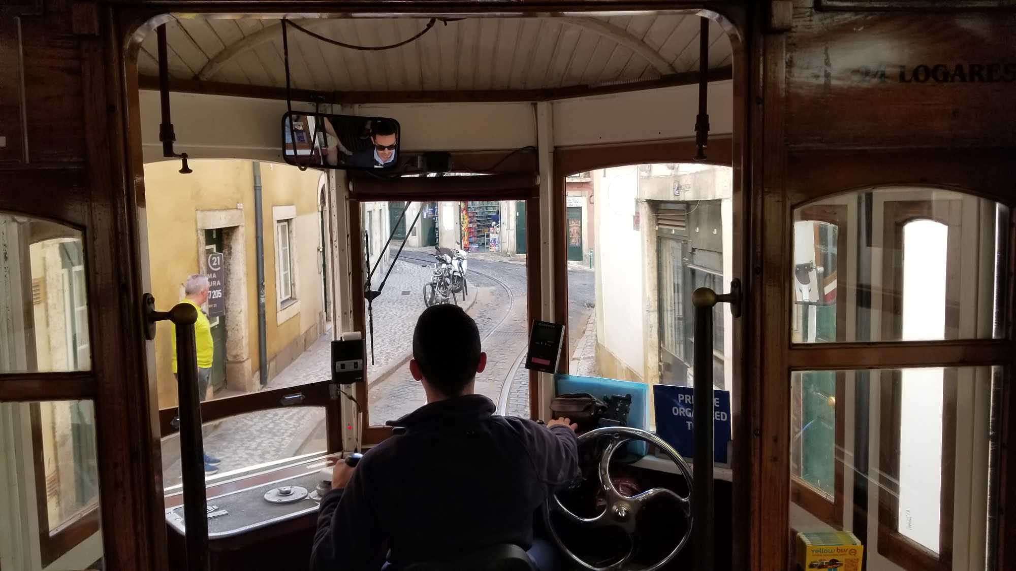 Qu'à cela ne tienne, on part tel que prévu à 8h30 en autobus pour se rendre à la basilique des étoiles (basilica da Estrela). C'est de là que débute notre tour privé en tramway. Notre chauffeur, ou plutôt le garde-frein comme l’appelle Patrick (on se soucie plus de la capacité de contrôler les descentes que les montées), nous fait sillonner les vieilles rues de Lisbonne. Ça grince, le moteur gronde, surtout en montant les côtes parfois abruptes de la vieille ville. Heureusement nous n’avons pas eu besoin de pousser…. Il y a du sable pour améliorer l’abrasion du lourd véhicule de 15 tonnes sur ses rails.