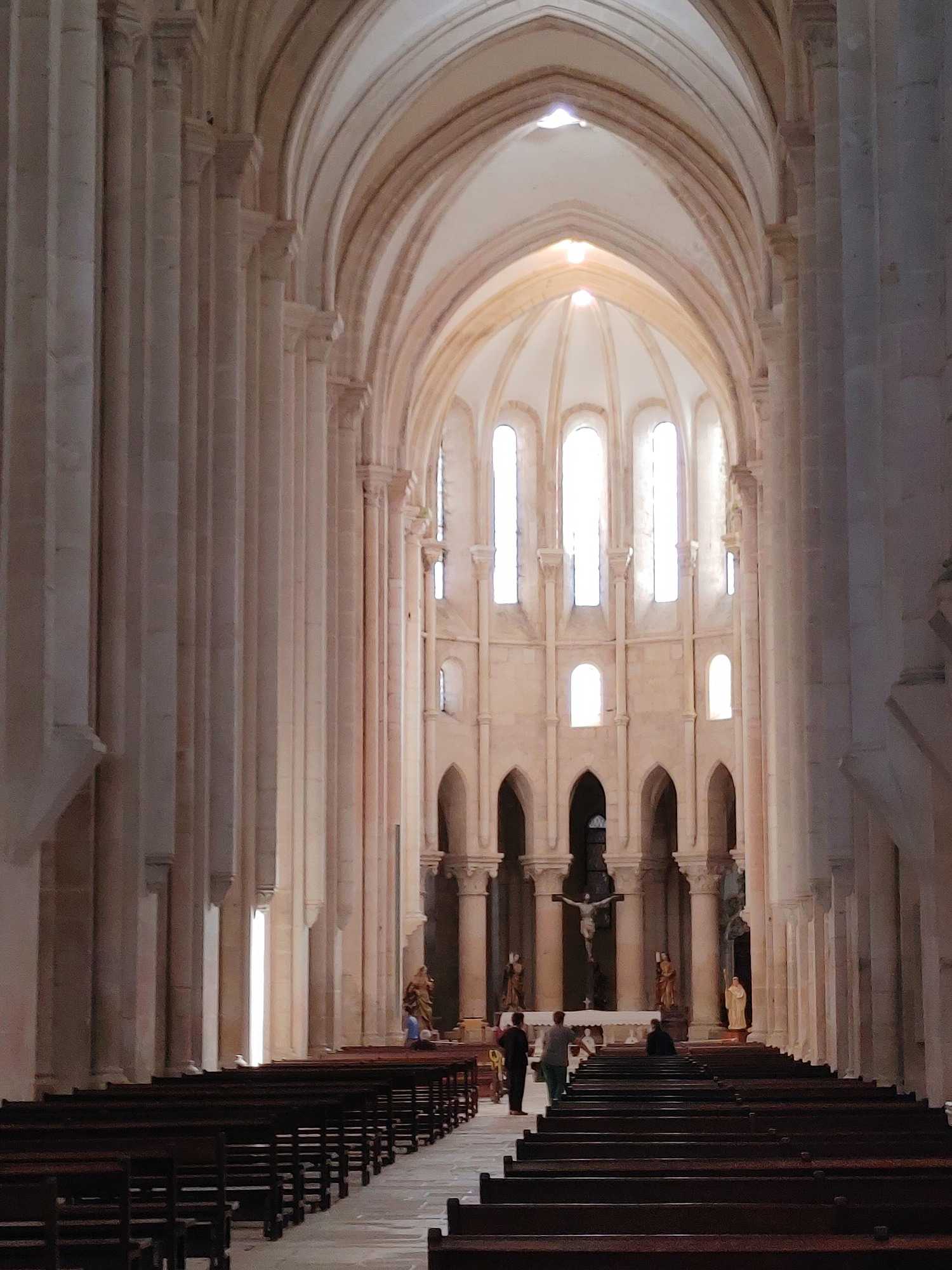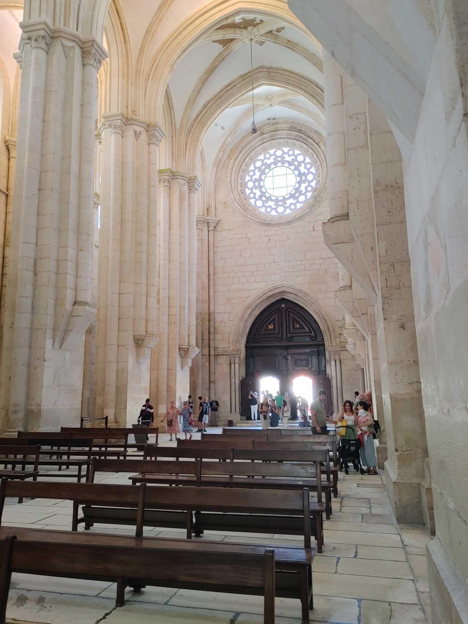 On aime les matins où on n’est pas obligés de refaire nos valises. C’en était un aujourd’hui alors, nous étions moins pressés. Après le déjeuner, qui ressemblait à tous les autres car ce sont toujours des buffets, nous sommes partis pour la petite ville d’Alcobaça. Une courte route de 30 minutes nous y a menés pour visiter son église gothique du 12ème siècle où furent enterrés les tombeaux royaux de Dom Pedro I et Inês de Castro. Il s’agit de la plus longue église du Portugal, environ 130m. Depuis le début, Patrick nous dit que les Portugais aiment les choses imparfaites donc, ça ne pouvait pas être exactement 130m.