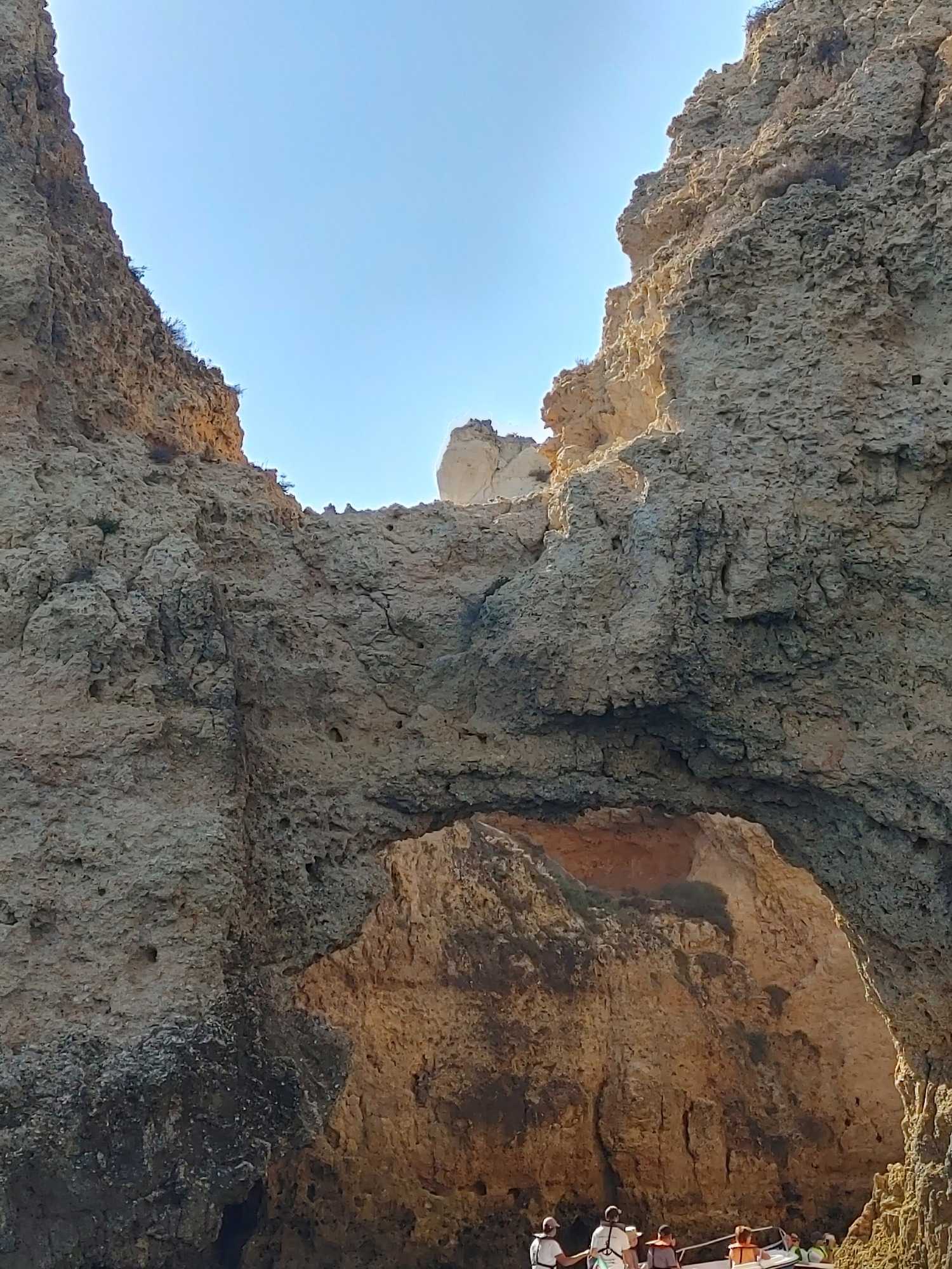 Après le dîner, on a pu se promener dans les petites rues de Lagos pour flâner ou faire à nouveau des achats avant de se retrouver à la marina. Nous sommes montés à bord de 4 bateaux à moteur pour aller voir les falaises de plus près et entrer dans des grottes. On nous a fait remarquer que certaines des falaises avaient des formes reconnaissables comme : un éléphant, le Titanic, un chameau, des jumeaux, l’arc de Triomphe… Aussi, les gens comparent les grottes à des pièces de la maison; on a vu la cuisine avec son four, le garage, la toilette et même la cathédrale!