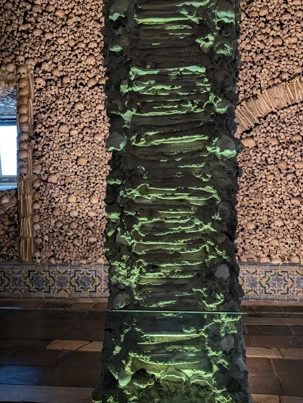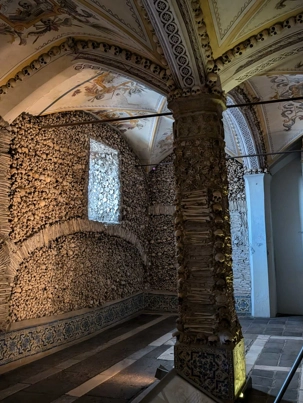 La ville d’Évora : classé au Patrimoine mondial de l’UNESCO en 1986, en raison de sa richesse historique, appelée « ville-musée ». C’est à pied que nous empruntons ses rues étroites bordées de belles maisons blanches. Évora a un patrimoine riche composé de remparts de parcs. L’Église de Sao Francisco, a une chapelle la capela Dos Ossos, « Chapelle des os », monument le plus connu. Ses murs et ses huit colonnes sont décorés d’os longs et de crânes maintenus par du ciment. Le plafond est fait de briques peintes en blanc et décoré de motifs morbides. On estime pour réaliser cette œuvre 5000 squelettes. Deux cadavres en dessiccation, dont un enfant, sont pendus par des chaînes. Il est inscrit au plafond, la phrase de Melior : dies mortis die nativitatis (« Le jour de la mort vaut mieux que celui de la naissance »).