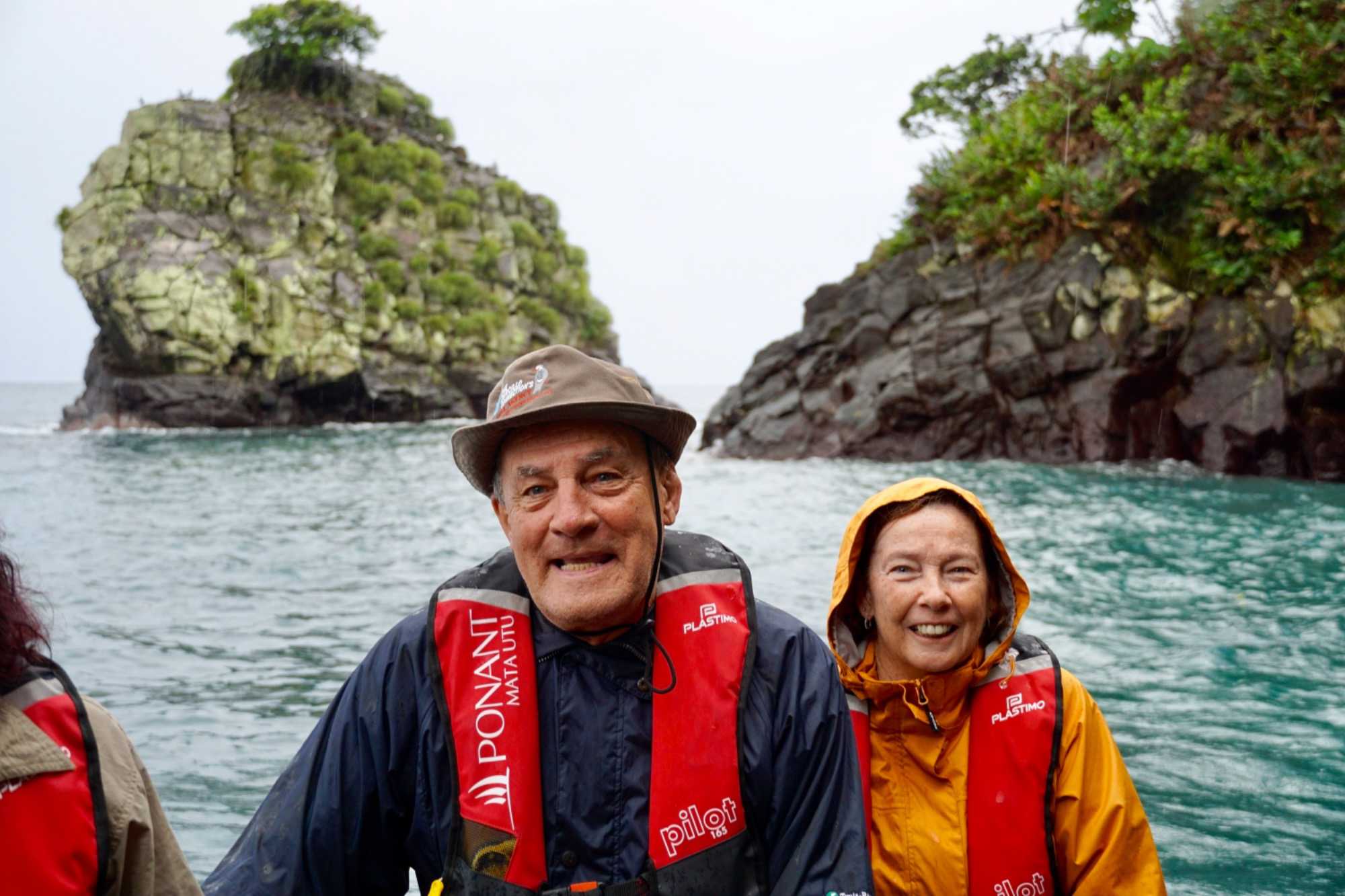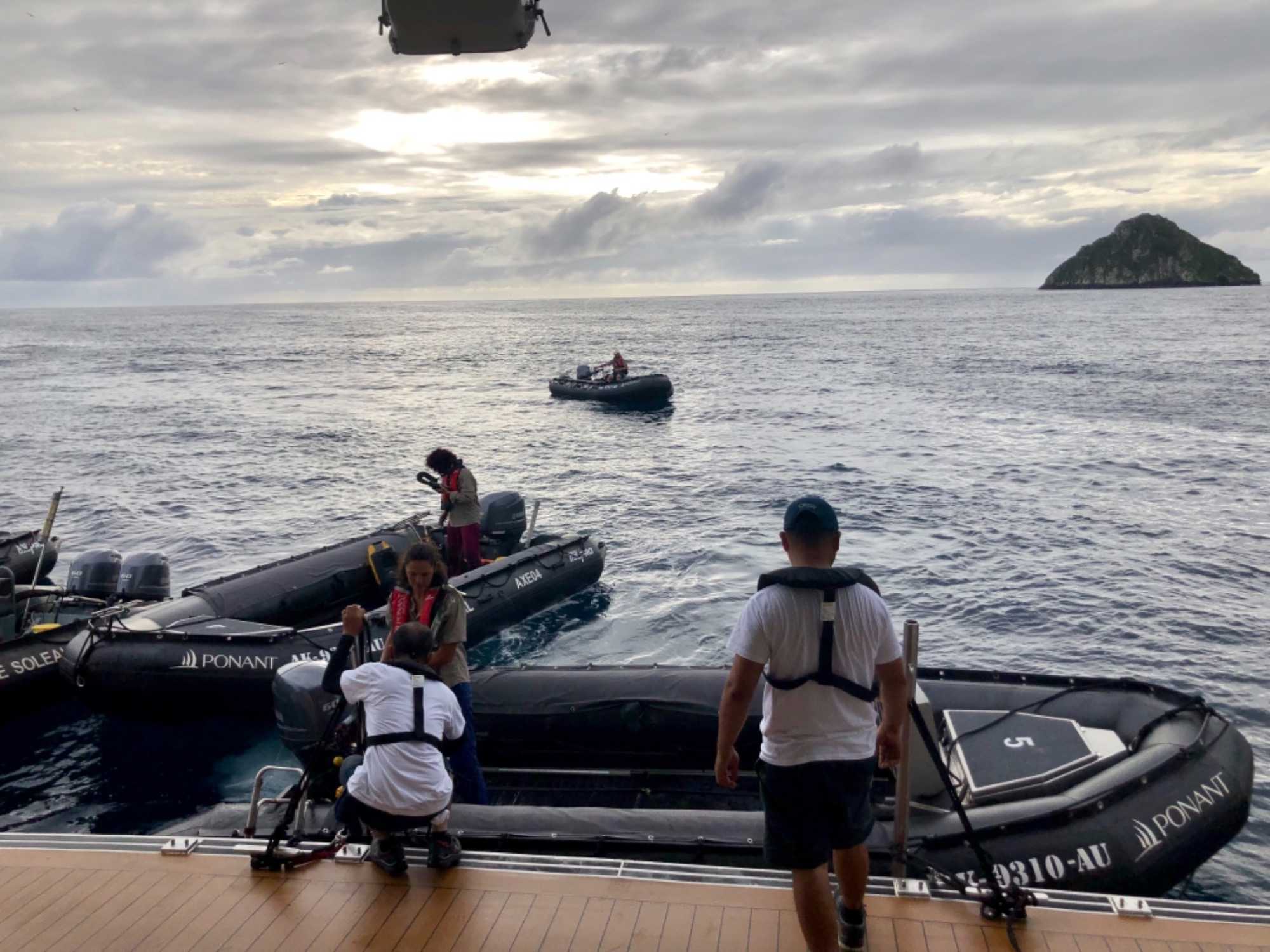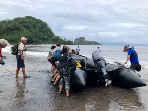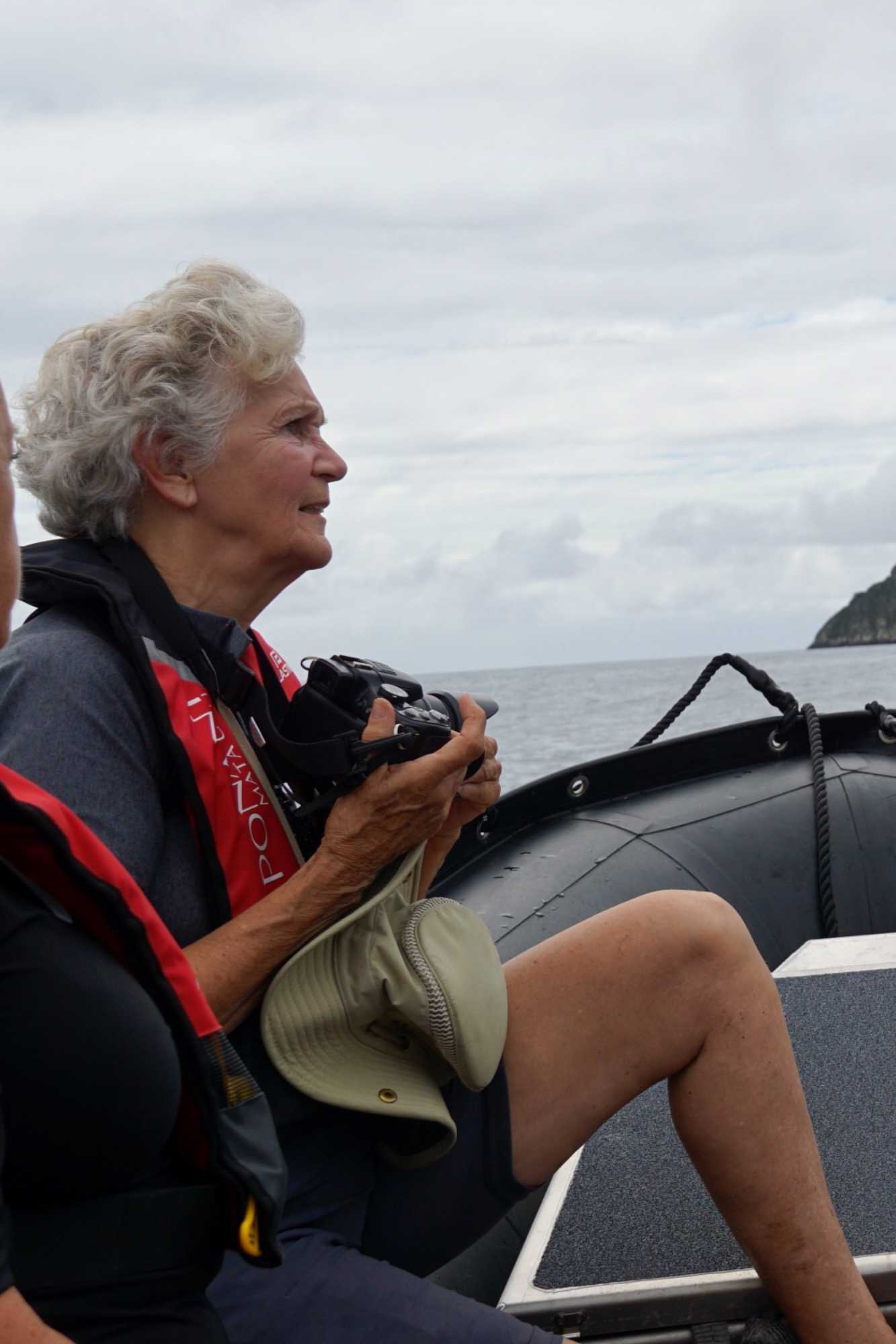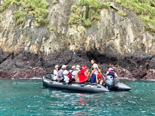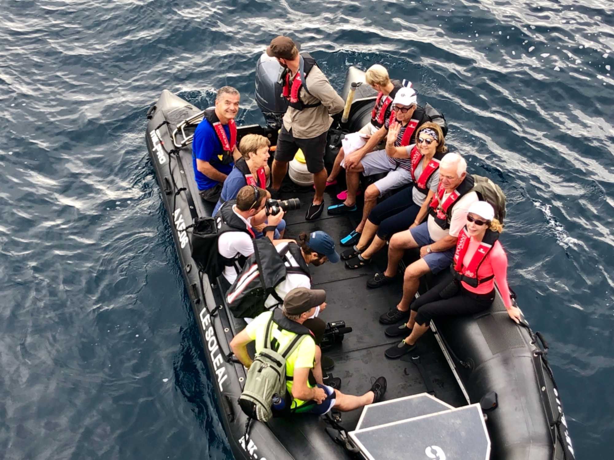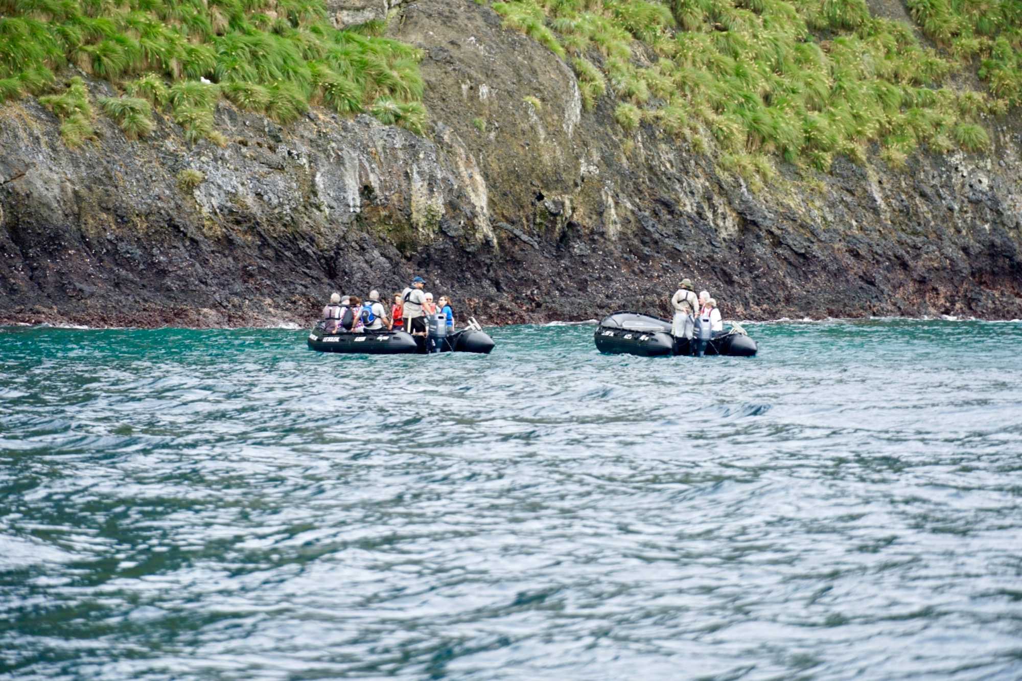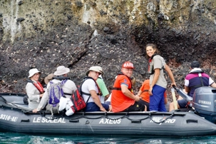 Plusieurs braves ont réussi à la terminer et nous nous sommes bien amusés. Les photos vous amuseront bien. La descente par contre a été plus compliquée car l’on glissait un peu plus que lors de la montée. Ce fût réussi pour mes voyageurs sans problème à mon grand bonheur car un accident est si vite arrivé. De retour sur la plage nous étions attendus pour une croisière en zodiaque afin d’apprendre plus sur cette île volcanique et sur les oiseaux. Nous avons suivi la côte et découvert les endroits de nidification pour plusieurs beaux oiseaux de l’île. Ce fût une belle découverte pour environ 1 heure de balade et nous sommes retournés sur le navire.
