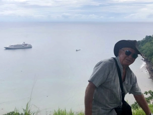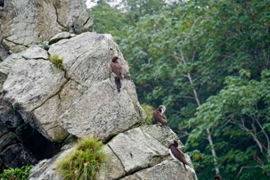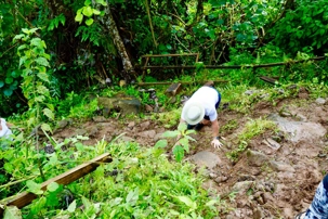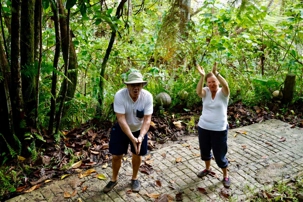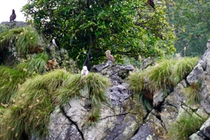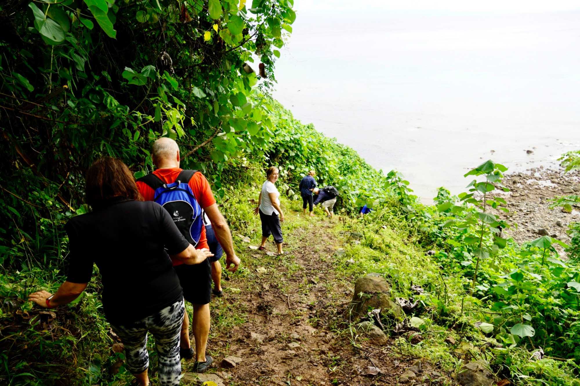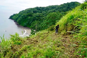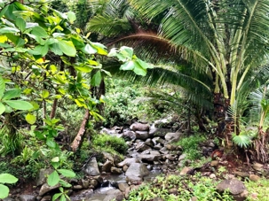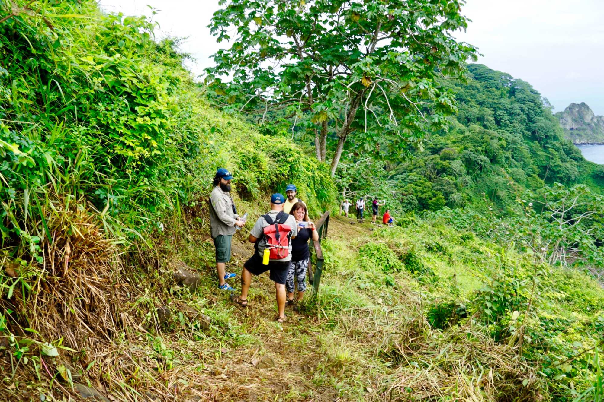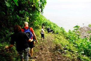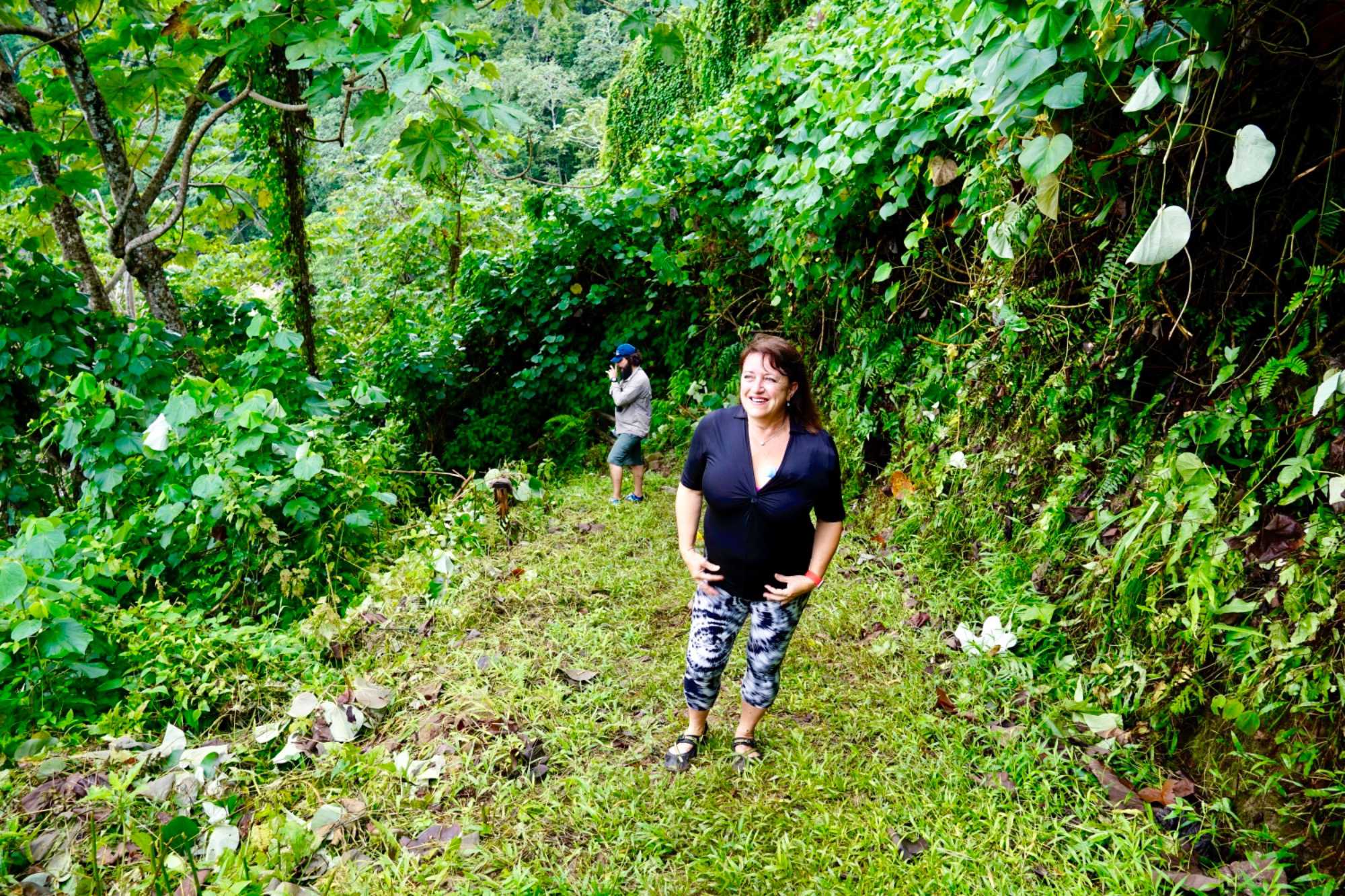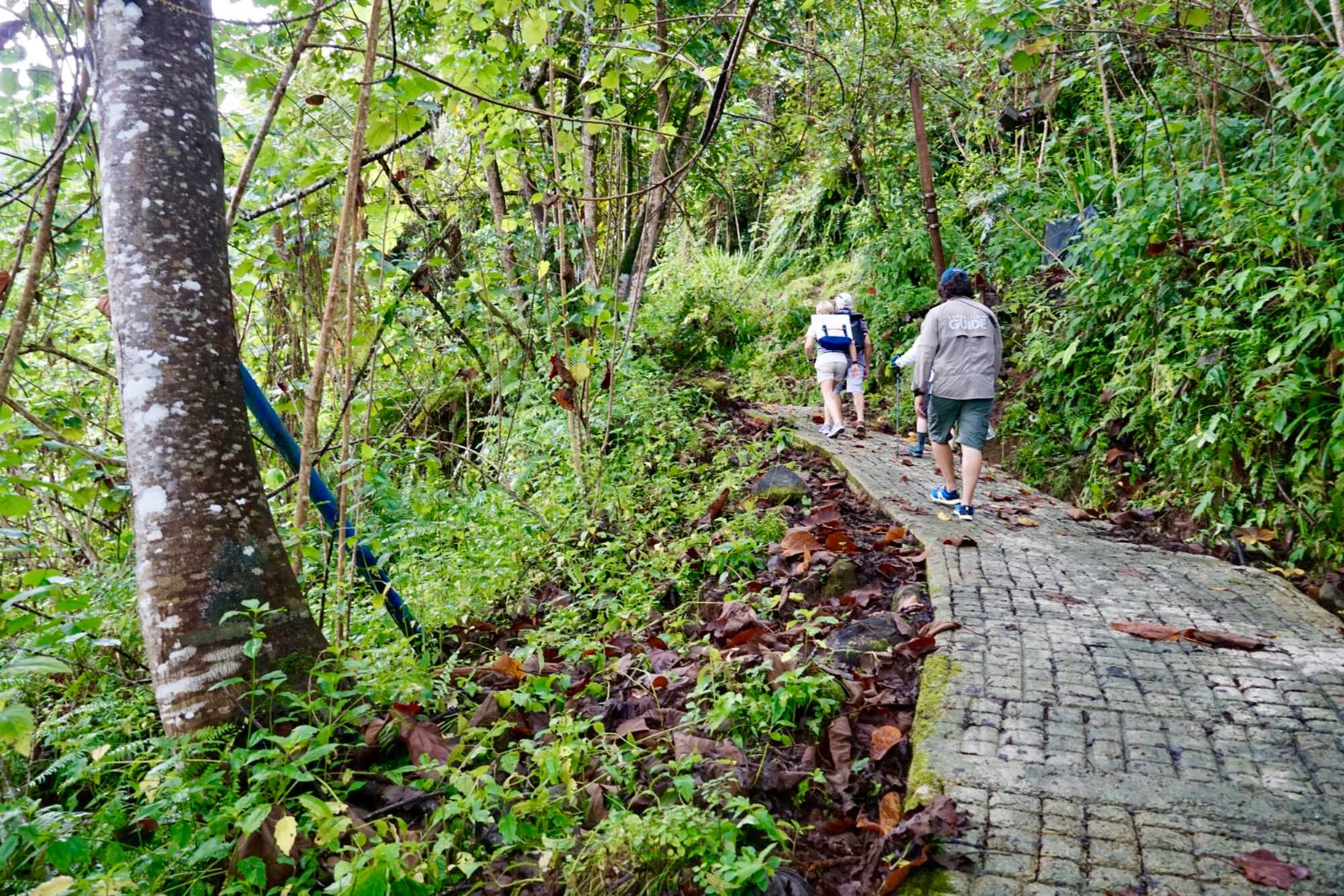 Nous sommes par la suite dirigés vers celui qui nous expliquera la montée possible et les conditions et les choses à voir et à faire sur l’île. L’île est si verdoyante et c’est bien normal avec autant de pluie ce qui donne une végétation luxuriante. Une petite rivière nous sépare de ce sentier que nous traversons pieds nus. Par la suite nous débutons notre montée vers le sommet où se trouve la maisonnette des gardes du parc au sommet à 500 mètres de hauteur. C’est vraiment intéressant d’admirer la végétation luxuriante surtout les fougères qui me fascinent. Les nombreux oiseaux sont bien présents mais nous sommes ce matin plus occupés à regarder où nous posons nos pieds car le sentier de la randonnée est assez difficile. Mais comme on peut rebrousser chemin cela devient un choix de monter au sommet ou non.