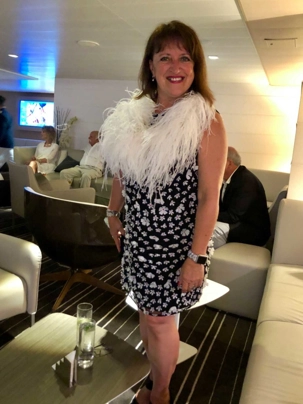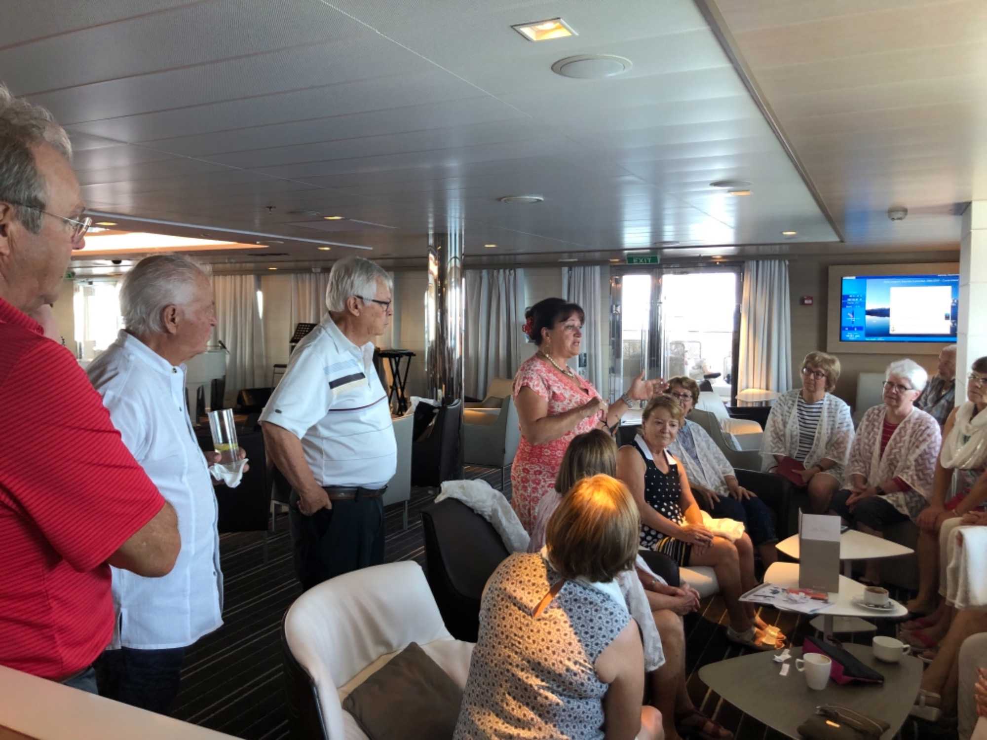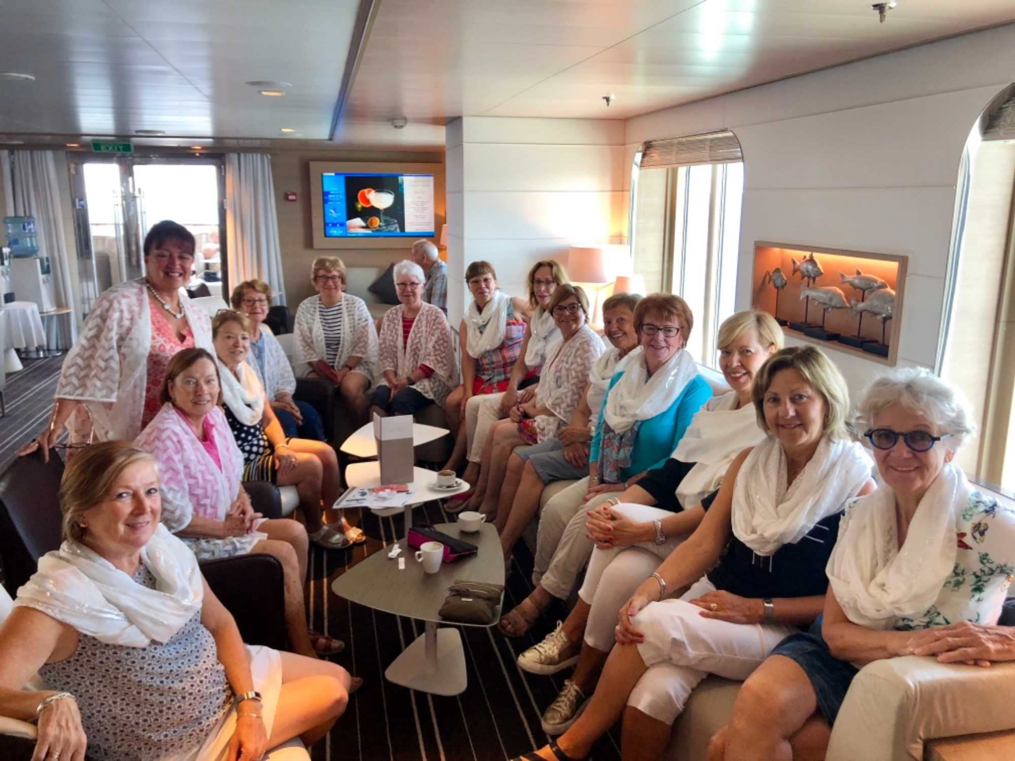 Par la suite, je donne rendez-vous à mes voyageurs au pont 3 dans le grand salon, plutôt juste mes femmes du voyage. Ce soir, nous sommes conviées à un souper des membres d’équipage et c’est toujours sous le thème, soirée en blanc. J’avais ce défi dans la planification d’un voyage surprise de ne rien dire d’une soirée en blanc car au moins 8 voyageurs de mon groupe ont déjà navigué sur Ponant et auraient peut-être fait des associations. J’ai donc pris l’initiative, aidée de Louise Gobeil et de mes sœurs Sophie et Martine, de leur faire faire les boutiques à la recherche de châles, foulards ou pachminas blancs. Donc ce matin, lors d’un tirage elles ont choisi un de ces articles pour compléter leur tenue de la soirée en blanc. Ce fût bien apprécié et ce sera amusant de voir les photos de nos dames.