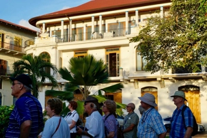 Un nouveau trajet de 20 minutes jusqu'au quartier colonial, également connu sous le nom de « Casco Antiguo », fondé en 1673 par des colons français. Au cours des deux siècles qui suivirent, la ville connut de nombreux changements. Nous avons pu retracer ces influences à travers les évolutions architecturales, qui offrent un élégant mélange de styles français, espagnol et italien. Les ruines des églises et des couvents, les palais coloniaux, les ponts et les bâtiments militaires témoignent du riche passé de cette cité. C’est vraiment très joli la ville coloniale de Panama. Ses balcons fleuris en fer forgé sont vraiment magnifiques. Il y règne une atmosphère spéciale et c’était bien intéressant d’y déambuler tous ensemble surtout avec nos audio-guides. Je ne pourrais plus m’en passer de mon système qui aide tant les gens qui aiment prendre des photos et admirer sans pour autant devoir se tenir tout à côté du guide.