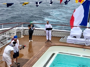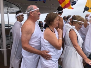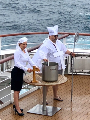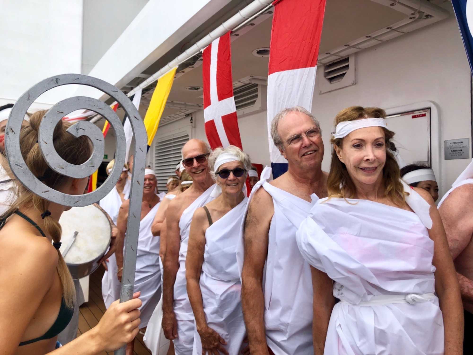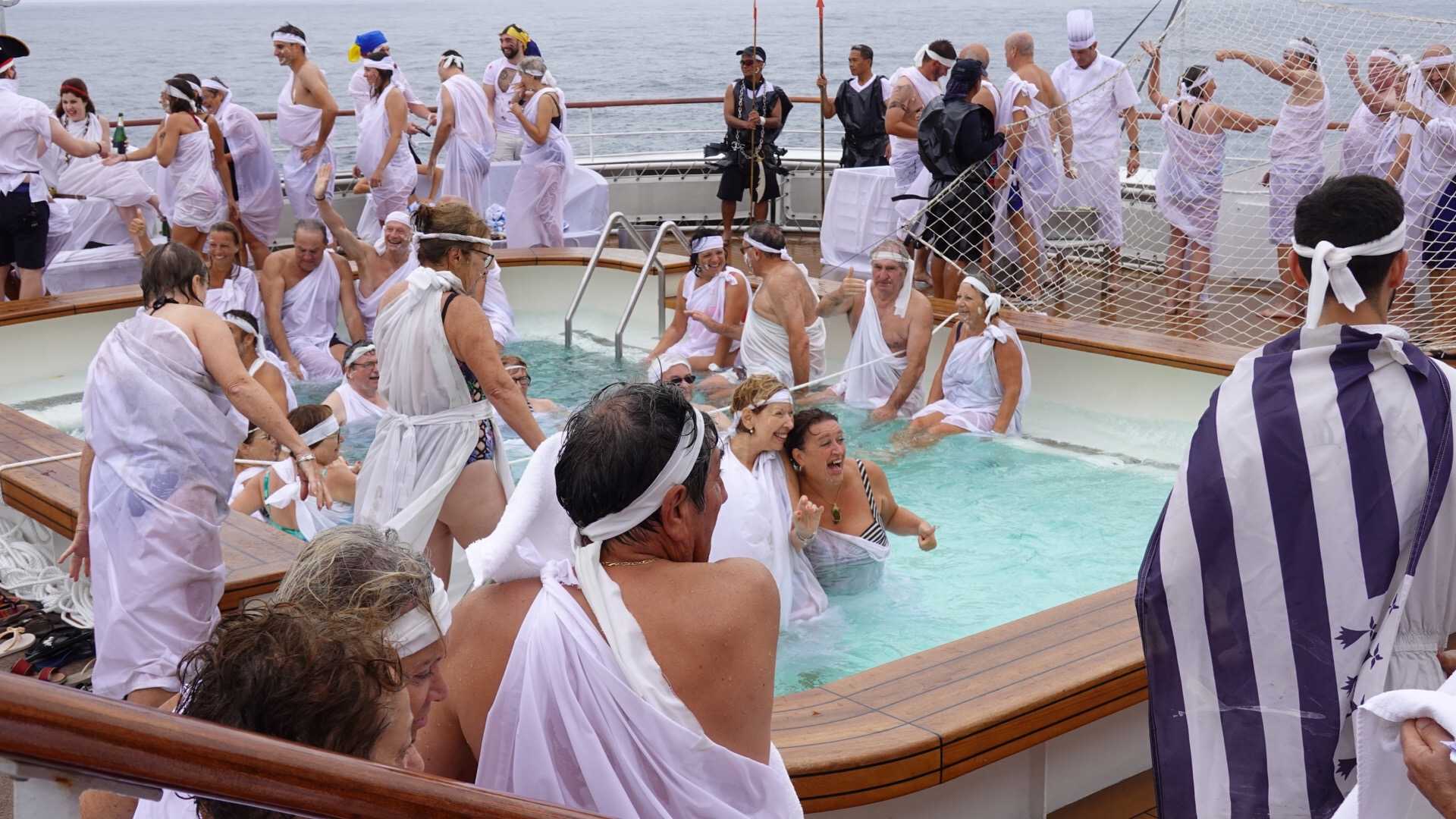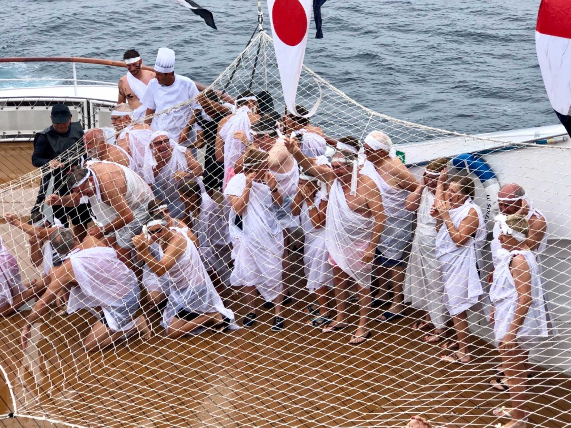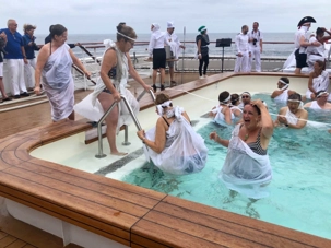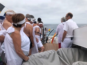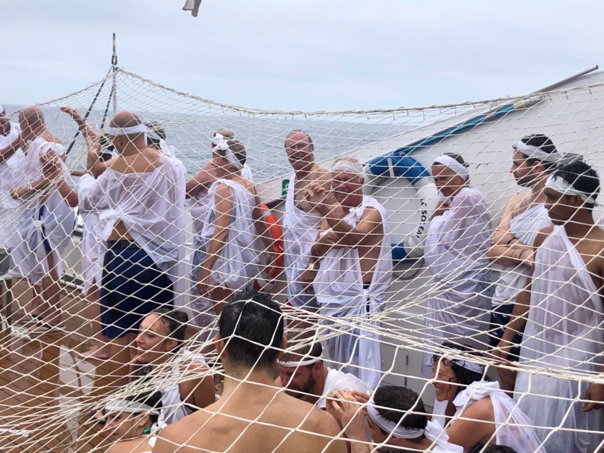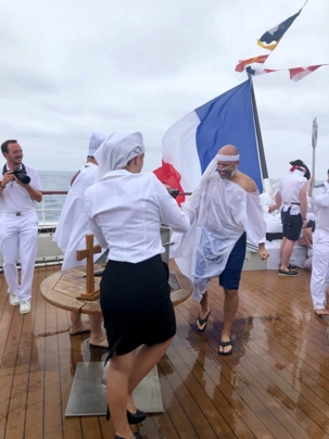 Ce matin, nous sommes invités pour ceux qui n’ont pas traversé la ligne de l’Équateur à participer à une cérémonie en mer pour marquer ce passage. Ce fût bien amusant premièrement de se vêtir tout de blanc et de se faire maquiller pour marquer ce passage de l’Équateur. L’équipage avait planifié un genre de comédie où Neptune, entouré de personnages de la mer, décidait si nous pouvions traverser le cercle de l’Équateur. Nous devions jouer le jeu ce qu’un bon nombre de mes voyageurs ont décidé de faire. C’était bien monté malgré quelques petits détails qui auraient pu se faire autrement mais nous nous sommes tout de même amusés et les photos vous amuseront à coup sûr. Dommage que la chaleur ne fût pas tout à fait là…. Car c’était un peu frais pour recevoir la foudre de Neptune….