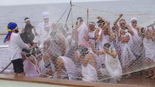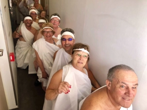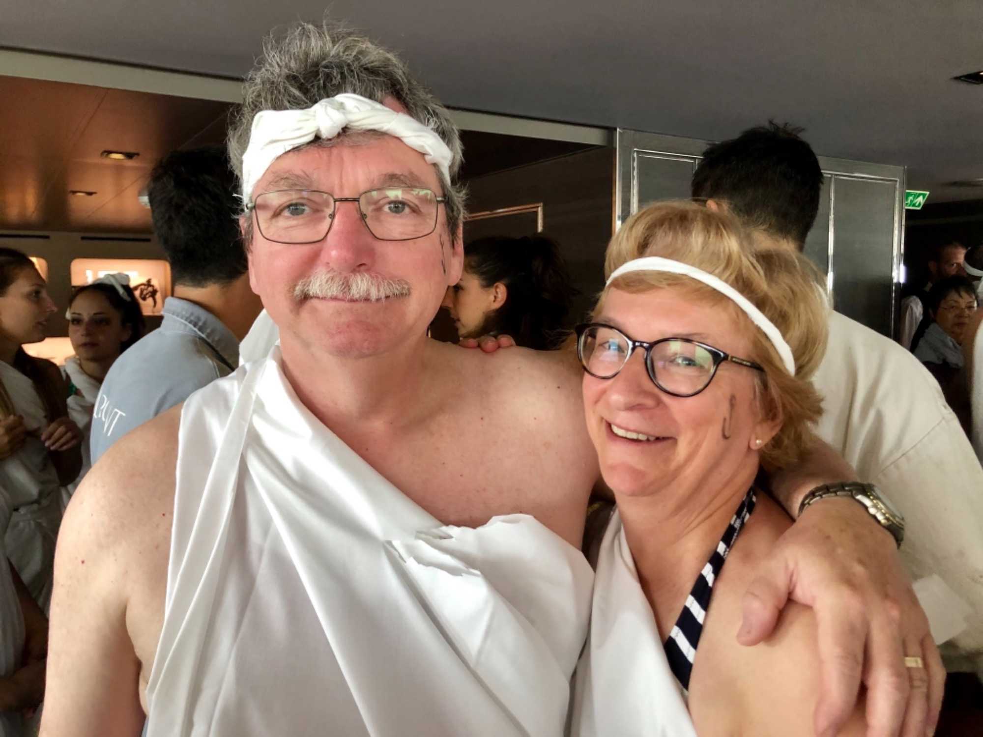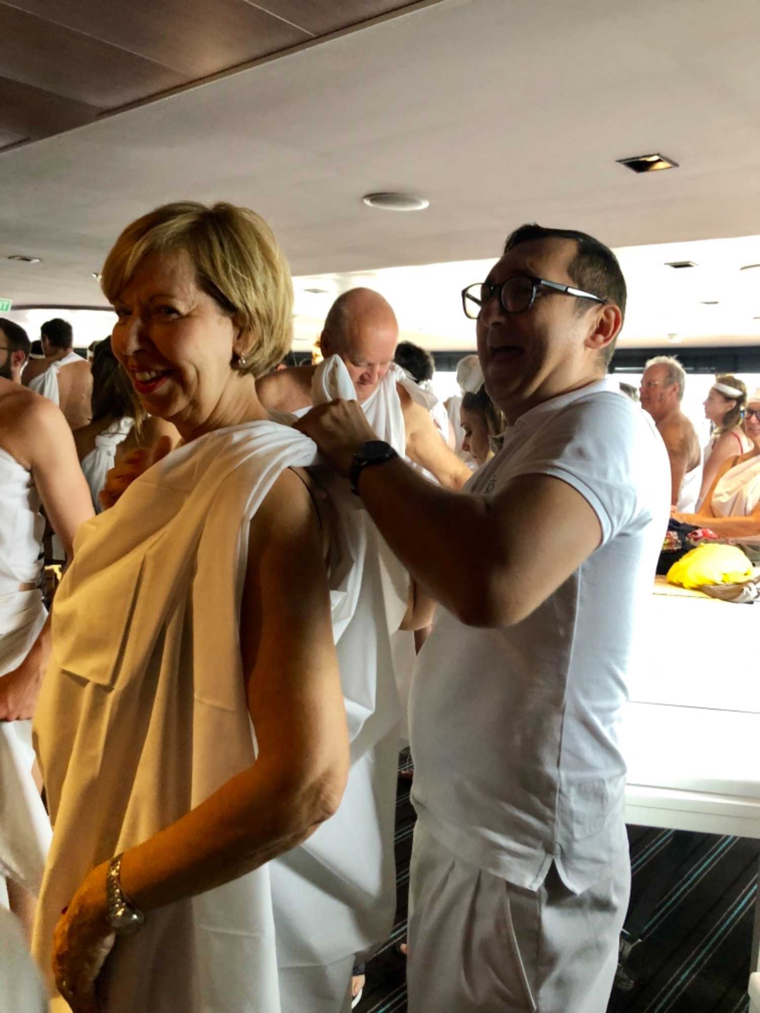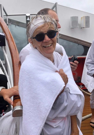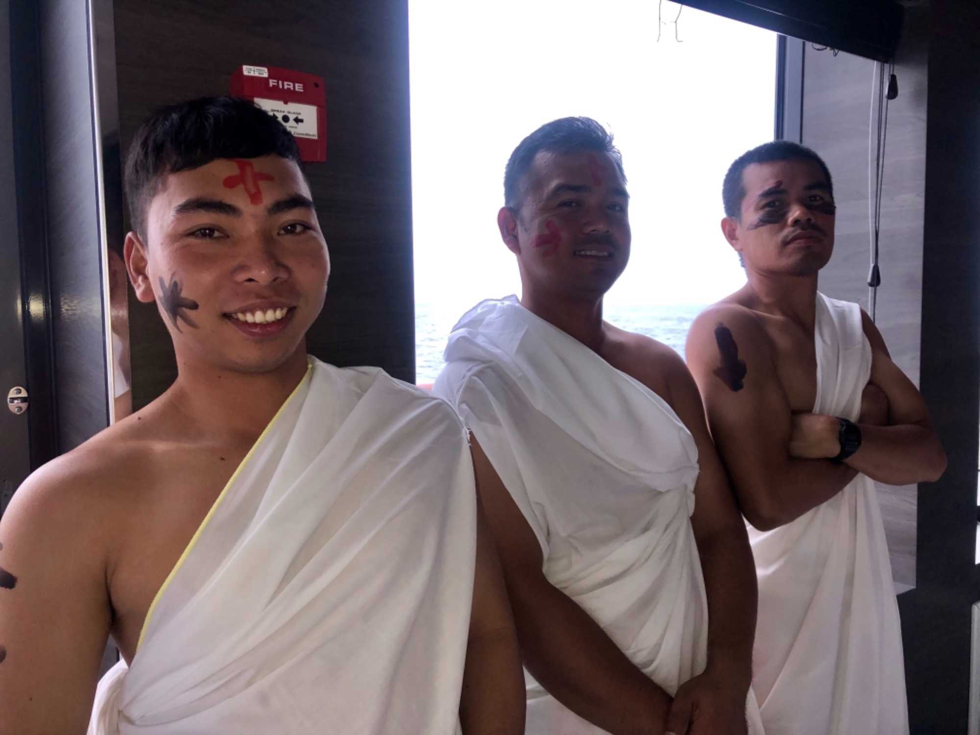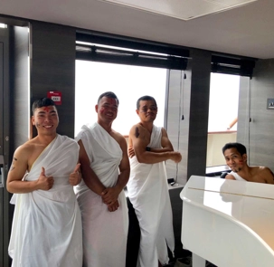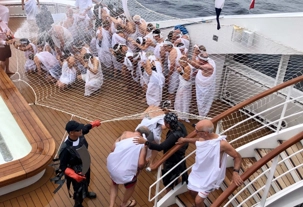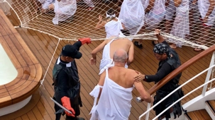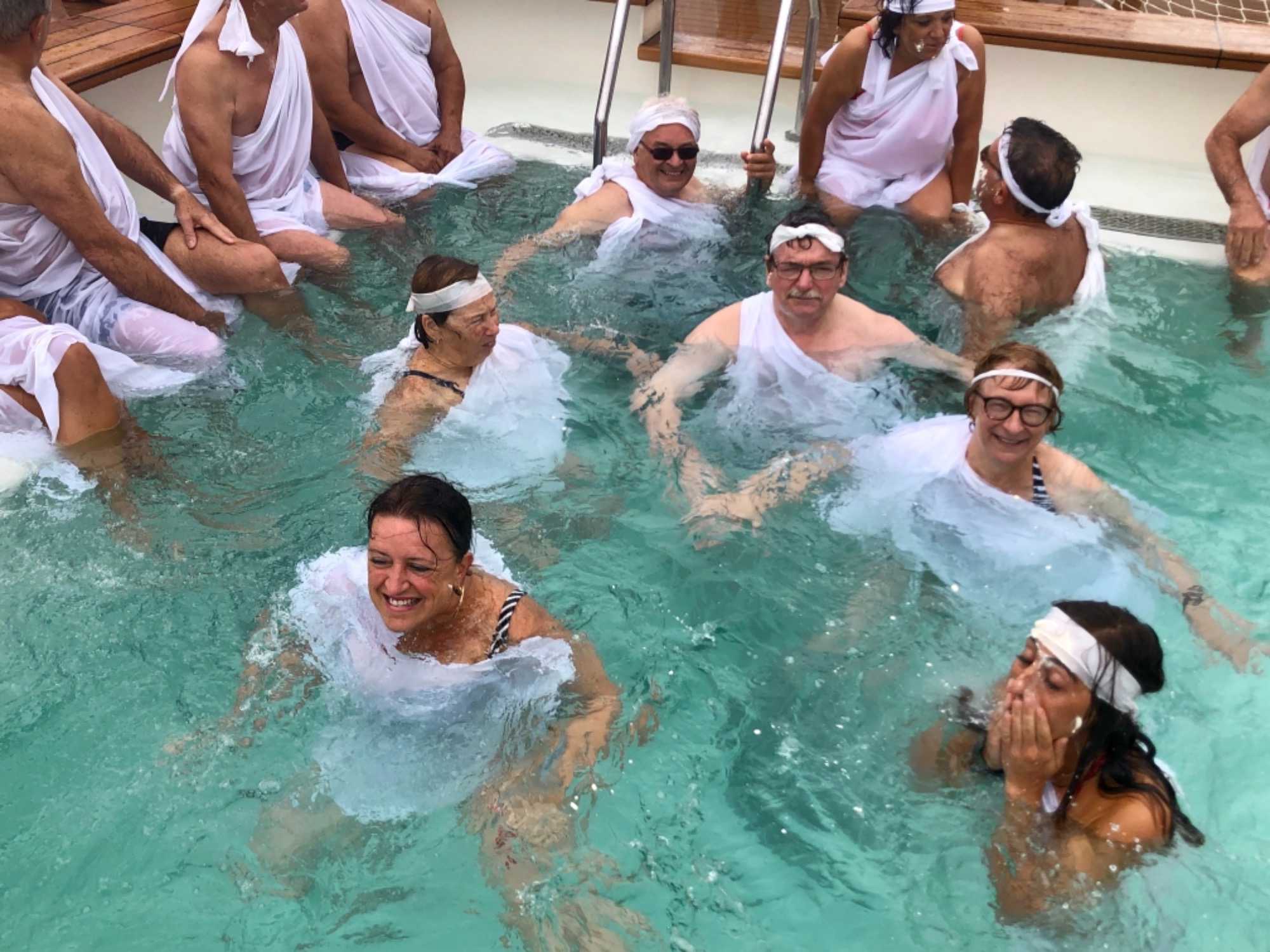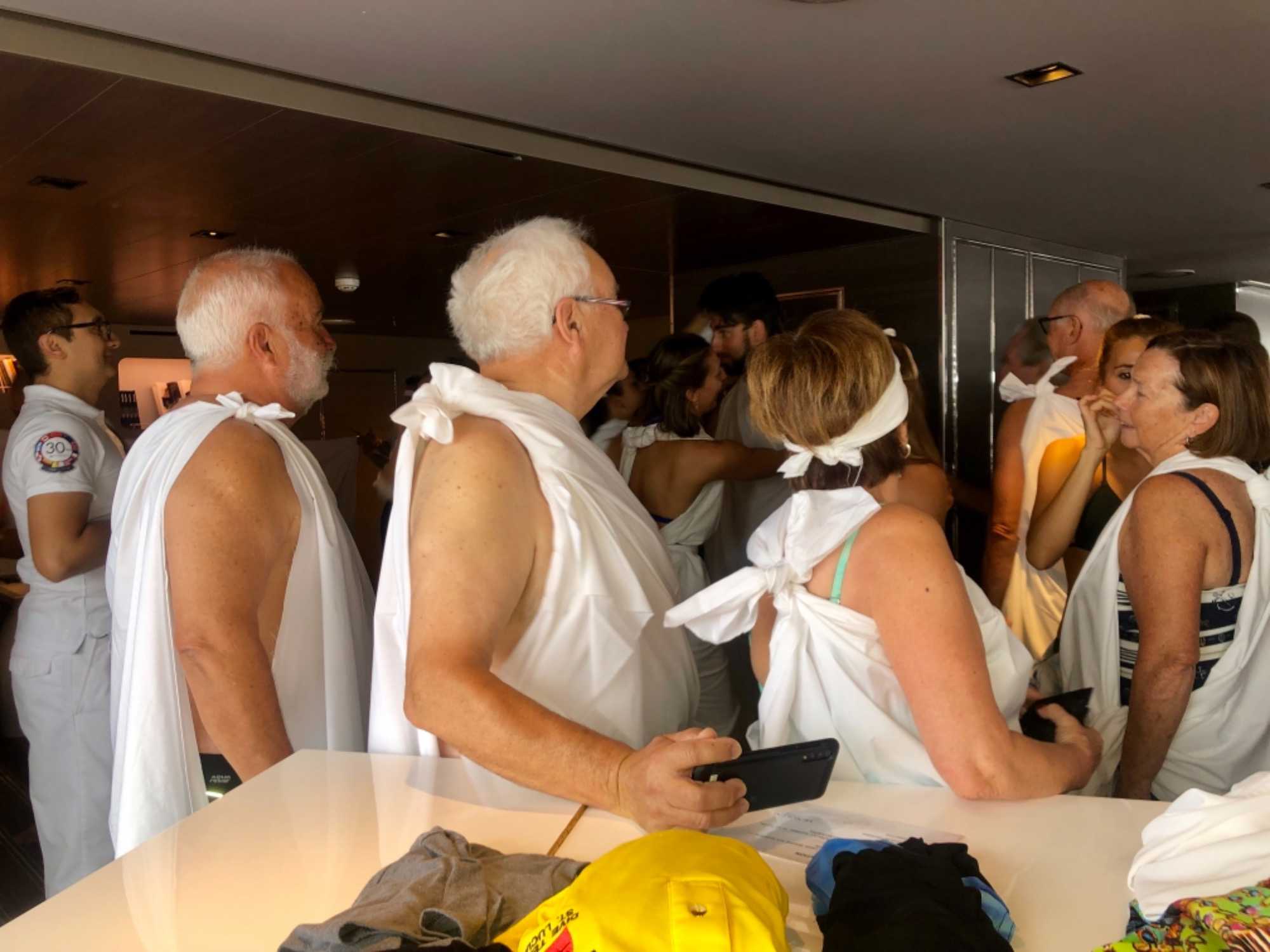 Ce matin, nous sommes invités pour ceux qui n’ont pas traversé la ligne de l’Équateur à participer à une cérémonie en mer pour marquer ce passage. Ce fût bien amusant premièrement de se vêtir tout de blanc et de se faire maquiller pour marquer ce passage de l’Équateur. L’équipage avait planifié un genre de comédie où Neptune, entouré de personnages de la mer, décidait si nous pouvions traverser le cercle de l’Équateur. Nous devions jouer le jeu ce qu’un bon nombre de mes voyageurs ont décidé de faire. C’était bien monté malgré quelques petits détails qui auraient pu se faire autrement mais nous nous sommes tout de même amusés et les photos vous amuseront à coup sûr. Dommage que la chaleur ne fût pas tout à fait là…. Car c’était un peu frais pour recevoir la foudre de Neptune….