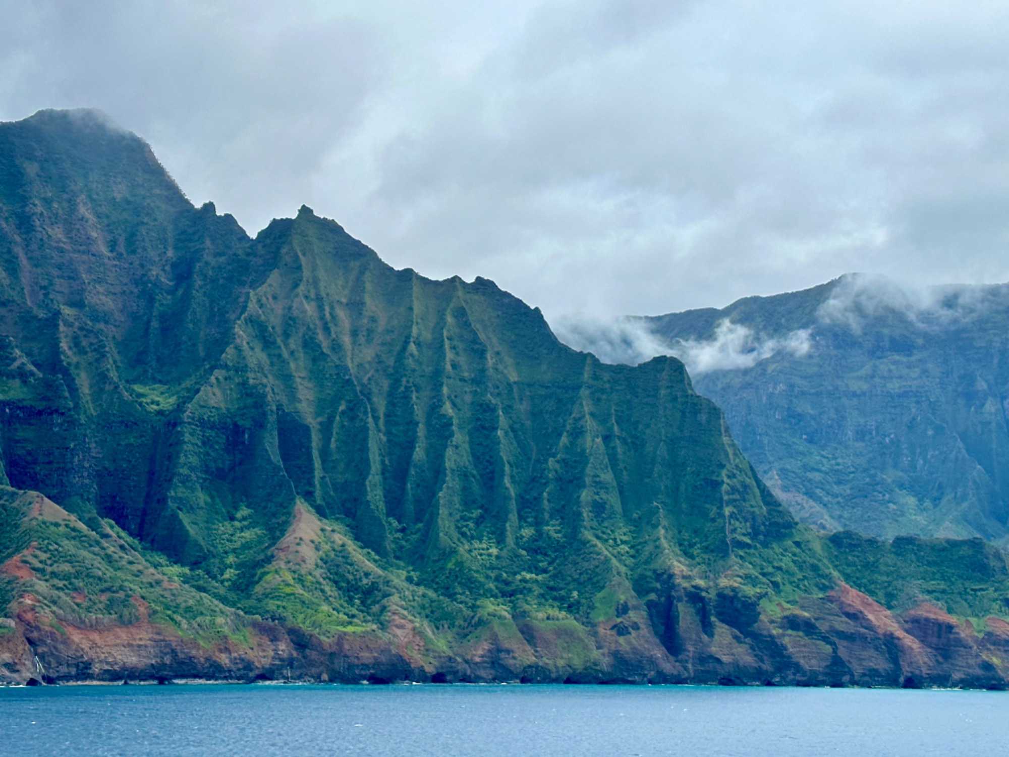 Après cette superbe visite nous sommes revenus pour le lunch à bord et voir le navire quitter l’île. La surprise du capitaine fût de longer une partie spectaculaire de l’île en fin d’après-midi pour faire de magnifiques photos de ces montagnes qui se jettent dans la mer. Comme j’ai eu le bonheur de visiter avec mon groupe Polynésie les îles Marquises, je retrouvais les mêmes beautés naturelles dans ces spectaculaires montagnes de l’Ile de Kauai.