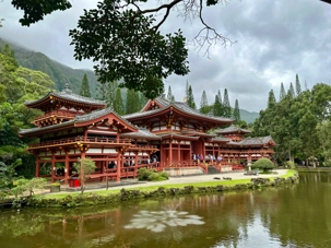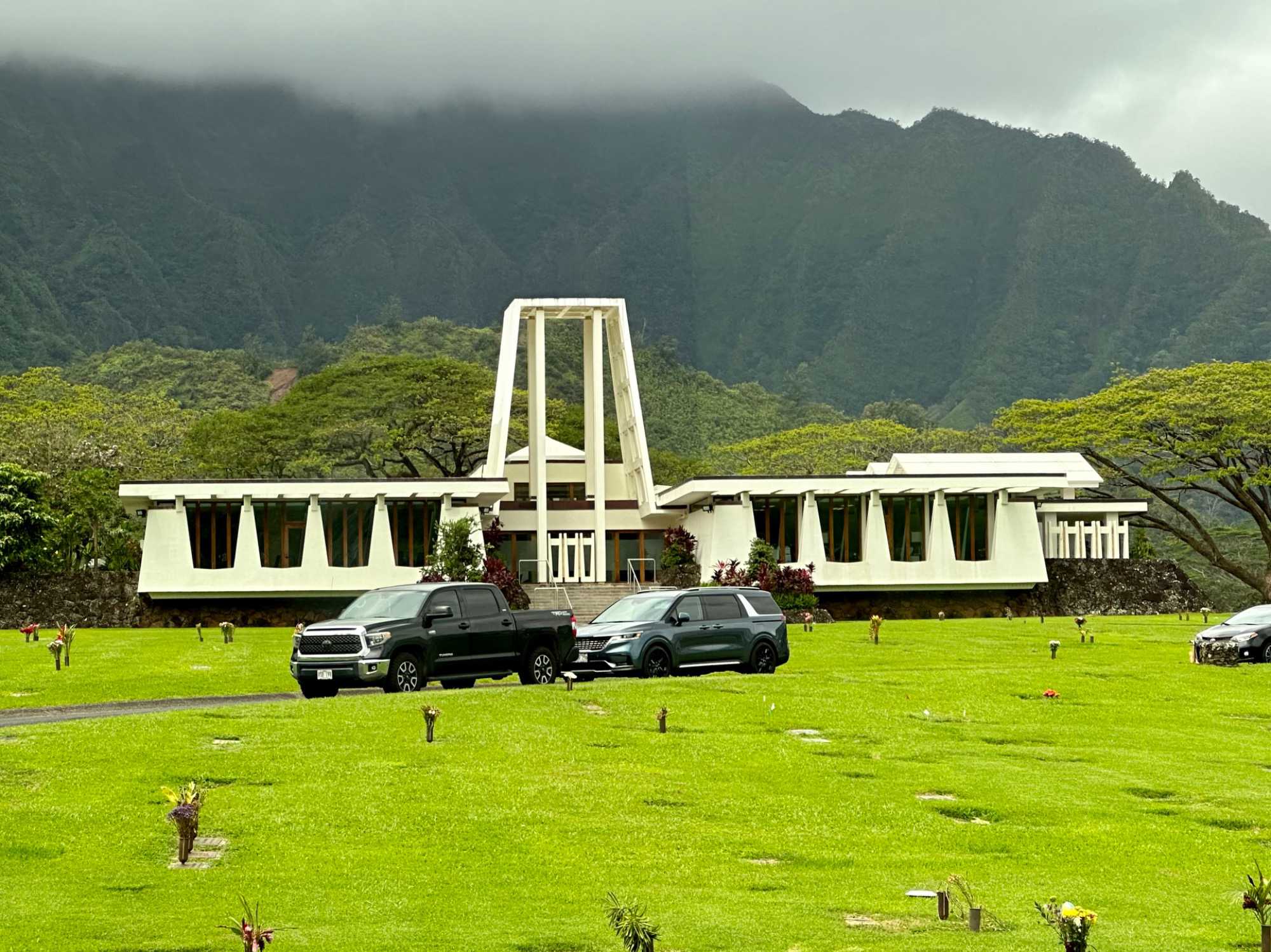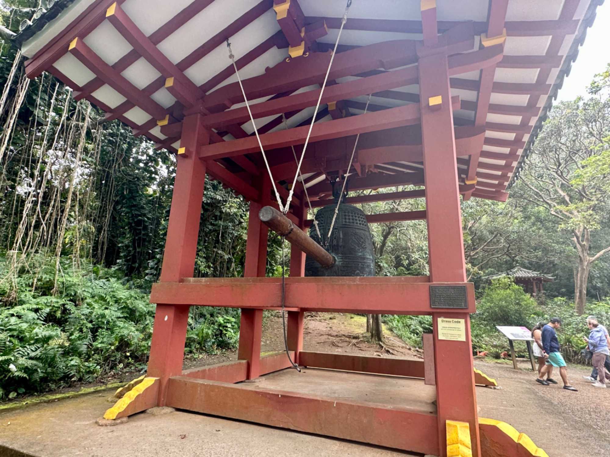 Un court trajet nous emmène au temple bouddhiste de Byodo-In, dans les montagnes Ko’olau. Une balade et on admire les bâtiments du temple de style japonais, une statue dorée de Bouddha de 3 mètres de haut et la Cloche de la Paix; on peut faire sonner la cloche pour nous attirer bonheur et longue vie. Ce site est exceptionnel et comme nous étions samedi plusieurs habitants viennent fleurir la tombe de leur proches décédés. C'était très touchant de voir toutes ces fleurs et ce va-et-vient de personnes qui vont visiter leurs morts.