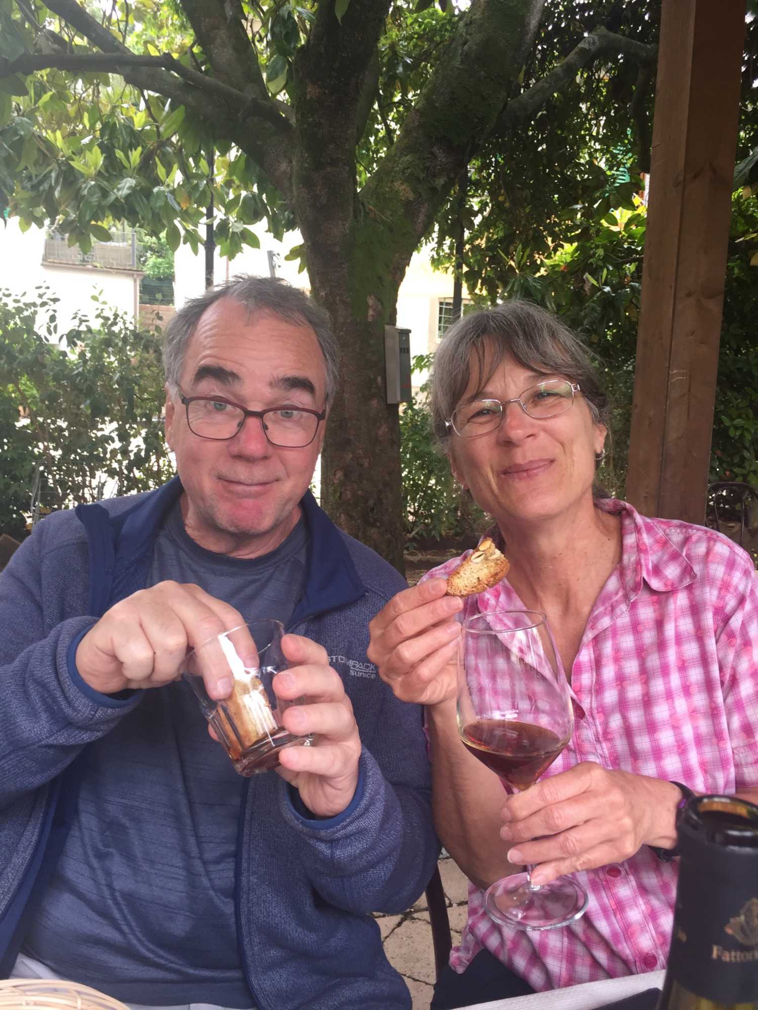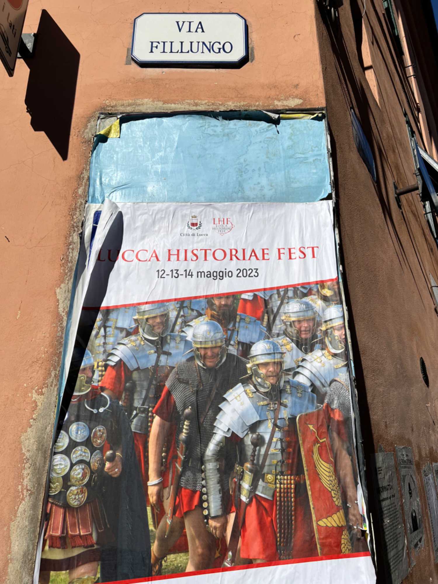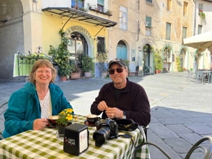 Ce matin nous partons vers Lucques (ou Lucca en italien). Ce n’est pas très loin de notre hôtel. On fait une belle promenade dans la ville jusqu’à la Piazza del Mercato. Il y avait autrefois un amphithéâtre romain à cet endroit, mais la plupart des pierres ont été utilisées pour construire les églises et les palais de Lucca. Cependant, la place a conservé sa forme d’arène. Fernando nous offre une boisson à une terrasse. Un « souvenir heureux » comme dans la chanson que nous chante René.