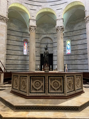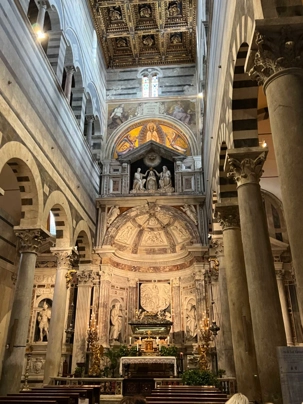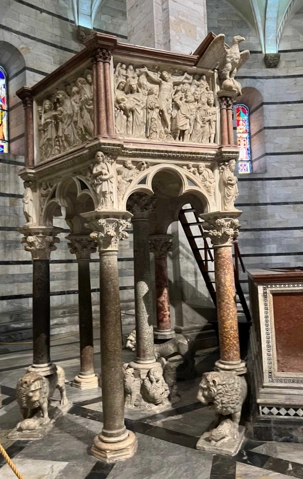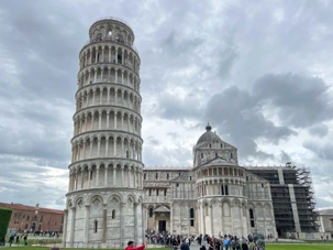 Bon, il faut repartir, nous avons une autre visite à faire. On se rend à Pise qui n’est heureusement pas très loin. Fernando pense encore à ses voyageurs qui ont un peu les jambes molles et il nous réserve un petit train pour nous rendre près de la fameuse tour. Il n’y a pas que la Tour de Pise à voir! Un magnifique ensemble de beaux bâtiments blancs nous attend. Nous commençons par visiter l’église, suivi du baptistère. Nous avons du temps libre par la suite pour faire le tour de la tour! Alors que nous revenons vers le petit train pour retourner au bus, nous avons l’orage qui éclate! Un bon 10 minutes de pluie forte. Puis c’est fini! Nous reprenons le petit train, et le bus puis nous retournons à l’hôtel.