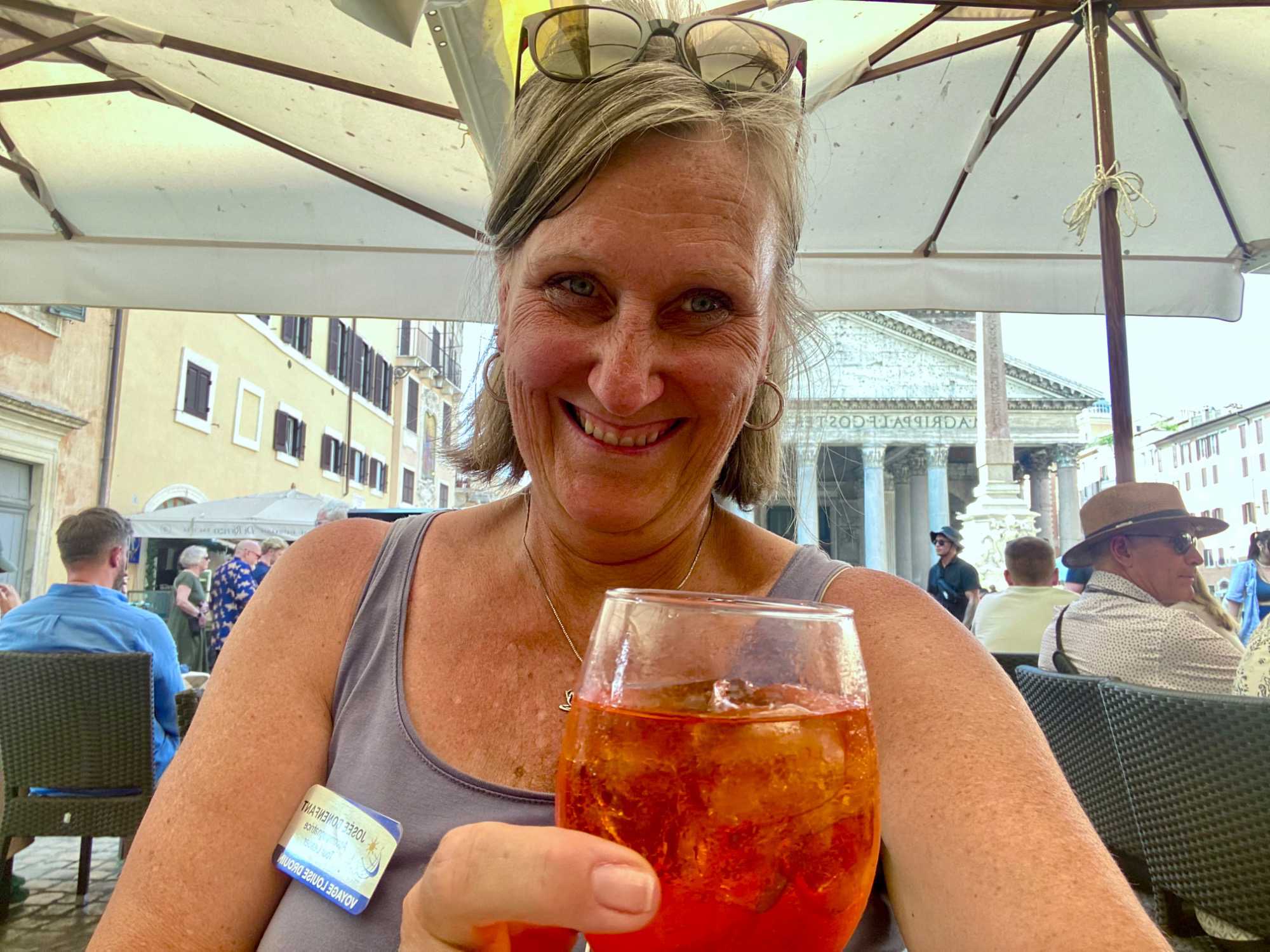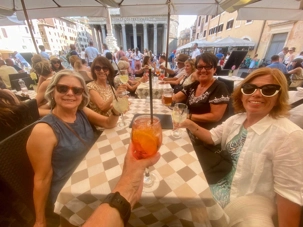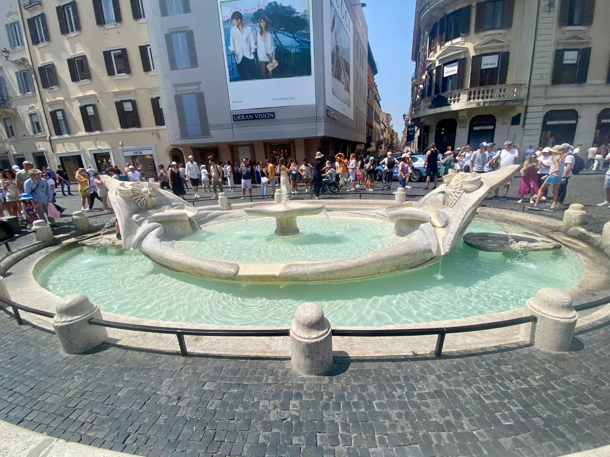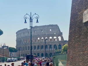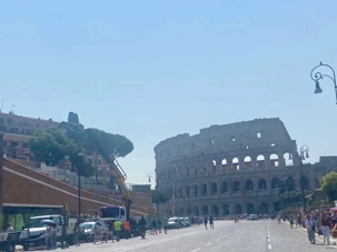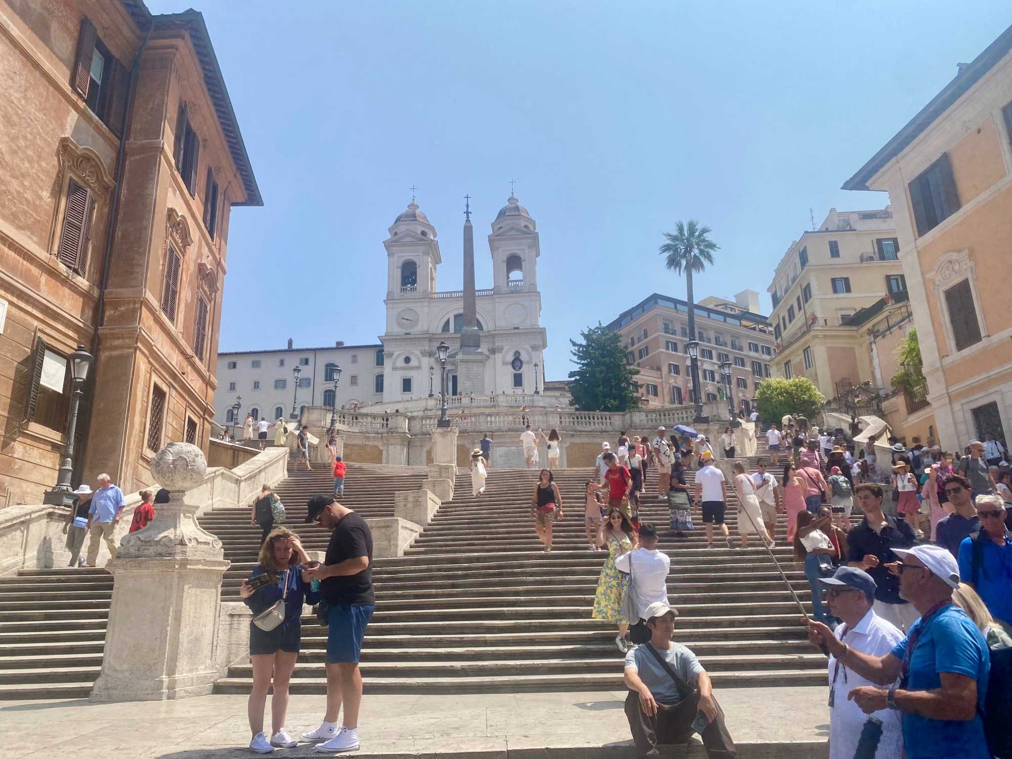 Nous sommes conduits près du Colosseum pour descendre et faire la rencontre de notre guide local Rosa. Elle nous accompagne pour une visite pédestre de deux heures à travers la ville des visites extérieures le Colosseum, Forum Romain, Campitelli, le monument extérieur de Vittoriano Emanuele I, la fontaine de Trévi. C’est inondé de monde mais cela ne nous empêche pas de déguster une gelato., Piazza Santi Apostoli, Piazza Mignanelli, Piazza de Spagna, nous avons tous monté les 135 marches de l'escalier, Aline H. a fait jouer la chanson de Rocky, lol!!!), Trinita Dei Monti Piazza Di Spagna, Campo Marzio. Bordée de boutiques de designer et d'antiquaires, cette rue située dans le centre historique de Rome est l'une des adresses préférées des amateurs de shopping) aussi la Place d’Espagne (est l'une des principales places piétonnes touristiques du centre historique de Rome en Italie, située dans le quartier des boutiques de luxe de Rome.
