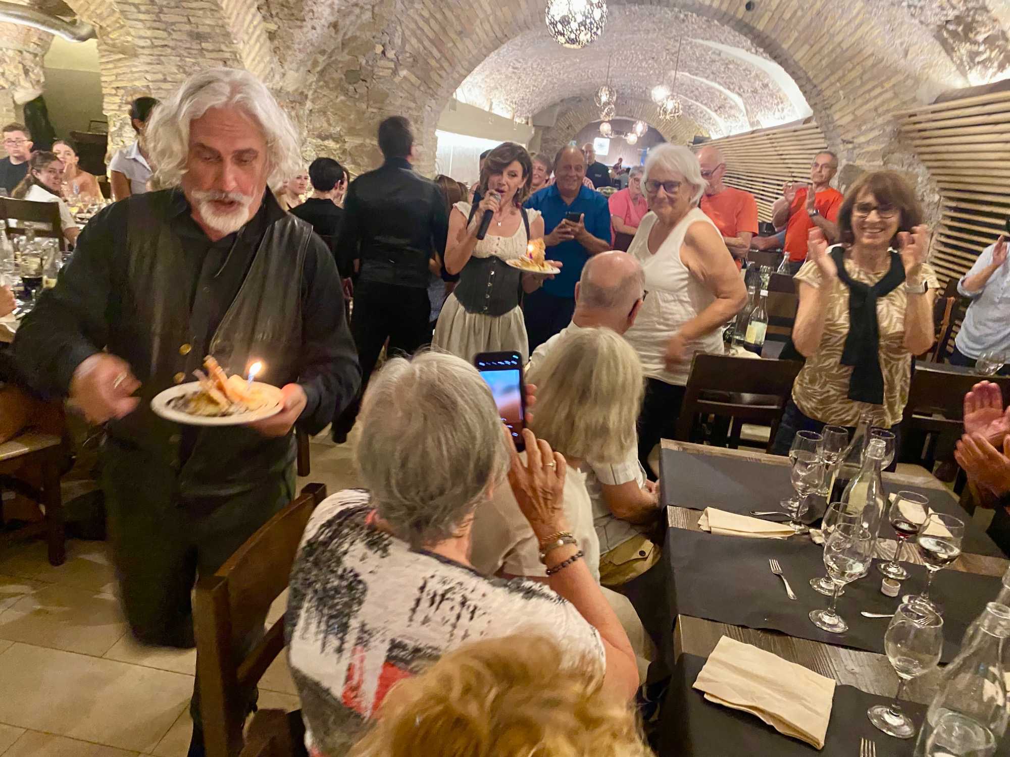 Souper d’adieu avec animation musicale. Ce soir, c’est la fête! Nous soupons dans un merveilleux endroit chez (Le Terme Del Colosea) où de vrais chanteurs d’opéra sérénades autour de nos tables. Claude de la "gelatino" se fait prendre par le barbier. Au moment du dessert, nous avons l'opéra pour les deux anniversaires. Une expérience inoubliable!