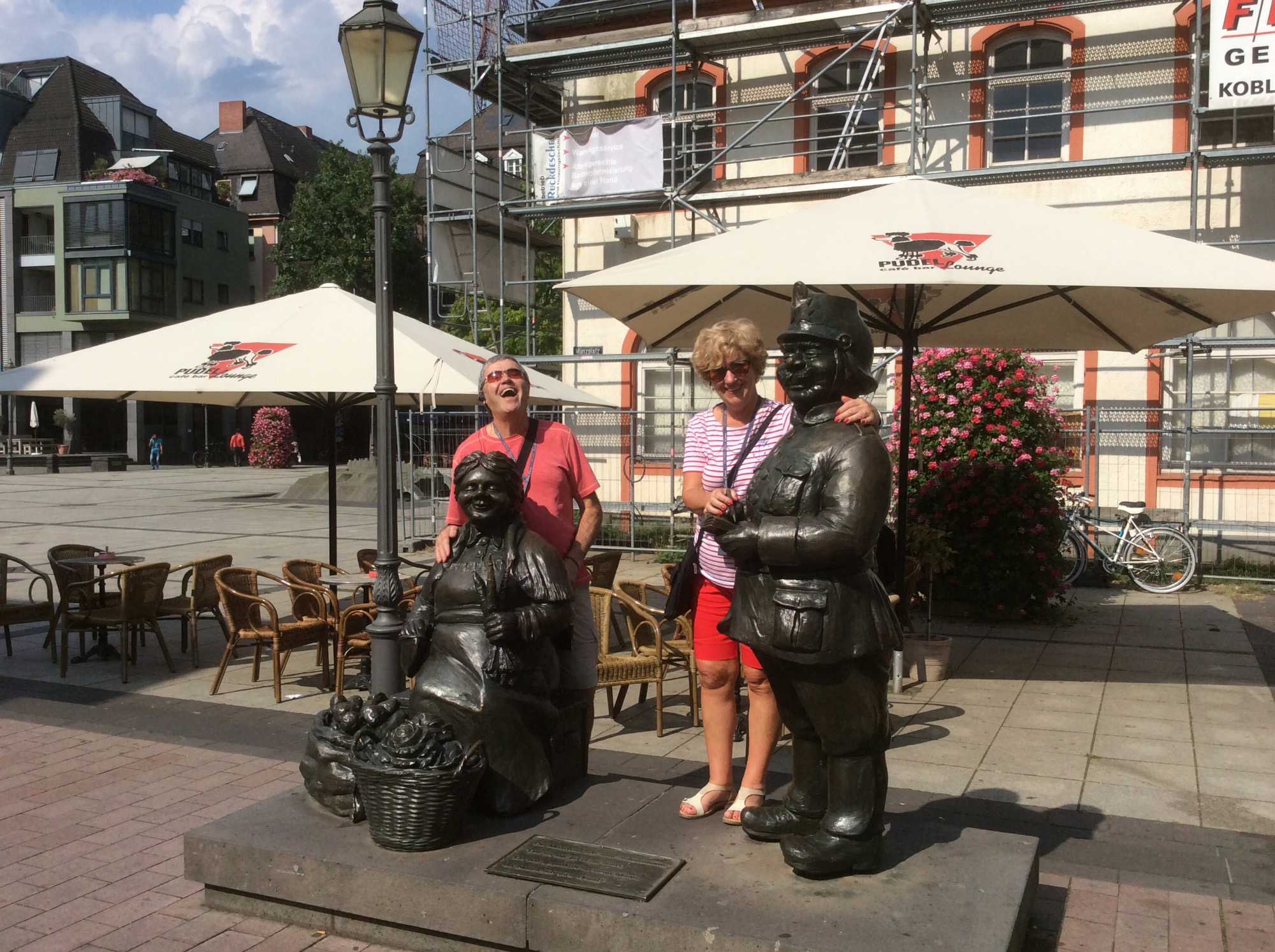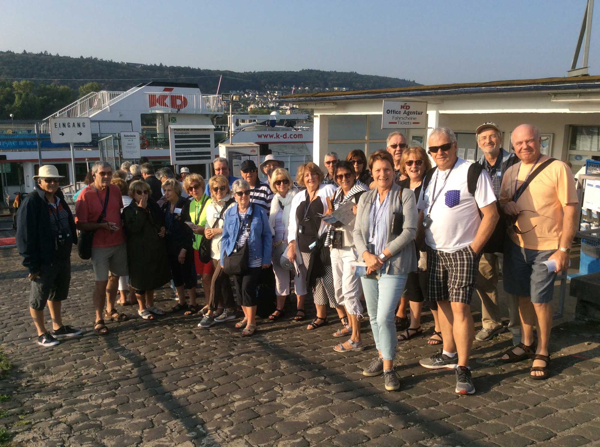 Rassasiés, nous reprenons la route vers la confluence du Rhin et de la Moselle, au « Deutsches Eck » pour la vue impressionnante sur ces deux fleuves et où se situe l'une des plus belles et anciennes villes d'Allemagne : Coblence. Monique, notre guide locale, nous y rejoint pour nous faire apprécier ce joyau. Monique est drôle et très dynamique. Elle nous mène à pied dans les rues de la ville. Fait à noter, Coblence a été détruite à 87% par plus de 41 bombardements aériens lors de la seconde guerre mondiale. Heureusement, la vieille ville a été soigneusement rénovée et reconstruite.