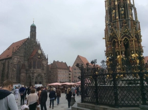 Dès notre arrivée à Nuremberg, nous allons à un restaurant typique pour le repas du midi. Au dîner, on nous sert les saucisses, les Nürnberger Bratwürste, le plat national, avec choucroute et salade de pommes de terre. Le tout accompagné d’une bonne bière ou bien d’un verre de vin de fabrication locale. Un autre plat national est le Lebkuchen, un genre de pain d’épices.