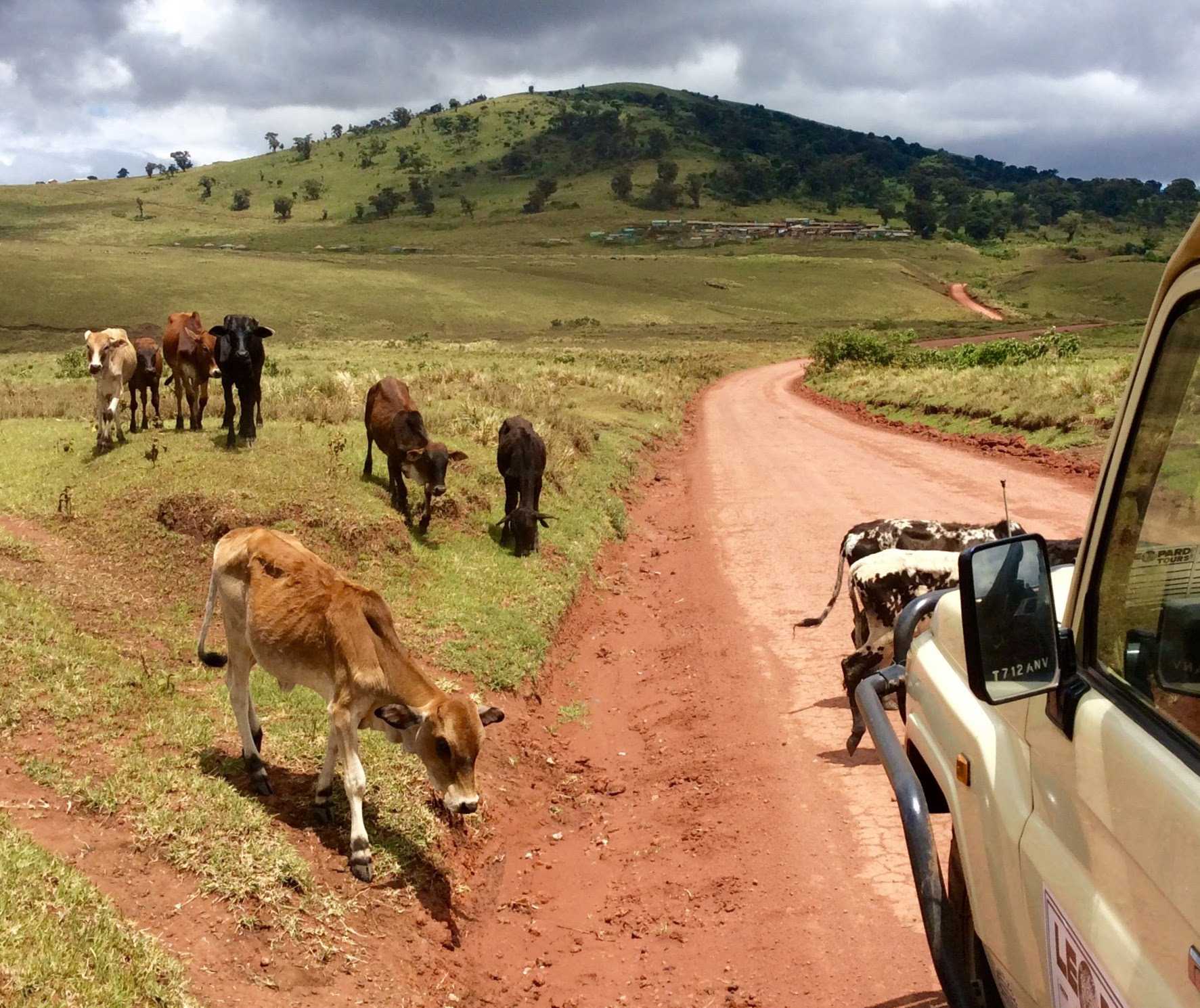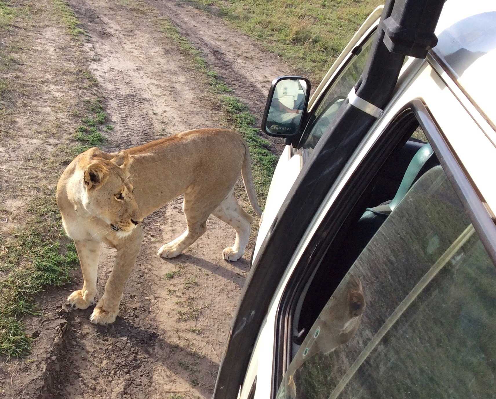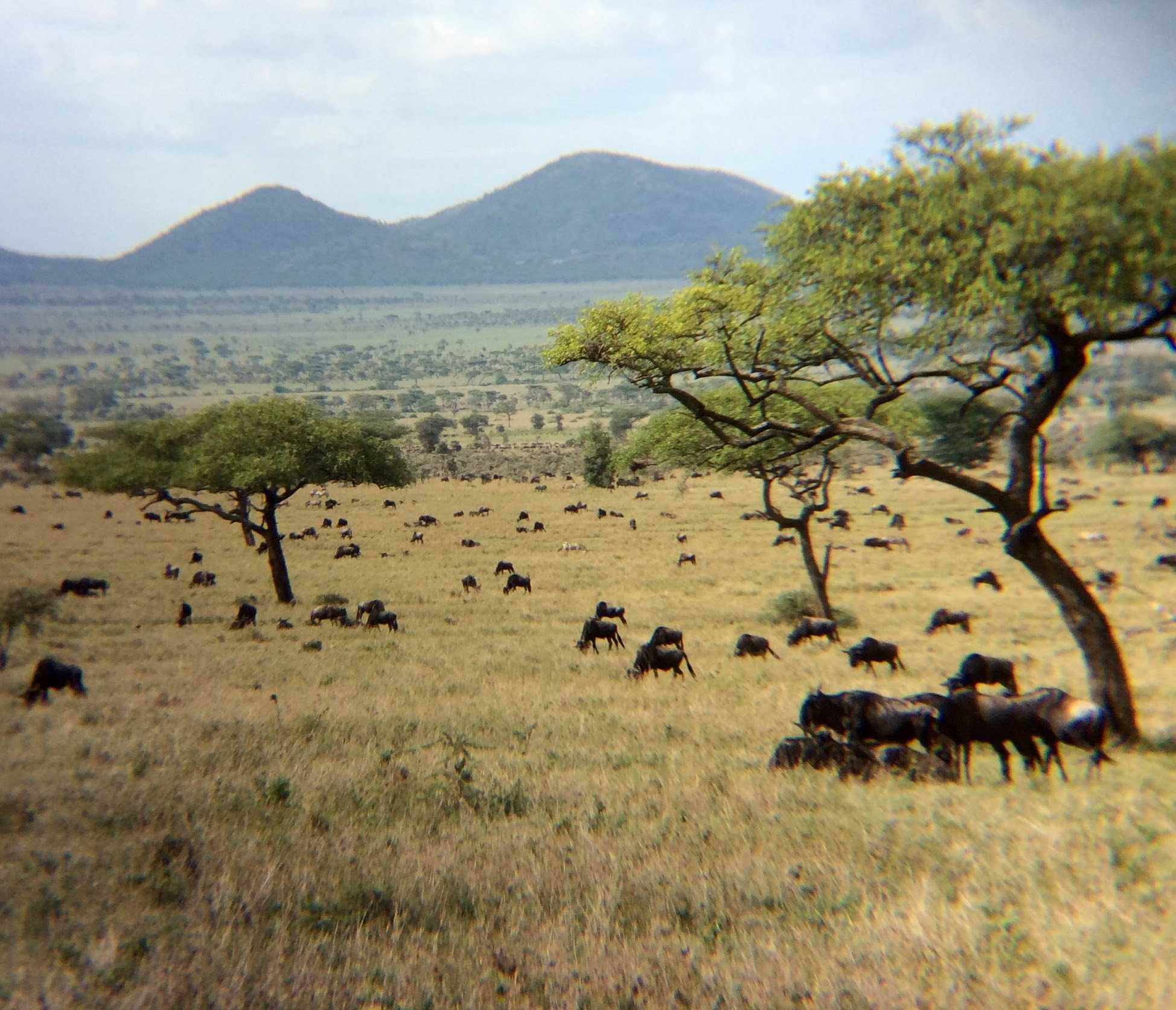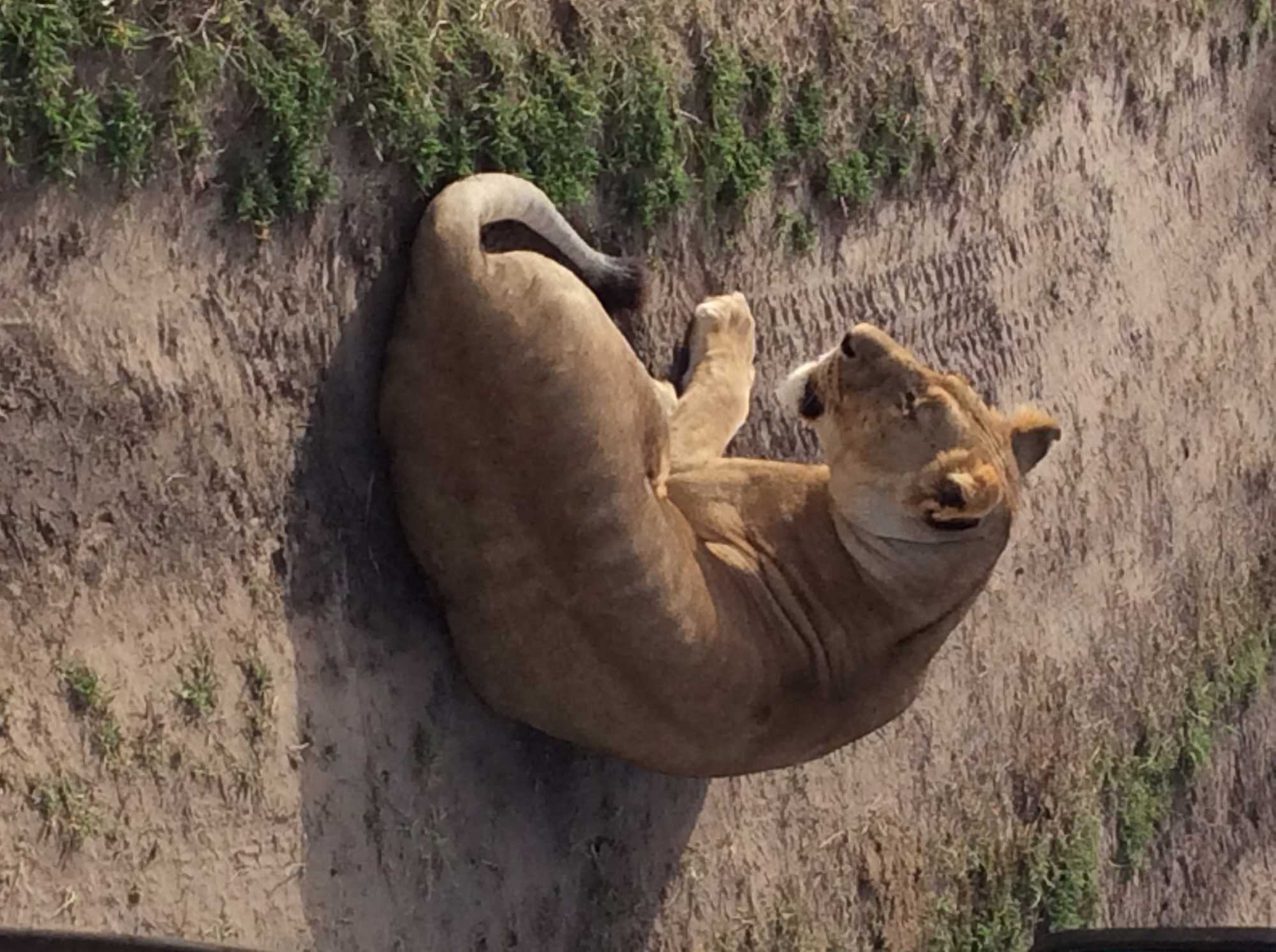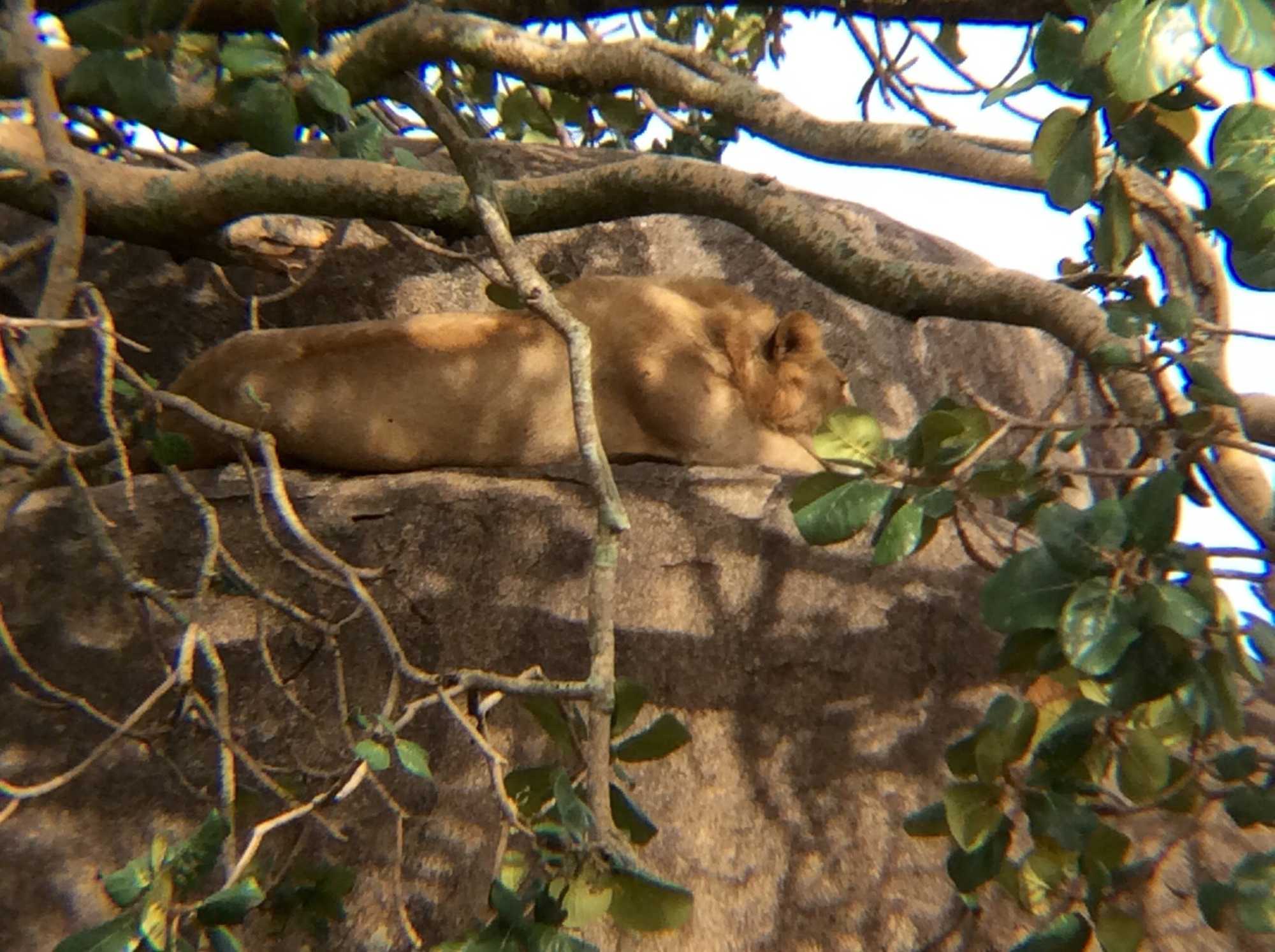 Nous parcourons plusieurs kilomètres, sans trop voir d’animaux, dans le sens qu’on y rencontre des animaux, comme les gazelles, girafes, phacochères, zèbres, quelques gnous…et après quelques heures nous arrivons sur un plan de vue sur la grande migration de gnous et zèbres, ils sont par milliers dans la plaine à brouter calmement. Parfois les zèbres sont couchés sur la piste ou parfois une girafe la traverse devant nous… Toujours à la recherche comme de grands explorateurs, nous faisons le tour des petites collines de roches, on y aperçoit 2 lions mâles qui font la sieste! On contourne la rivière pour arriver dans la baignoire des hippopotames. On y croise des damalisques, des bubales, une tortue, des autruches…