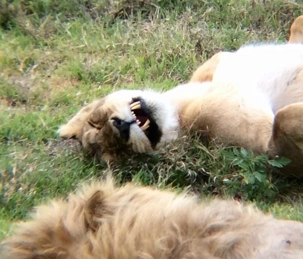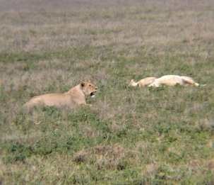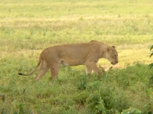 En référence aux pluies de la nuit, la piste est inondée et juteuse de terre boueuse; par chance que nous avons de bons véhicules 4x4! Le ciel se dégage et le soleil se met de la partie! On ne cesse de se dire comment le paysage est joli avec cette plaine entourée de montagnes, c’est absolument magnifique… Que du plaisir pour les yeux! On aperçoit une grande variété d’animaux et d’oiseaux (voir les photos), chacals, des buffles, au loin un rhinocéros à 2 cornes avec un petit bébé, d’innombrables gazelles, phacochères, des éléphants avec de longues défenses, la piscine à hippopotames, autruches… Mais notre grand coup de cœur est le roi de la jungle. Il y a énormément de ces félins ici. On rencontre un lion mâle seul, en balade puis 3 lionnes avec leurs petits qui cherchent à téter… Et le summum, nous devenons témoin d’une scène amoureuse entre un couple. Un film XXX que je me suis permis de mettre sur le site. C’est incroyable de voir les jeux dans l’art de s’accoupler. C’est une série d’accouplements qui se fait sur une période d’une semaine et environ aux 15 minutes. Ils le feront plus d’une centaine de fois. Pour des voyeurs comme nous, dans l’observation du comportement animal; le spectacle s’avère grandiose de pouvoir admirer cela de nos propres yeux. En plus, il y a un autre couple de l’autre coté de la rivière qui s’élance dans des ébats torrides émettant des grognements et rugissements…mais d’une durée record digne de la fameuse expression : se faire une p’tite vite! À vous d’en juger!